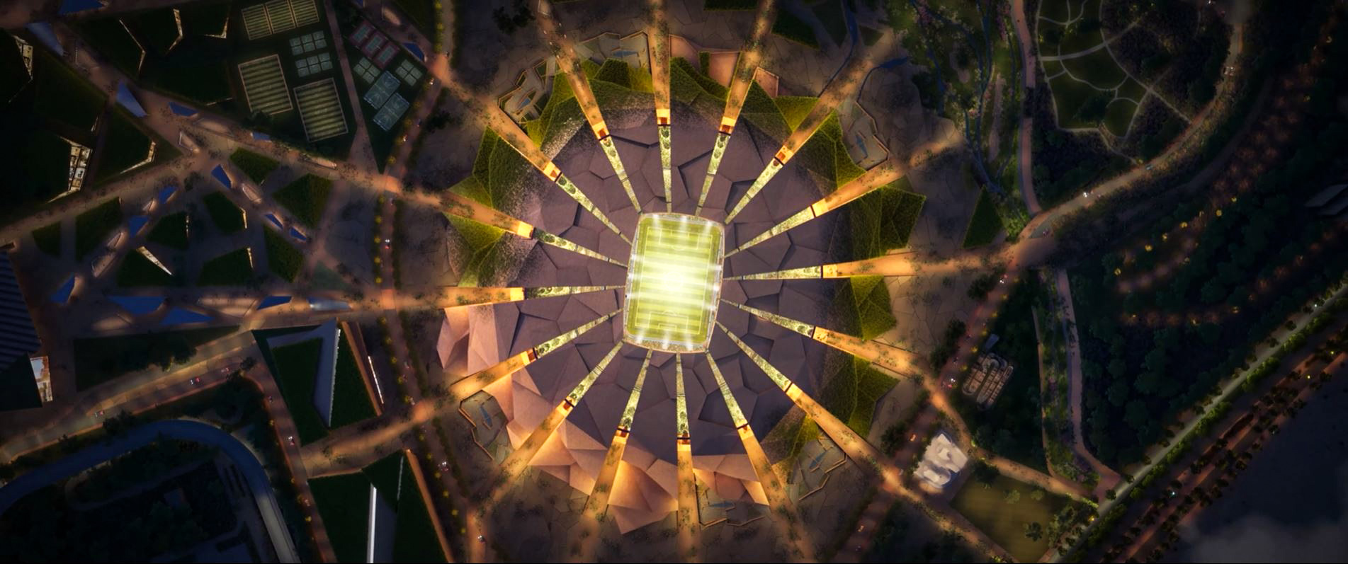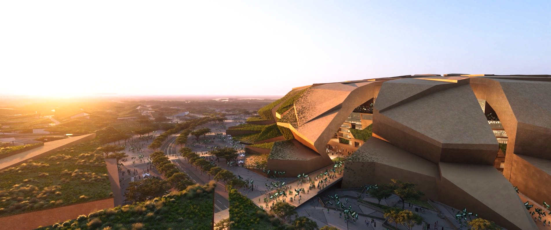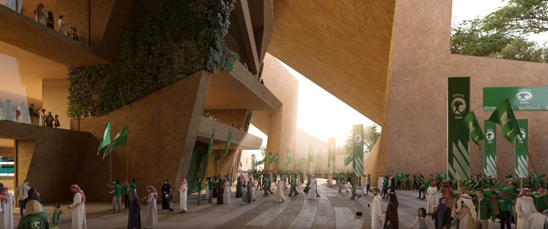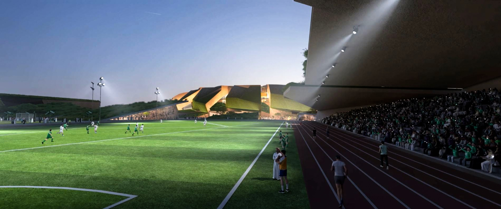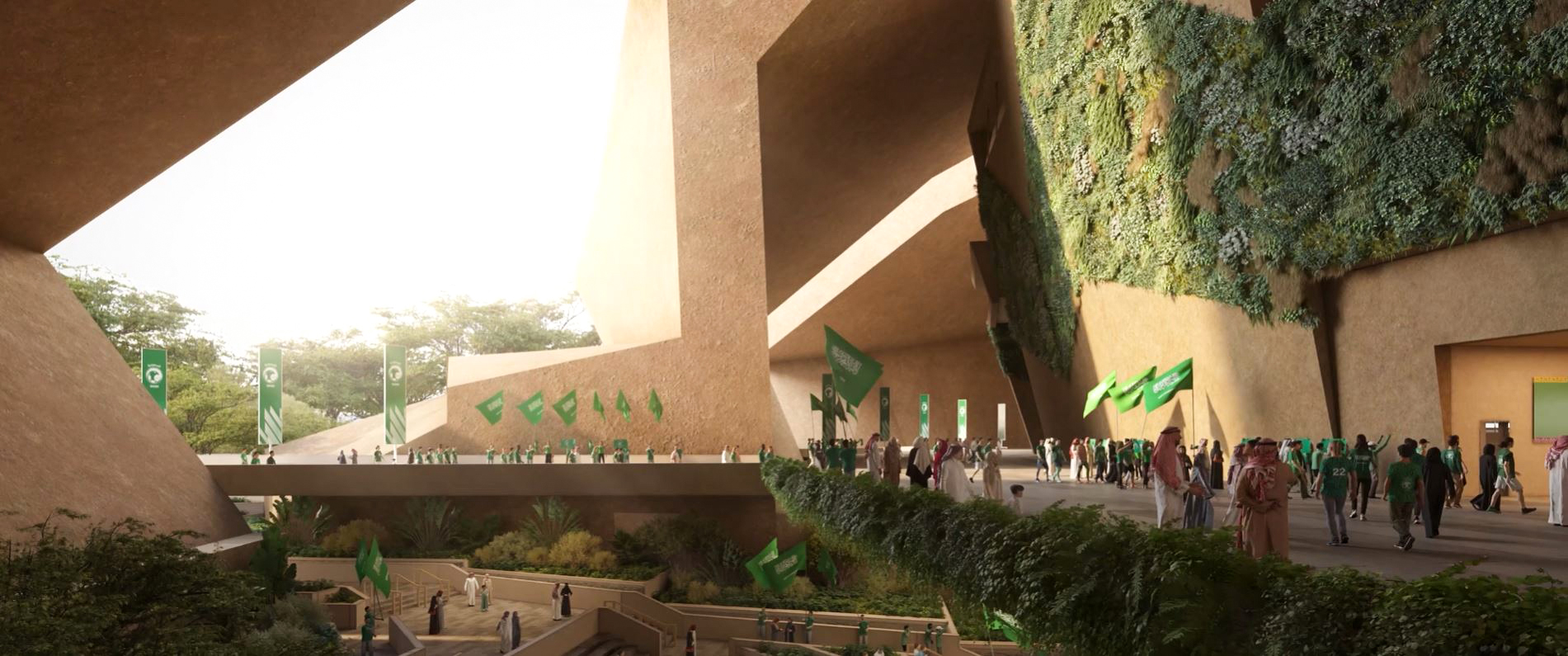 The masterplan design integrates the stadium seamlessly with King Abdulaziz Park, reflecting sustainable building practices and a thoughtful, integrated approach to urban planning. Green walls and roofs link the stadium to surrounding green spaces via a connecting valley.