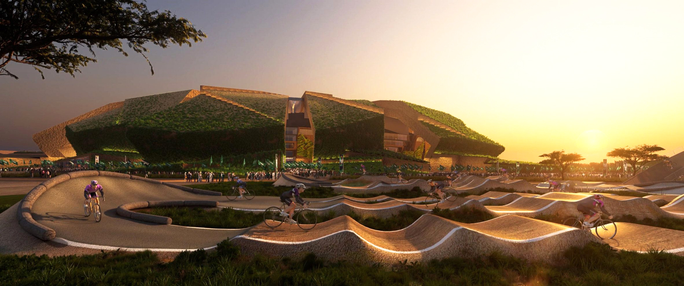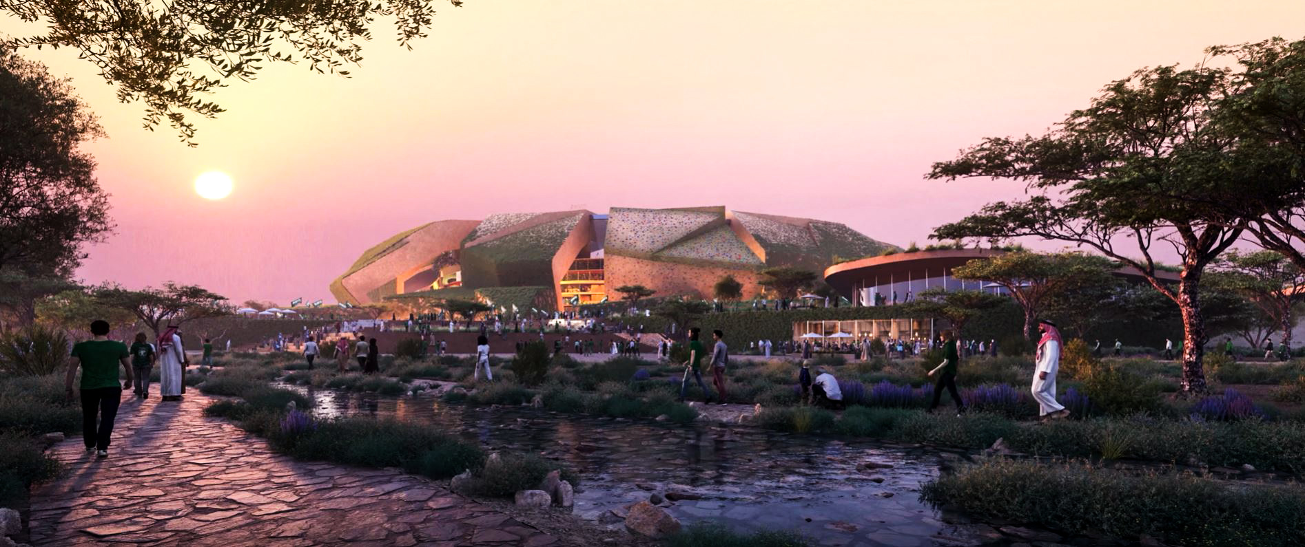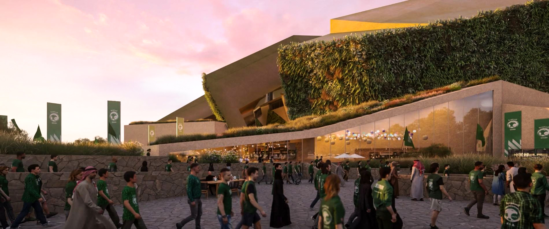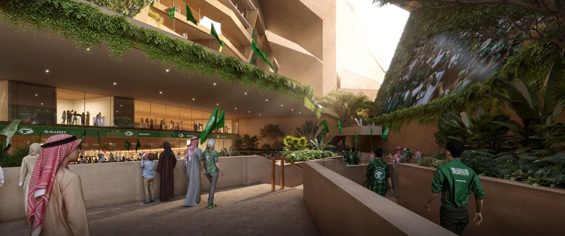 The masterplan design integrates the stadium seamlessly with King Abdulaziz Park, reflecting sustainable building practices and a thoughtful, integrated approach to urban planning. Green walls and roofs link the stadium to surrounding green spaces via a connecting valley.
