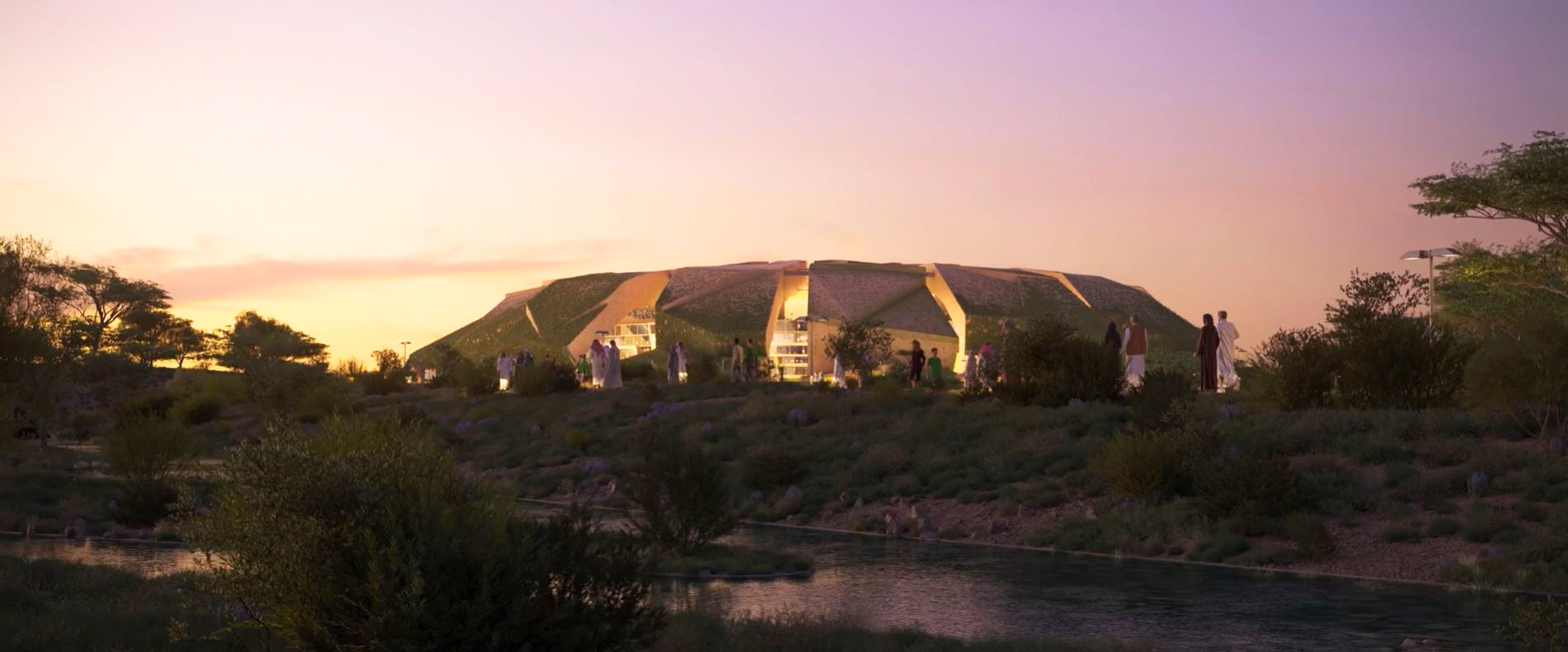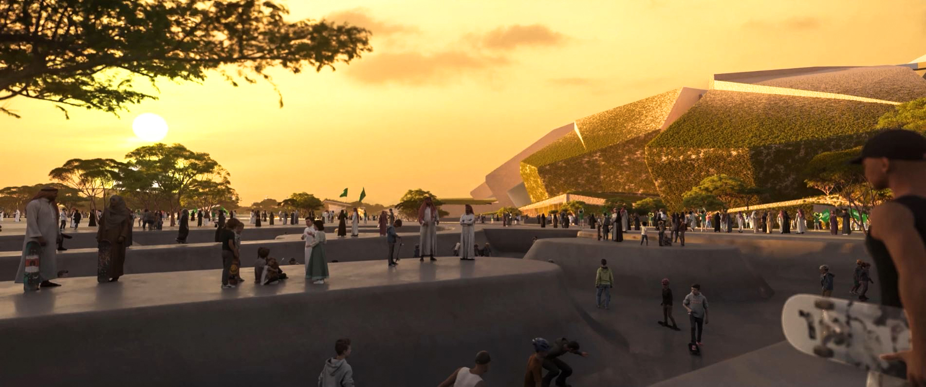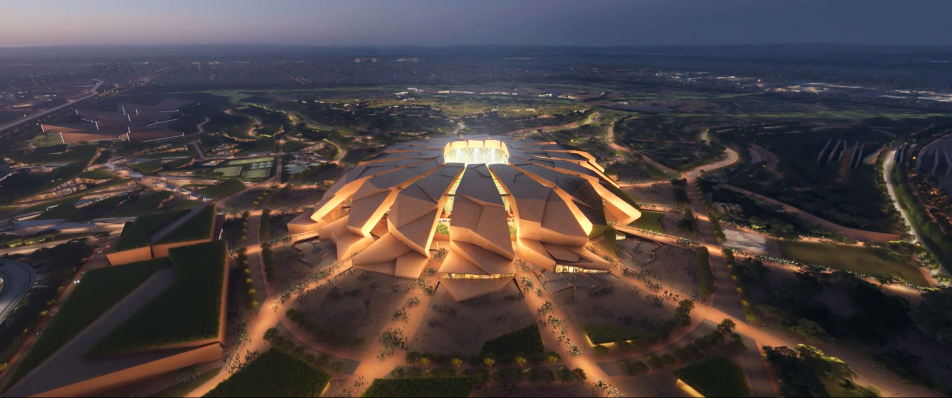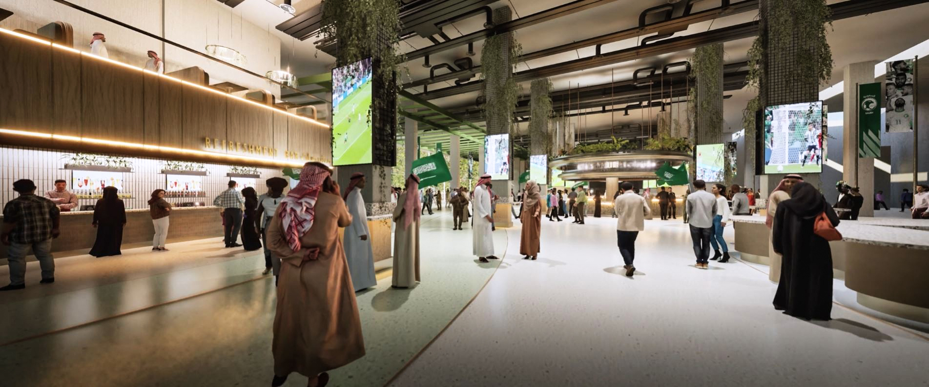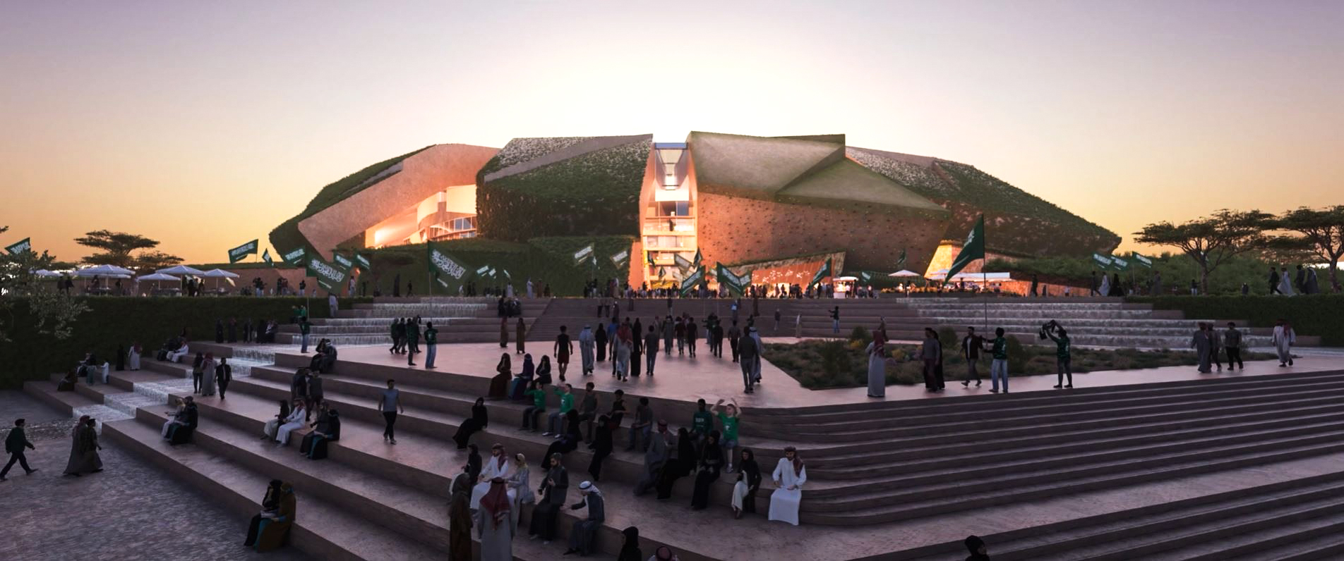 The masterplan design integrates the stadium seamlessly with King Abdulaziz Park, reflecting sustainable building practices and a thoughtful, integrated approach to urban planning. Green walls and roofs link the stadium to surrounding green spaces via a connecting valley.