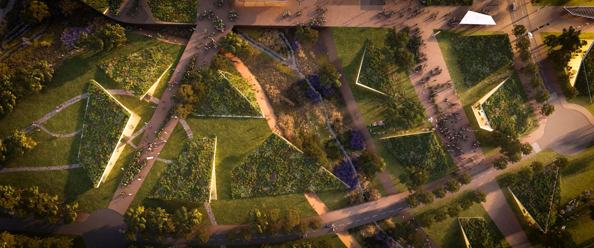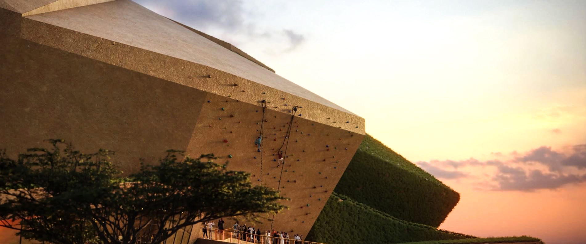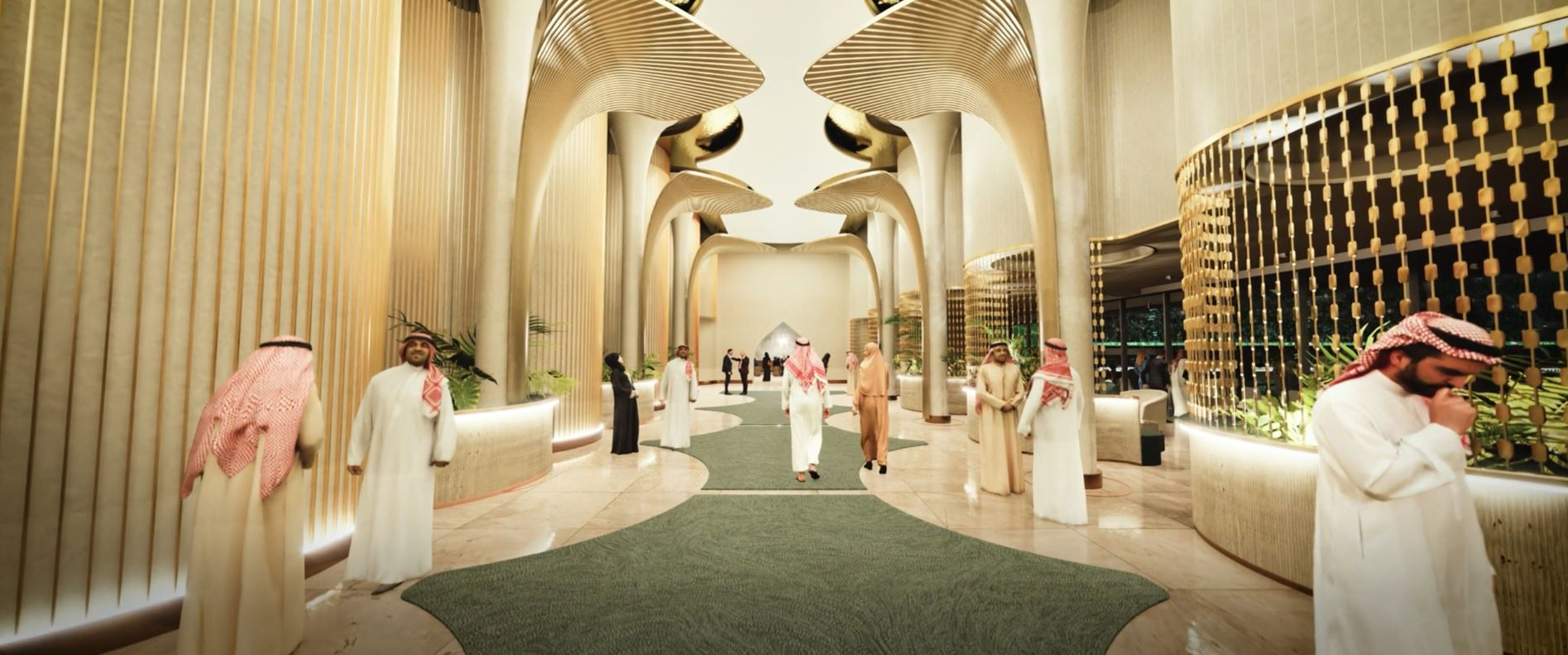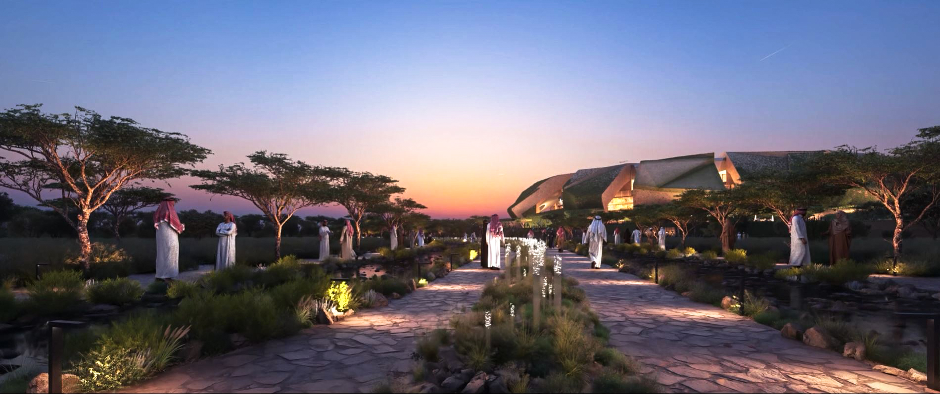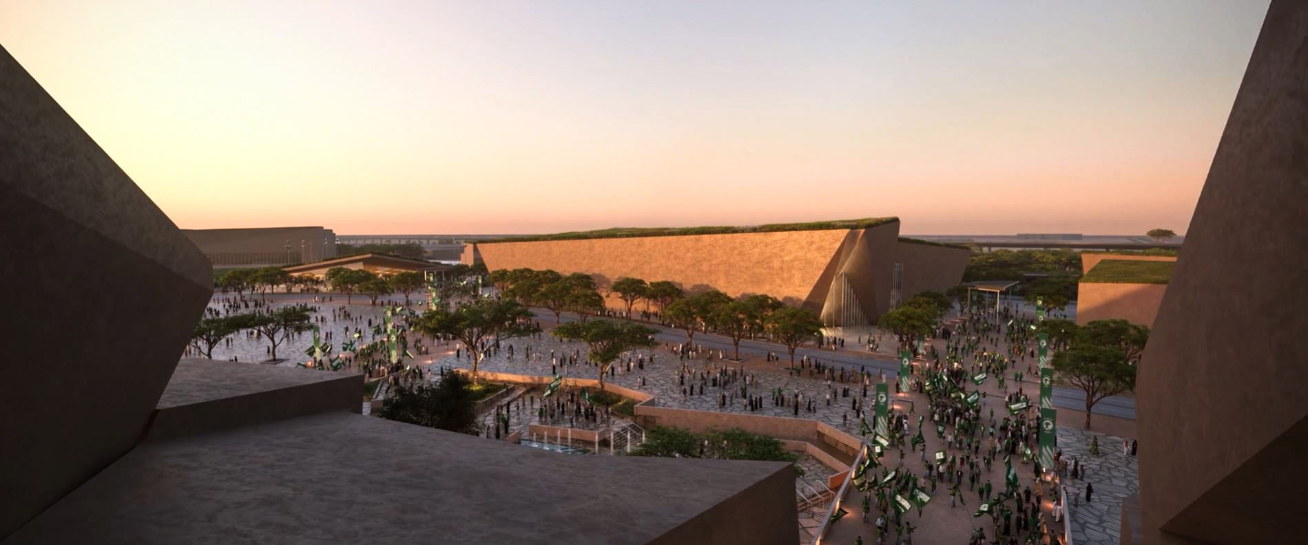 The masterplan design integrates the stadium seamlessly with King Abdulaziz Park, reflecting sustainable building practices and a thoughtful, integrated approach to urban planning. Green walls and roofs link the stadium to surrounding green spaces via a connecting valley.