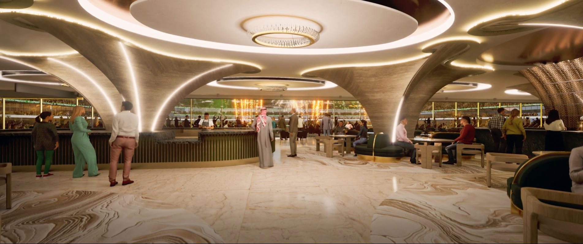 The seating bowl has been configured to accommodate Royals, VVIP, VIP and hospitality spectators in the west stand, with additional hospitality seating in the east stand. Additionally, a continuous ring of hospitality skyboxes encircles the entire bowl. General admission spectators are located within the upper and lower tiers above and below the hospitality seating in the bowl. The concourse areas facilitate the circulation of a large number of people and provide an inclusive and barrier-free experience for all.