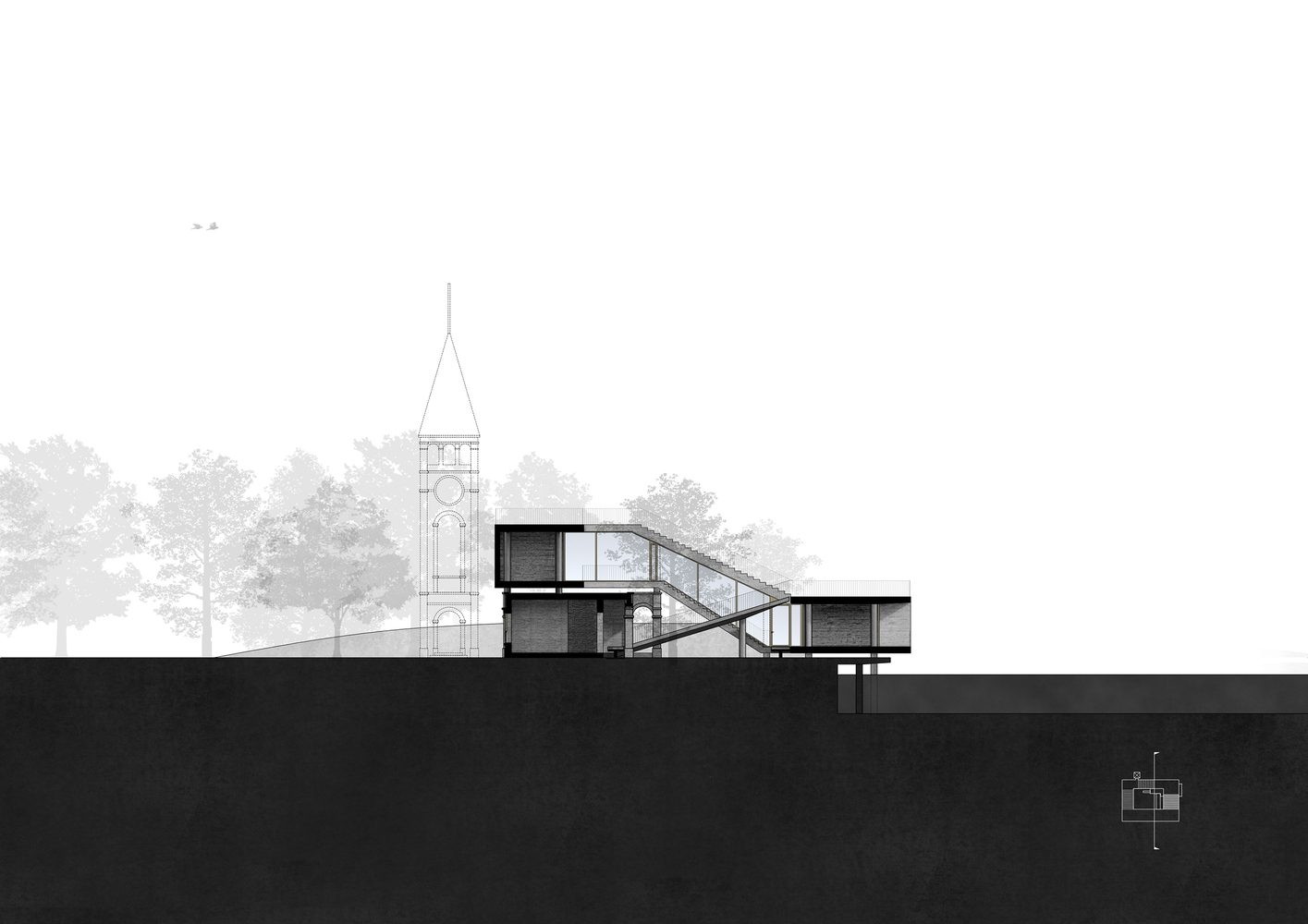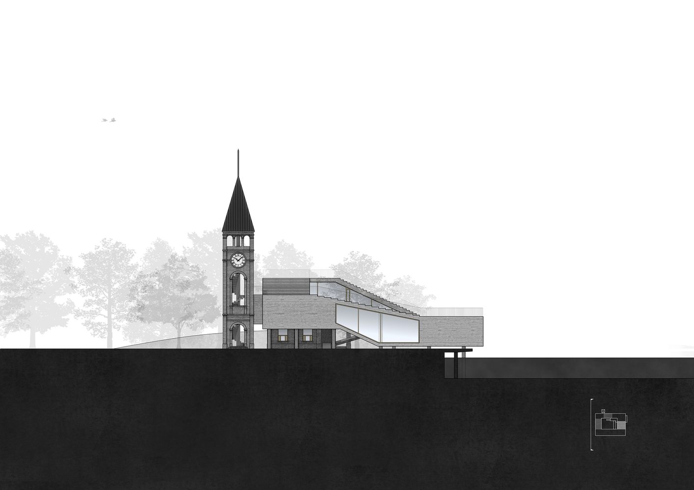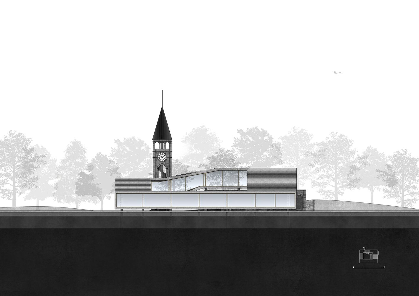 The design of the new building is characterized by a rolling serpentine loop—rising from the lakeshore, climbing up the existing hall and bell tower, and coming down back to the lake with a huge horizontal opening.