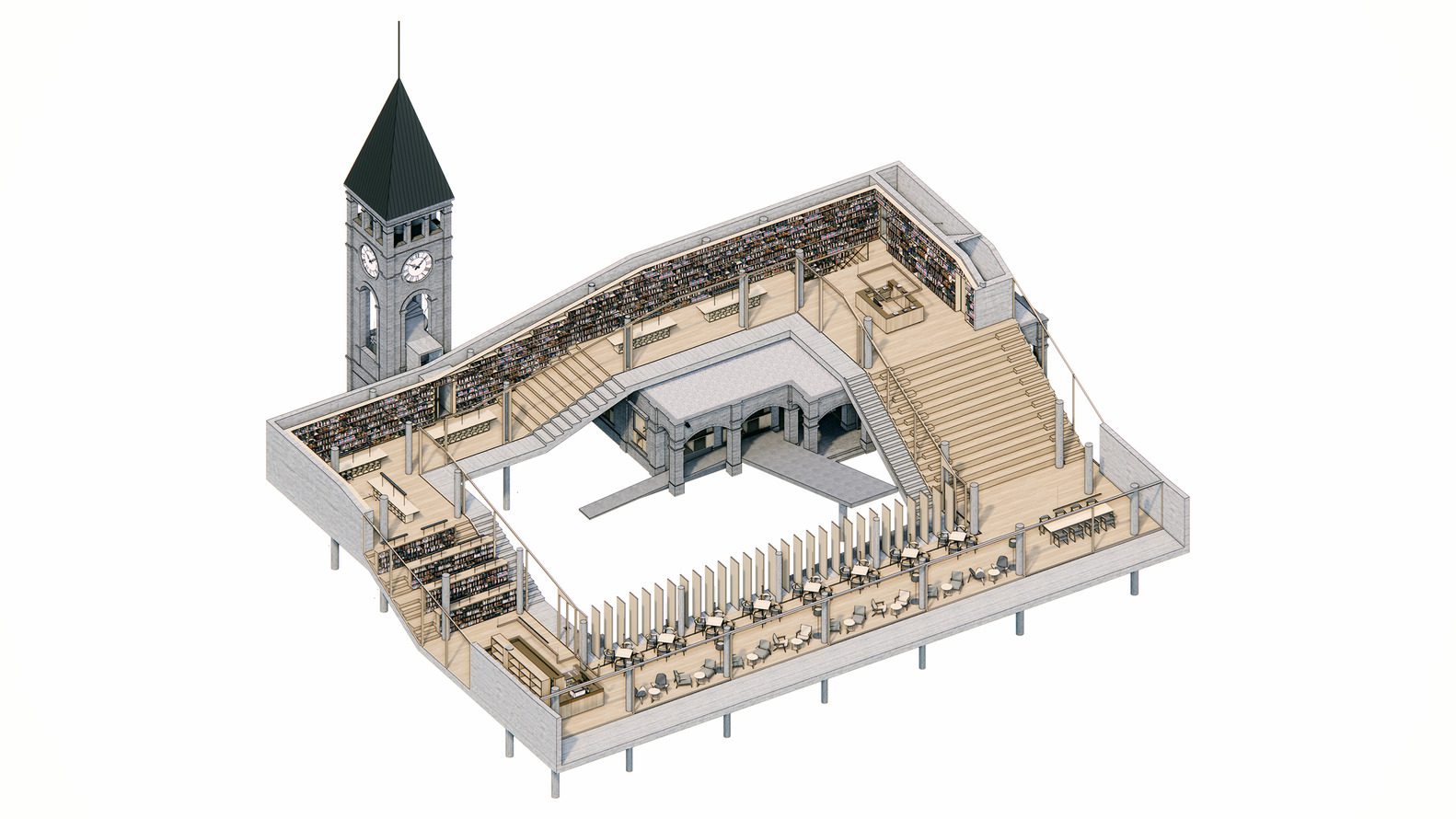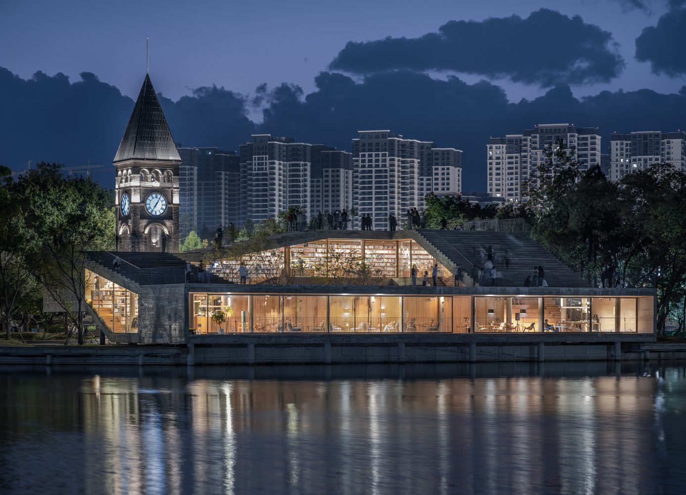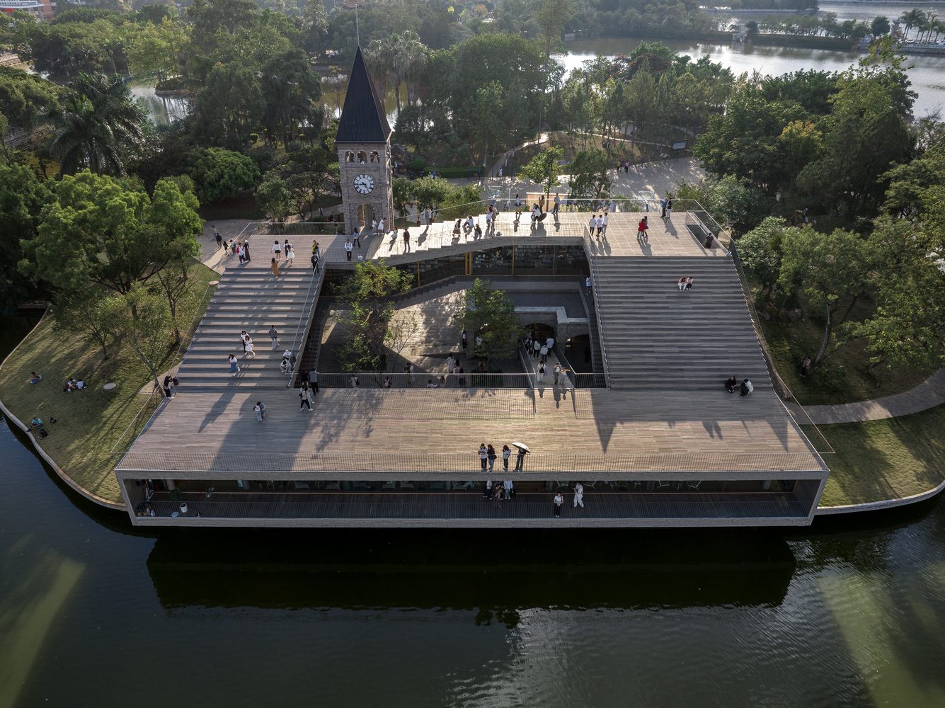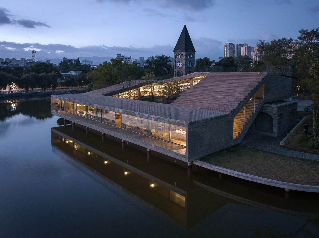 The design of the new building is characterized by a rolling serpentine loop—rising from the lakeshore, climbing up the existing hall and bell tower, and coming down back to the lake with a huge horizontal opening.