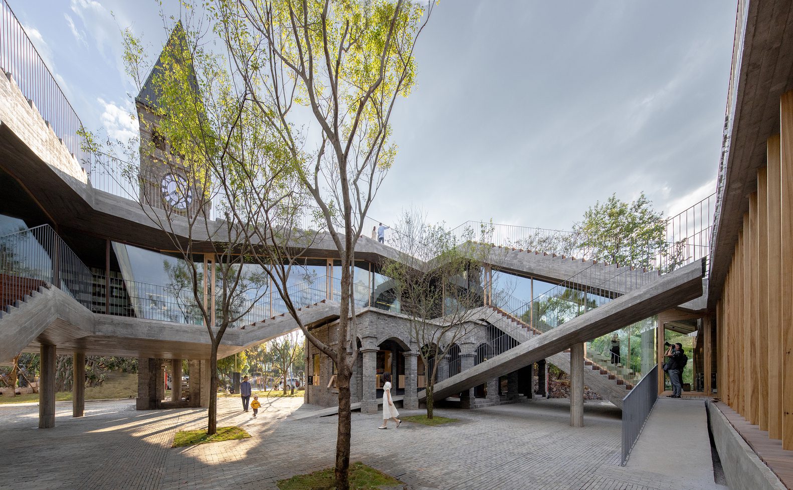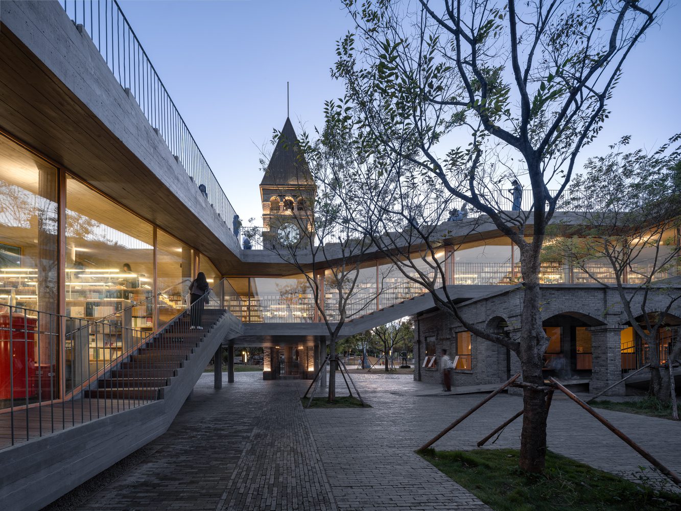 There was originally a group of concrete taverns and a bell tower on the site. ZAO/standardarchitecture selectively preserved part of the buildings and renovated the facades with gray bricks.