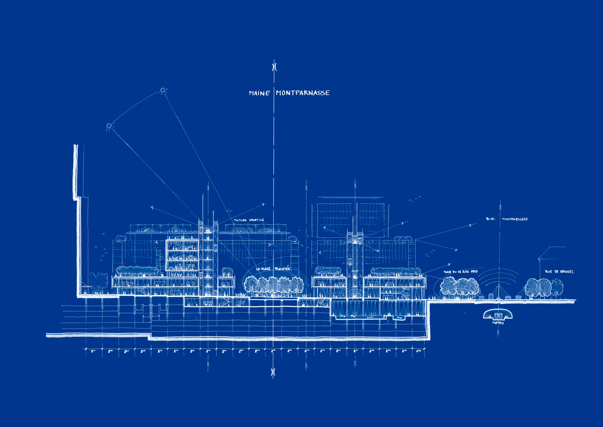 The project addresses a fragmented urban condition inherited from the era of slab-based planning by opening the site and reintegrating it into the surrounding city. New pedestrian routes cut through the block, reconnecting Rue de Rennes, the Montparnasse station and the neighboring streets, and linking three Parisian arrondissements. Ground floors are made transparent and permeable, allowing continuous visual and physical connections between the public realm and the heart of the block.