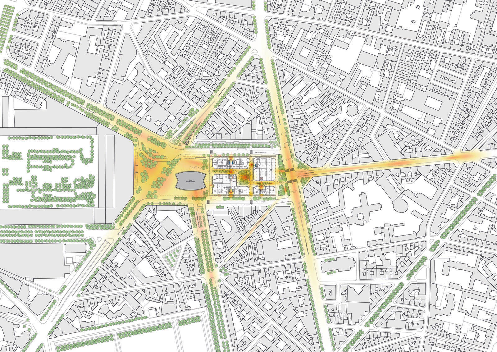 At the centre of the project, a large planted piazza becomes a new civic space for the neighbourhood and beyond. Protected from traffic and generously shaded, it is conceived as a place to meet, pause and gather, animated throughout the day by cafés, terraces, cultural and sports facilities. The scale of the new buildings is calibrated to harmonise with the surrounding urban fabric, reinforcing the feeling of a coherent Parisian block rather than a monolithic complex. By introducing a rich mix of programs including culture, sport, student housing, offices and local commerce, the project supports everyday life and proximity uses, contributing to a vibrant, walkable and inclusive urban environment.