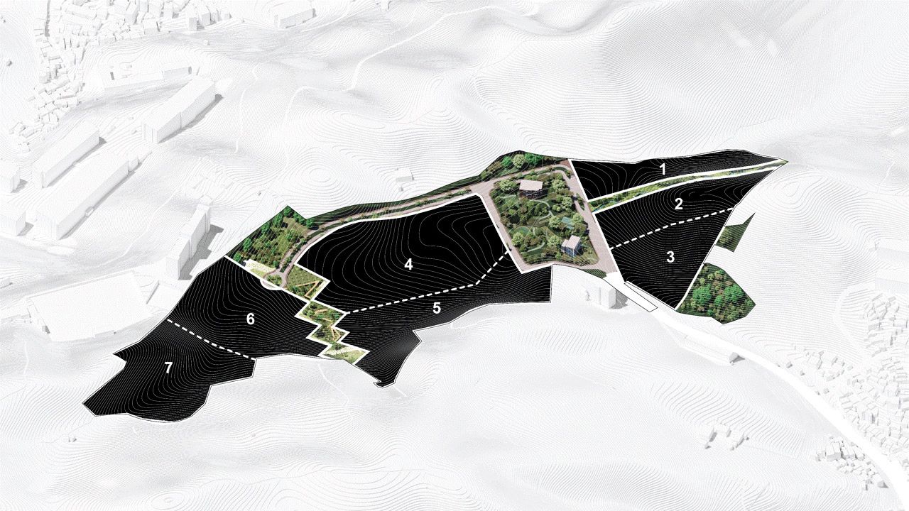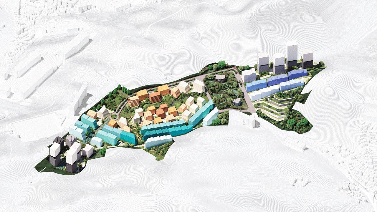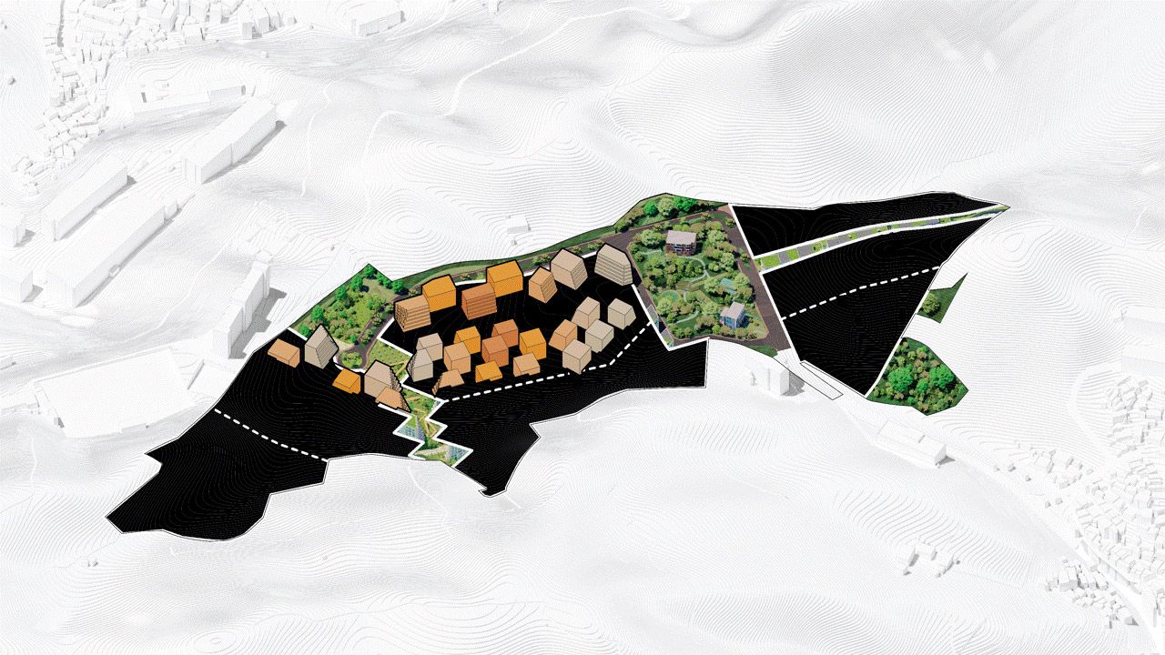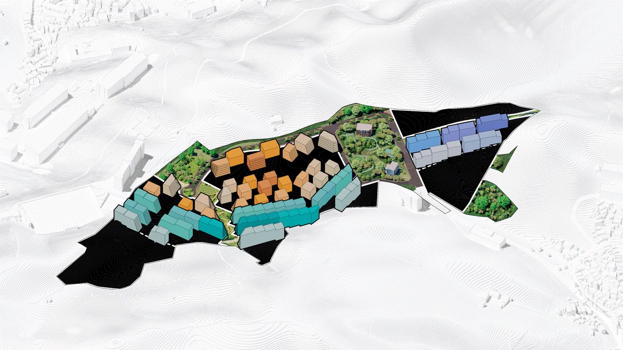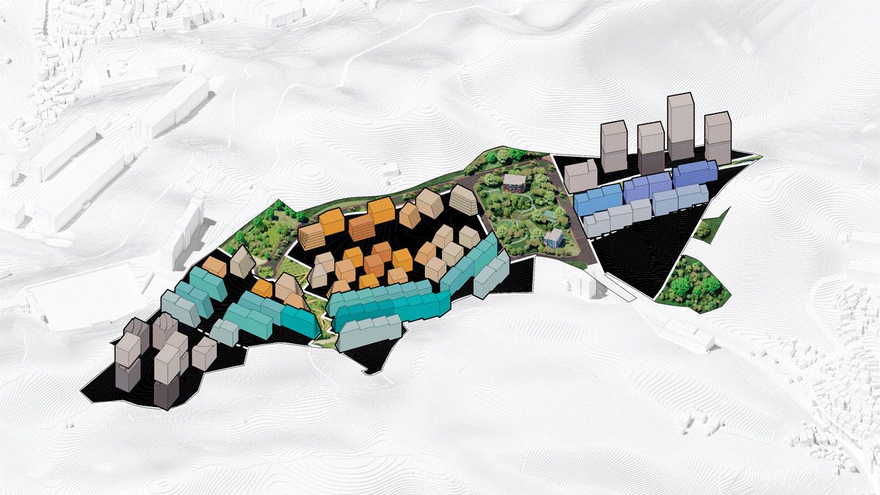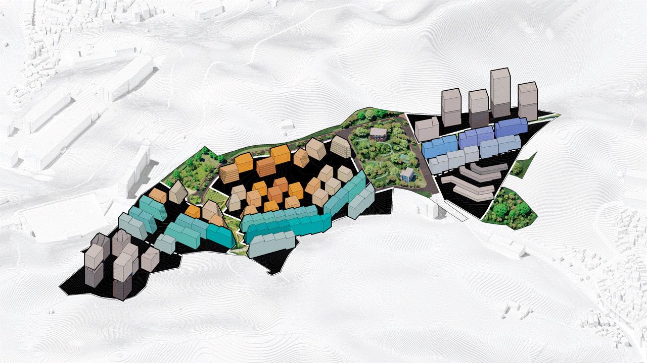 Four categories emerged: terrace housing, urban villas, row housing, and towers. We tested them across each site for slope, solar access, orientation, and area. Where multiple types were viable, we layered in qualitative filters: adjacency to public space, access gradient, viewshed, and visual variety. This allowed each site to suggest its own composition, shaped by terrain, light, and social logic. Types were placed where they perform best: towers on high points, villas at urban centers, row houses along ridges, terraces embedded in steep pockets. The result is not a uniform solution, but a calibrated patchwork of interlocking zones. Instead of fences and parking decks, neighborhoods are structured around stairs, landings, terraces, and small squares. Circulation becomes social. Outdoor space becomes communal. Life on the hillside becomes visible again.