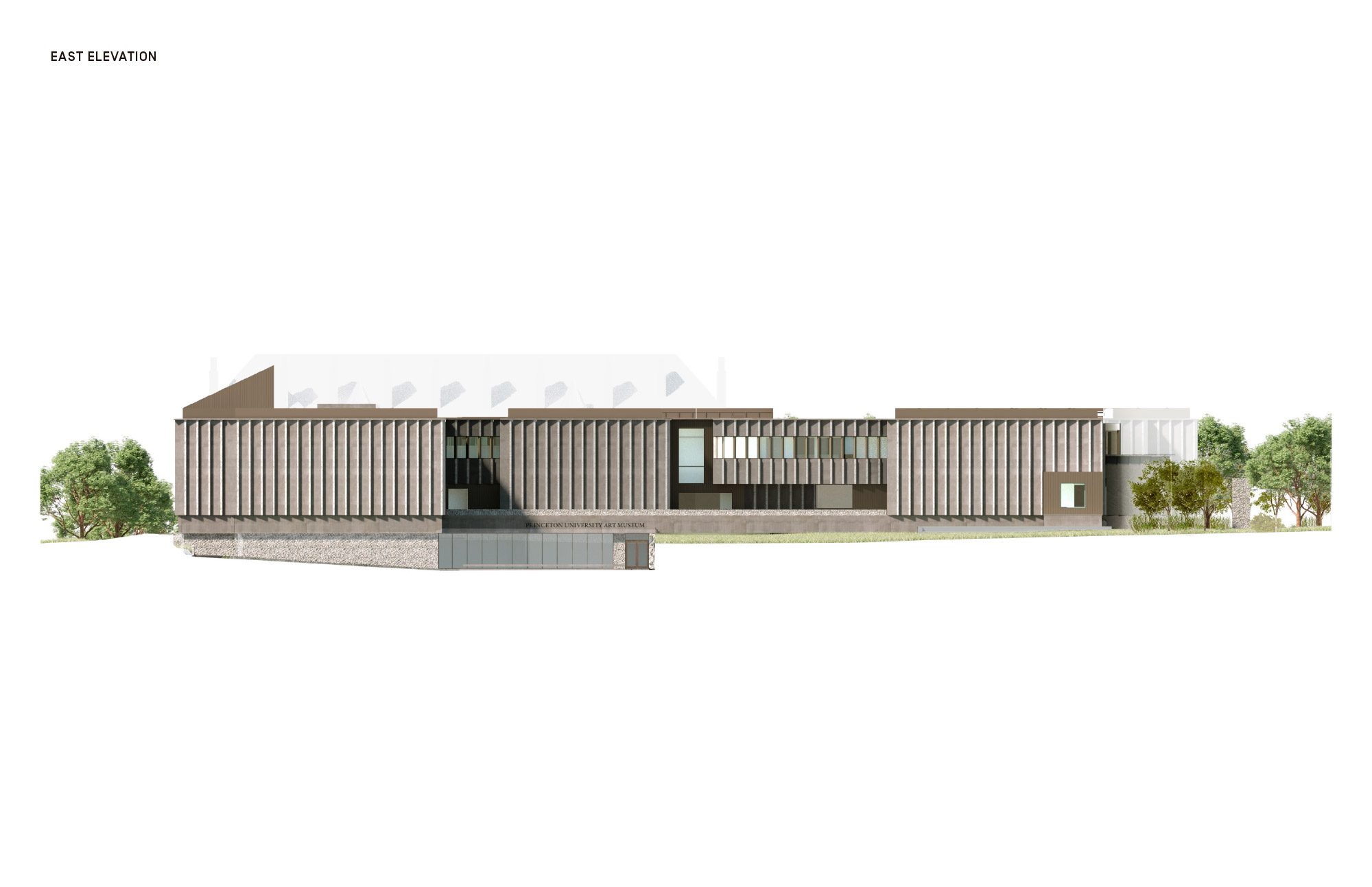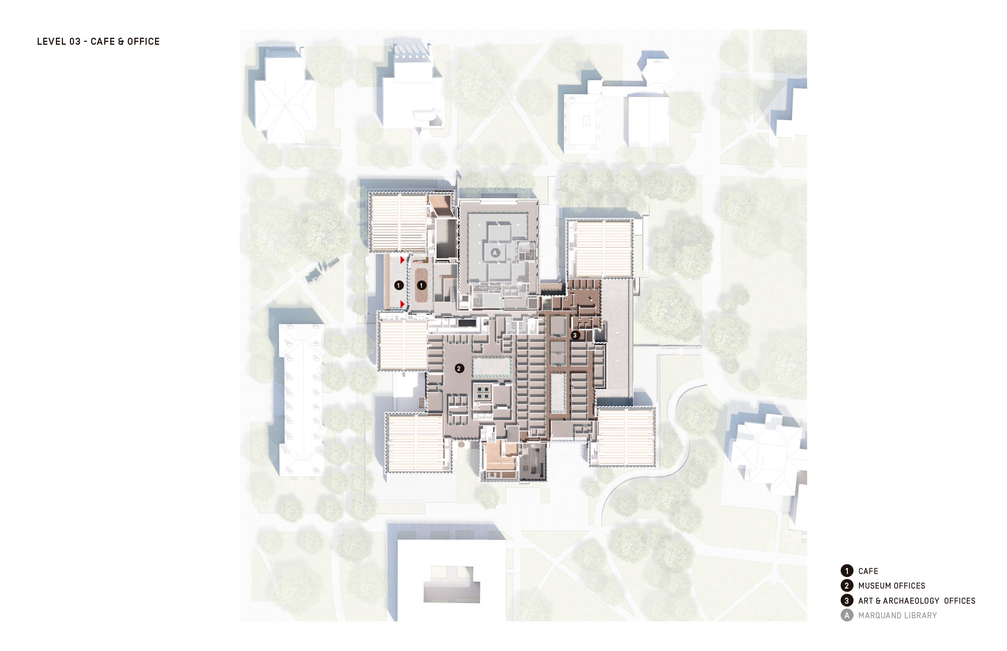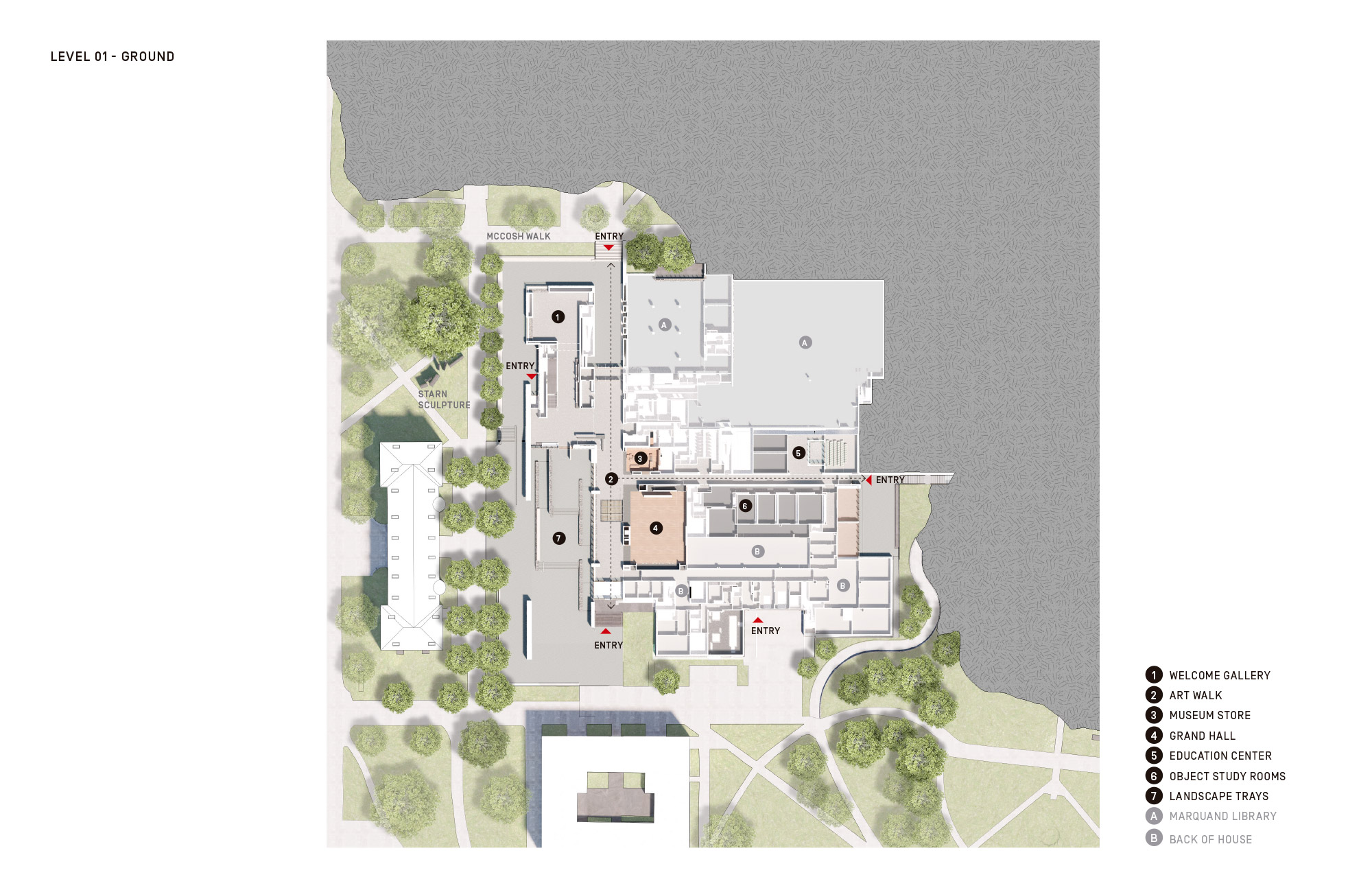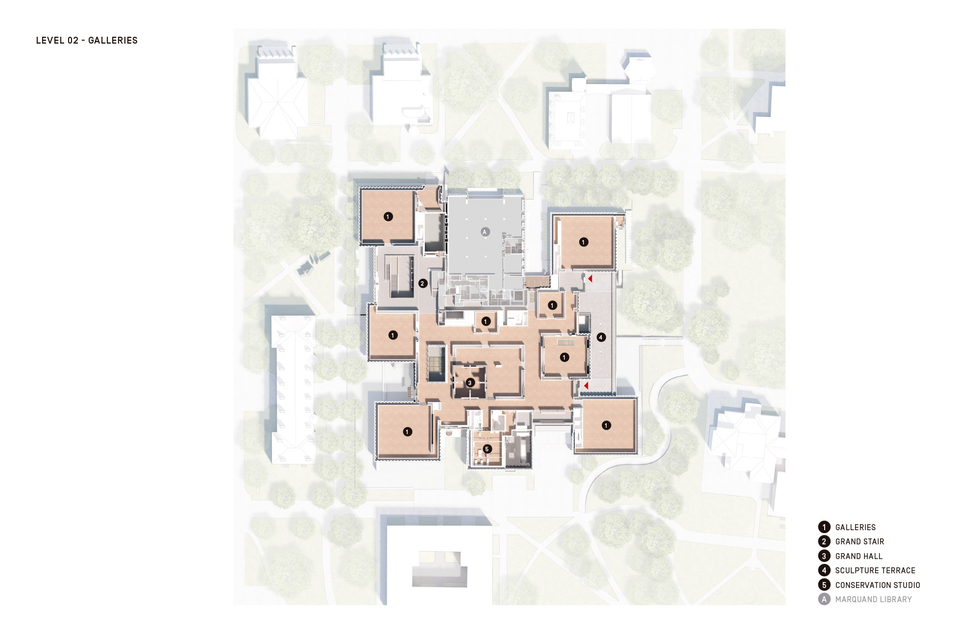 Galleries are arranged as a sequence of volumes interspersed with in-between spaces that frame views to college landmarks, the landscape, and outdoor sculpture. The massing responds to the site’s natural gradient, stepping down to create terraces, open- air courtyards, and outdoor gathering spaces for events ranging from 200 to 2,000 people. The landscape design preserves mature elms and beeches along McCosh Walk, relocating significant trees where possible, and introducing new green terraces that blend the museum and the topography.