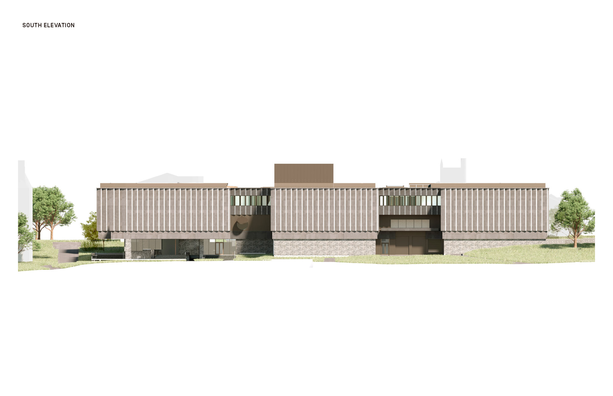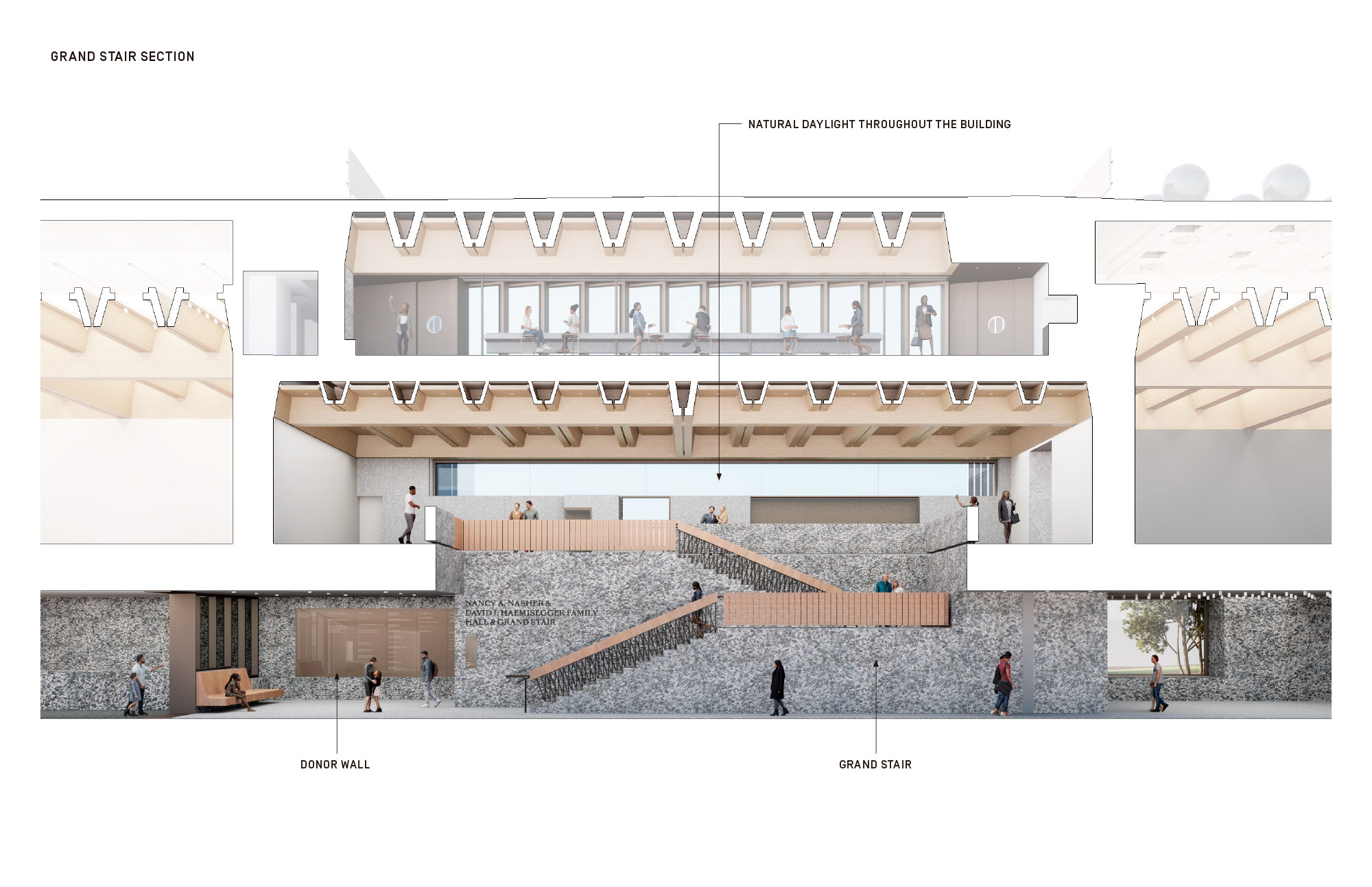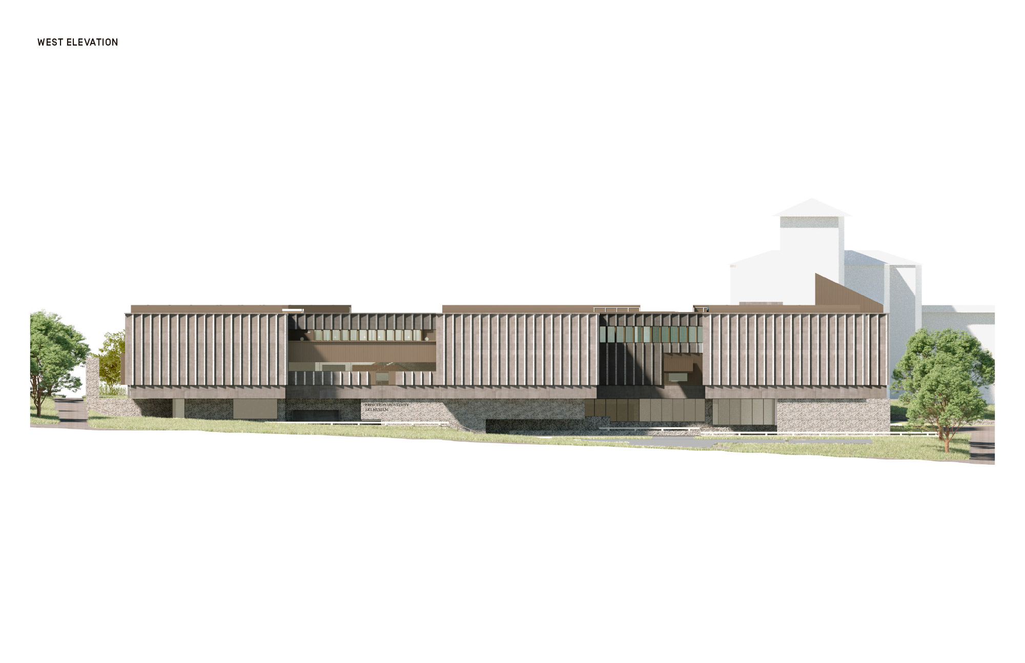 The design emphasizes transparency and engagement, with lens windows, light wells, and open circulation that connect art, landscape, and community. Material choices and façade treatments are tuned to catch light from all directions, animating the building throughout the day. The exterior combines alternating rough and polished stone aggregate panels with bronze and triple-glazed windows. The result is an articulated architecture that is textured, porous, and responsive.