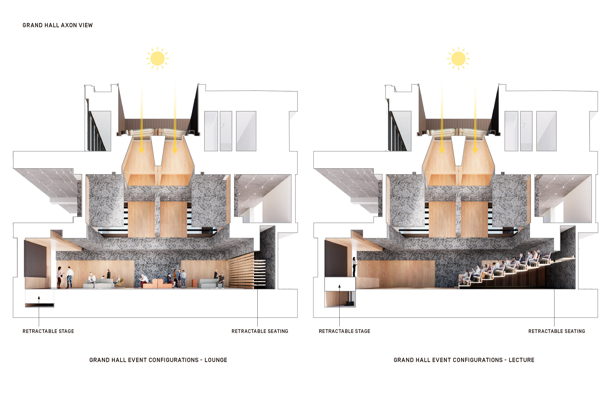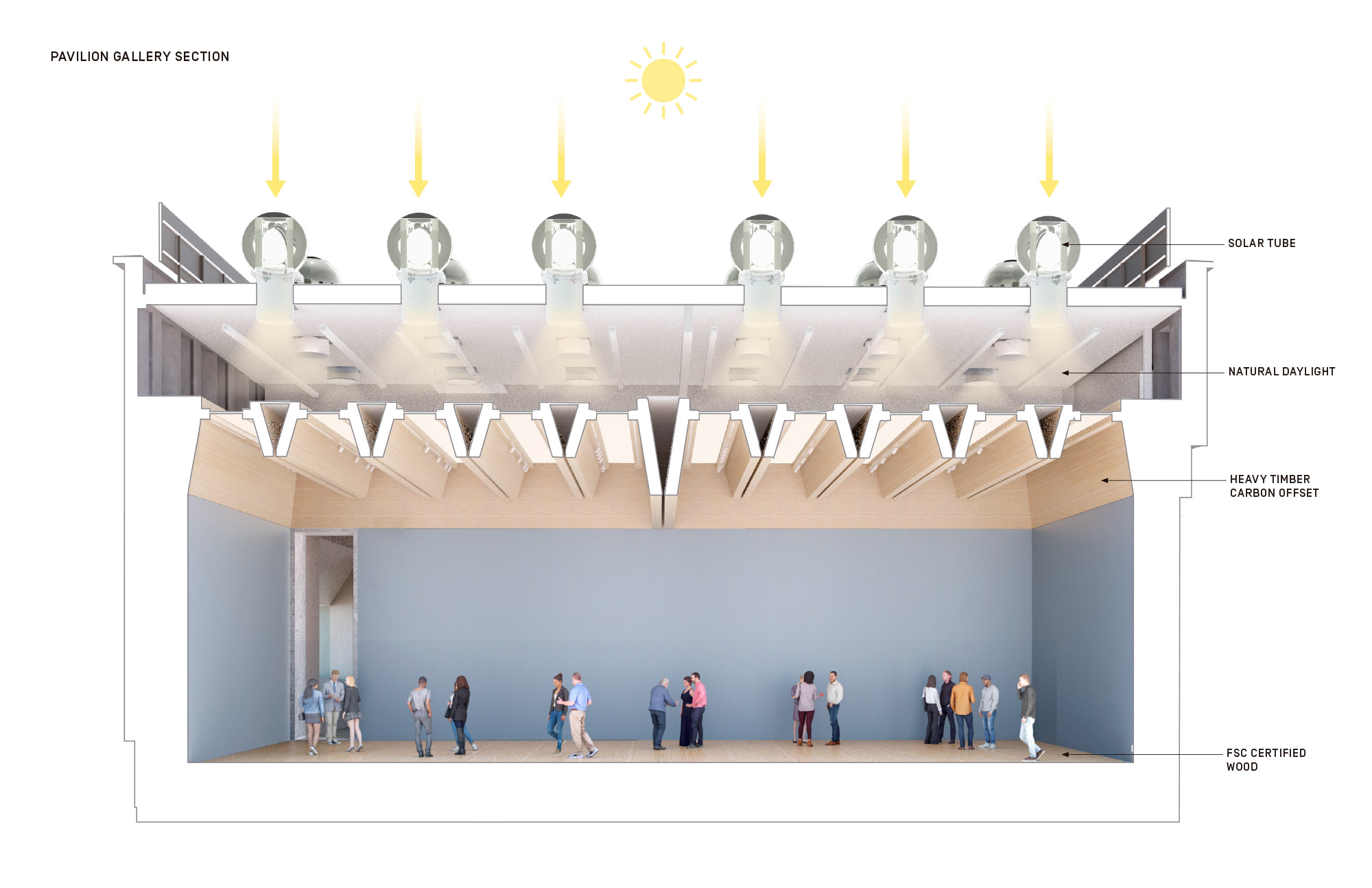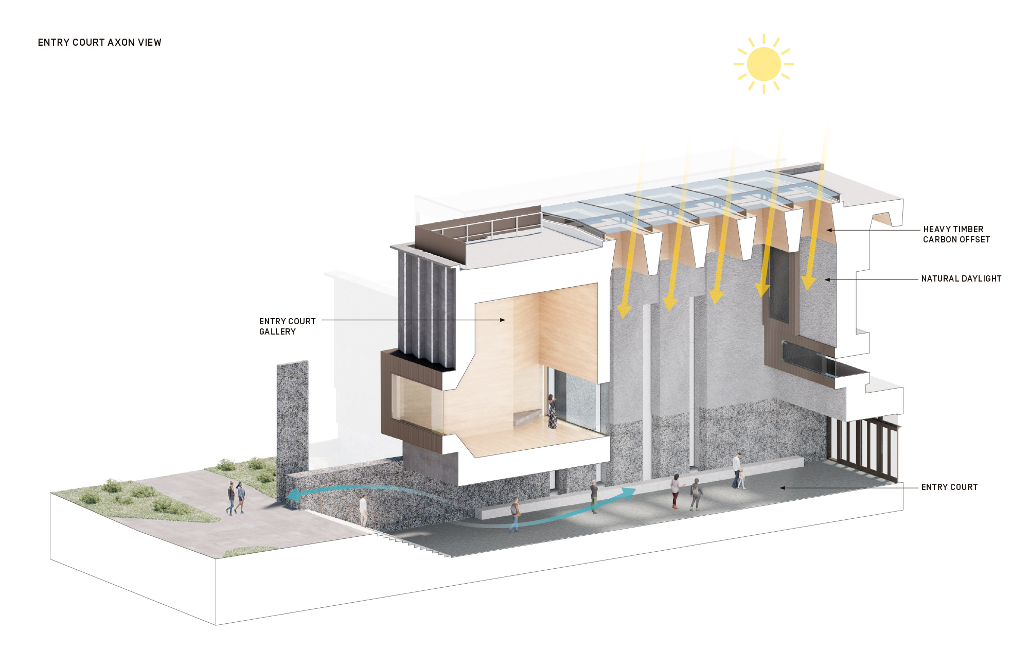 Organized around two main axes, north-south and east-west, the museum aligns with existing desire lines, ensuring it remains integrated with daily college life even when the galleries are closed. Two major “artwalks” traverse the ground floor, linking the building to existing campus circulation and allowing parts of the museum to remain active beyond gallery hours.