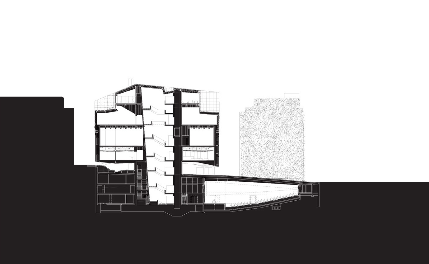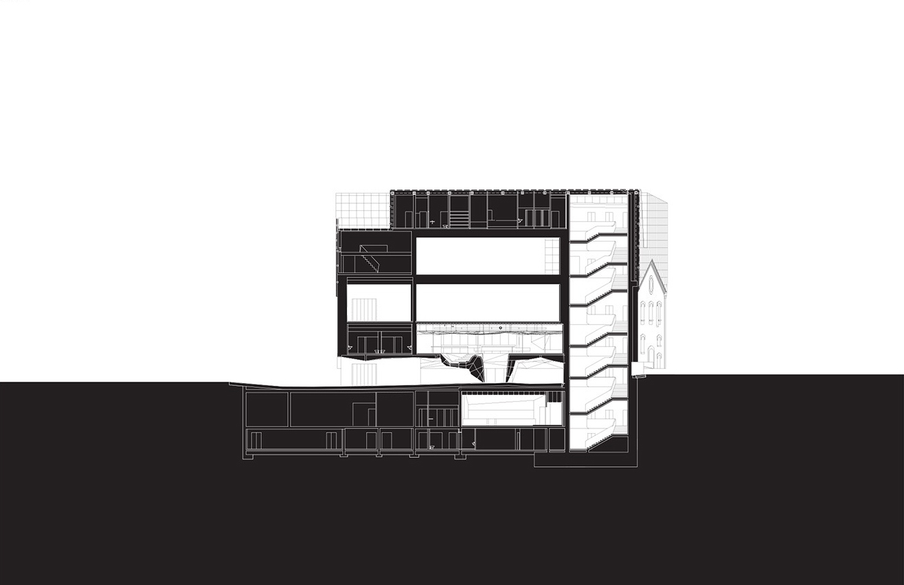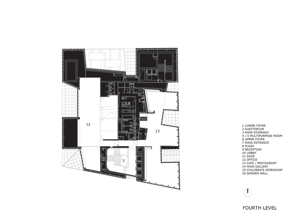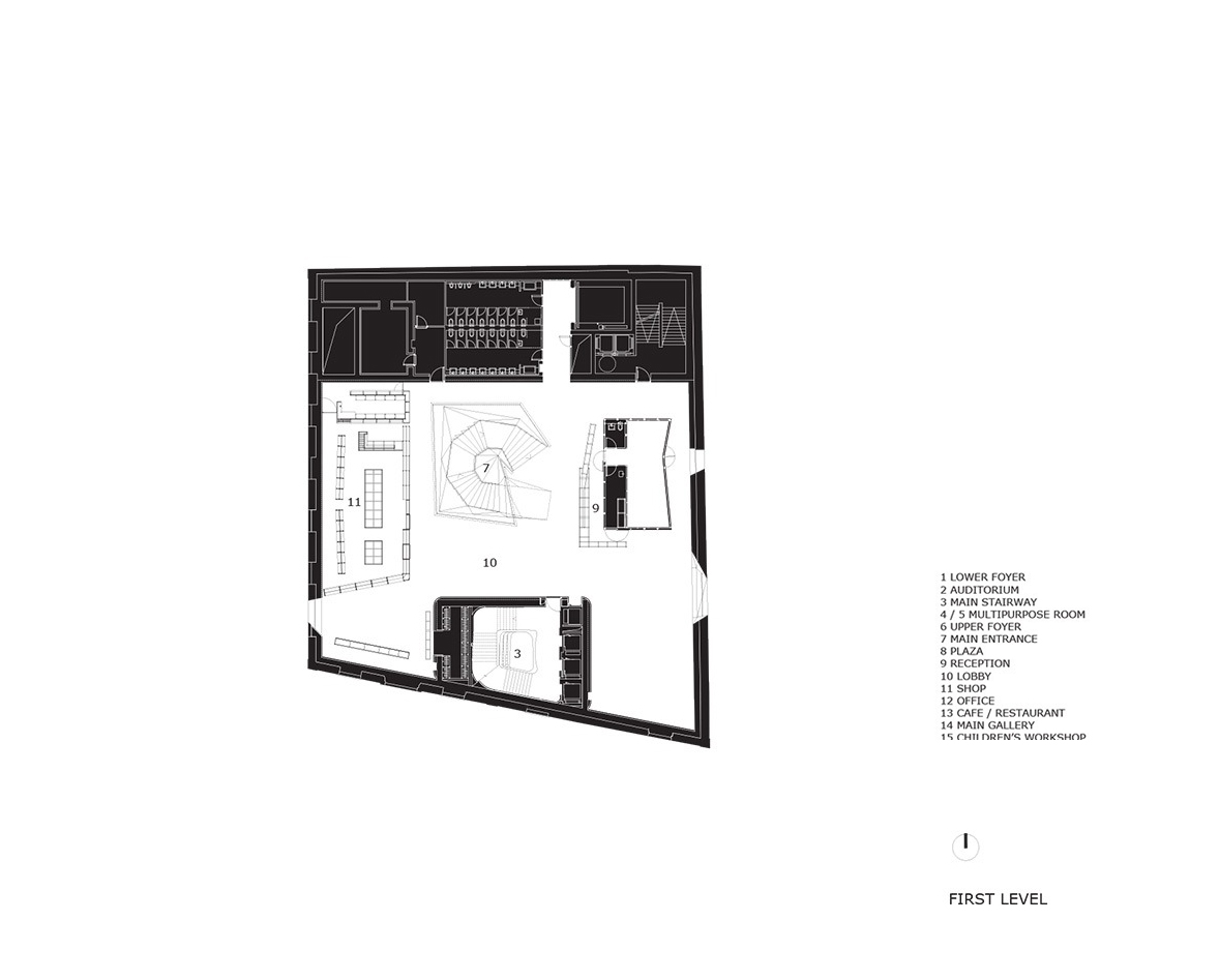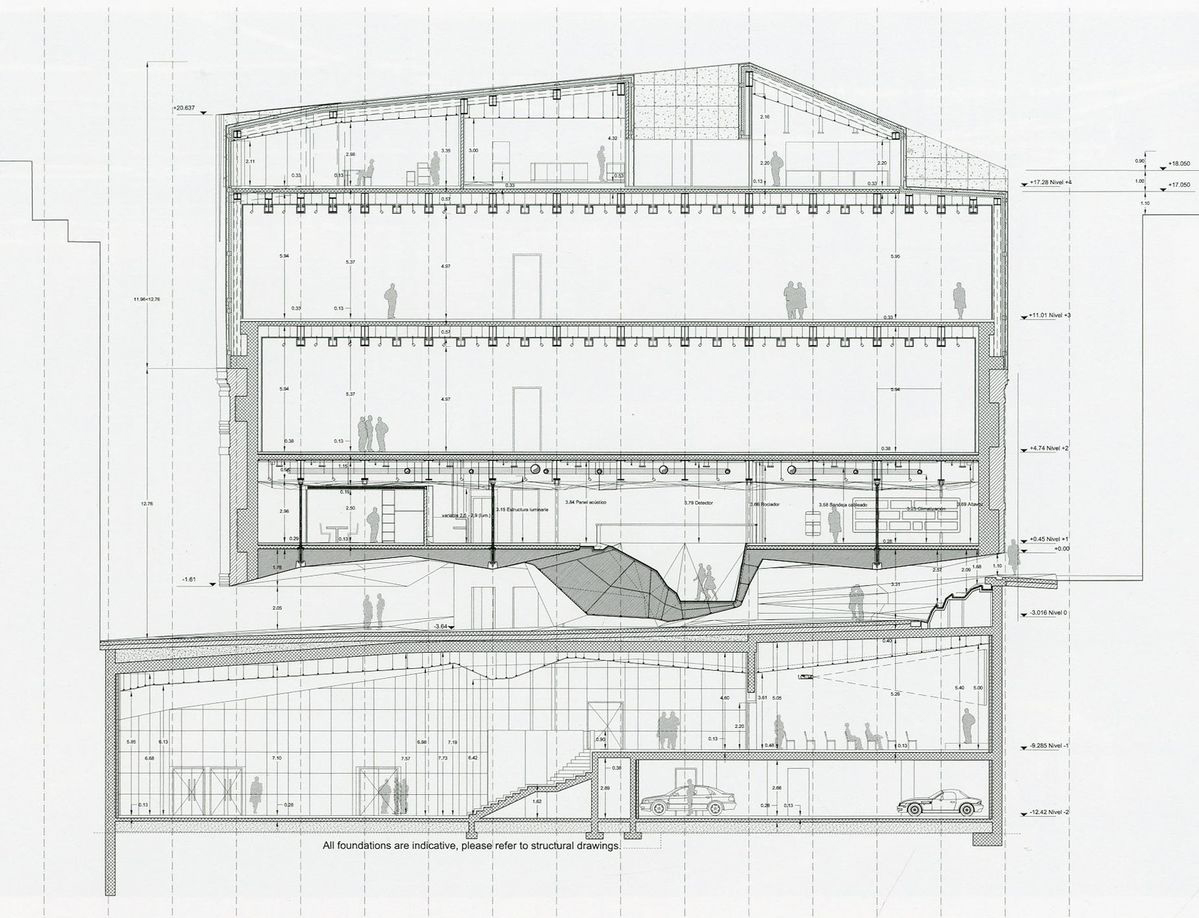 The separation of the structure from the ground level creates two worlds: one below and the other above the ground. The "underworld" buried beneath the topographically landscaped plaza provides space for a theater/auditorium, service rooms, and several parking spaces. The multi-storied building above ground houses the entrance lobby and galleries, a restaurant and administrative offices. There is a contrast between the flexible and loft-like character of the exhibition spaces and the spatial complexity of the top floor with its restaurant / bar and the offices. The surprising sculptural aspect of the CaixaForum’s silhouette is no mere architectural fancy, but reflects the roofscape of the surrounding buildings.