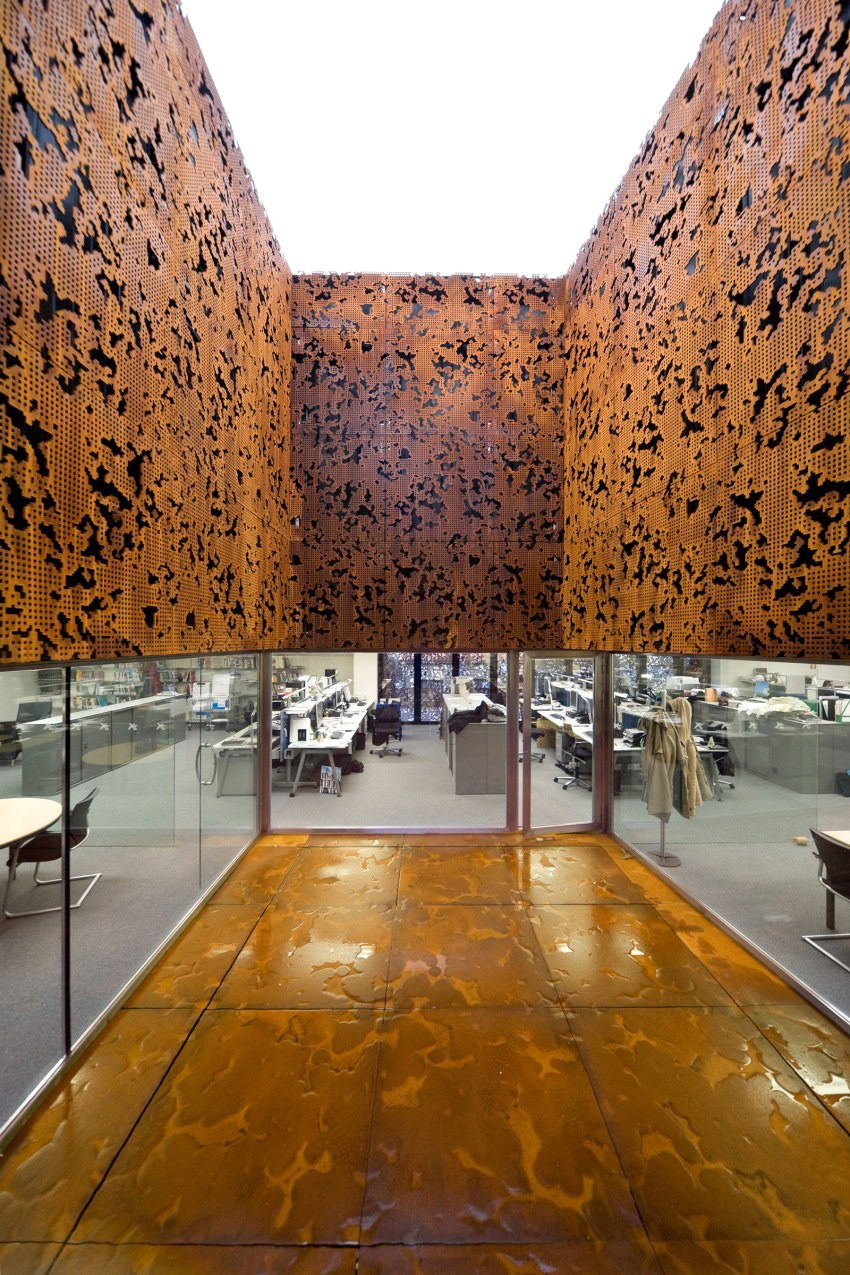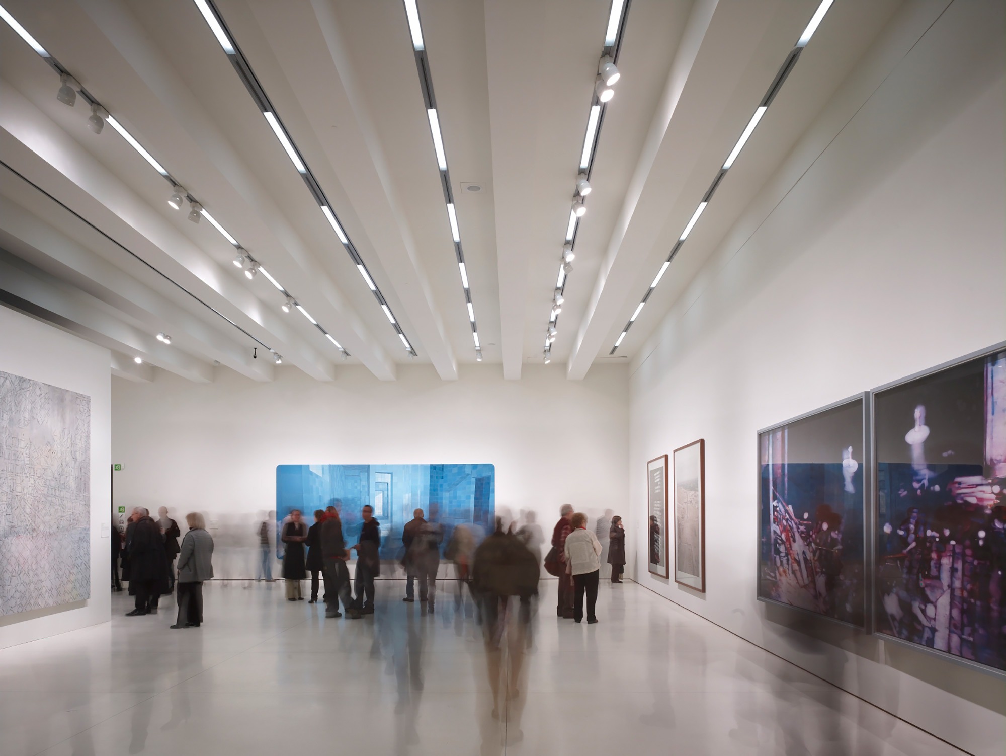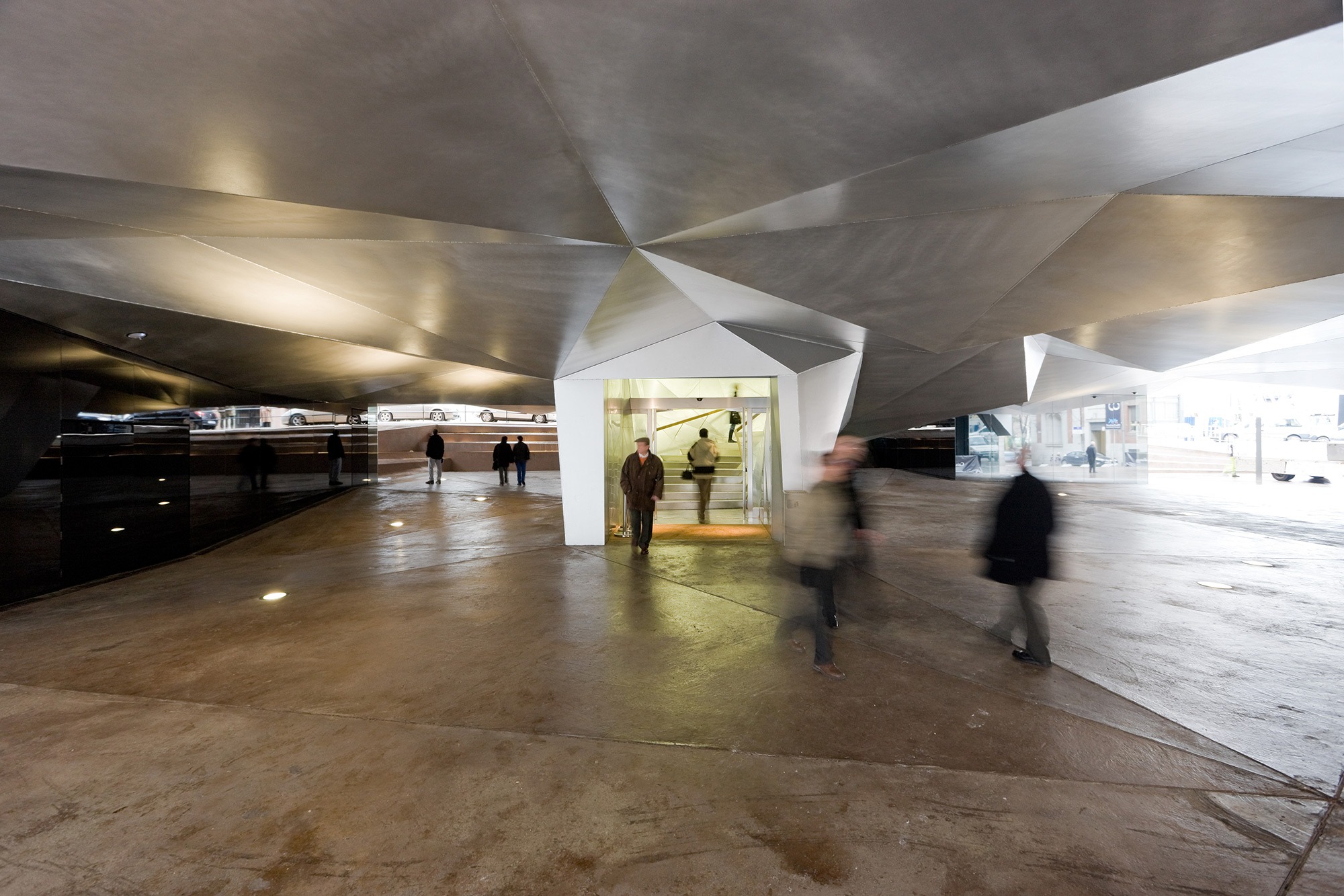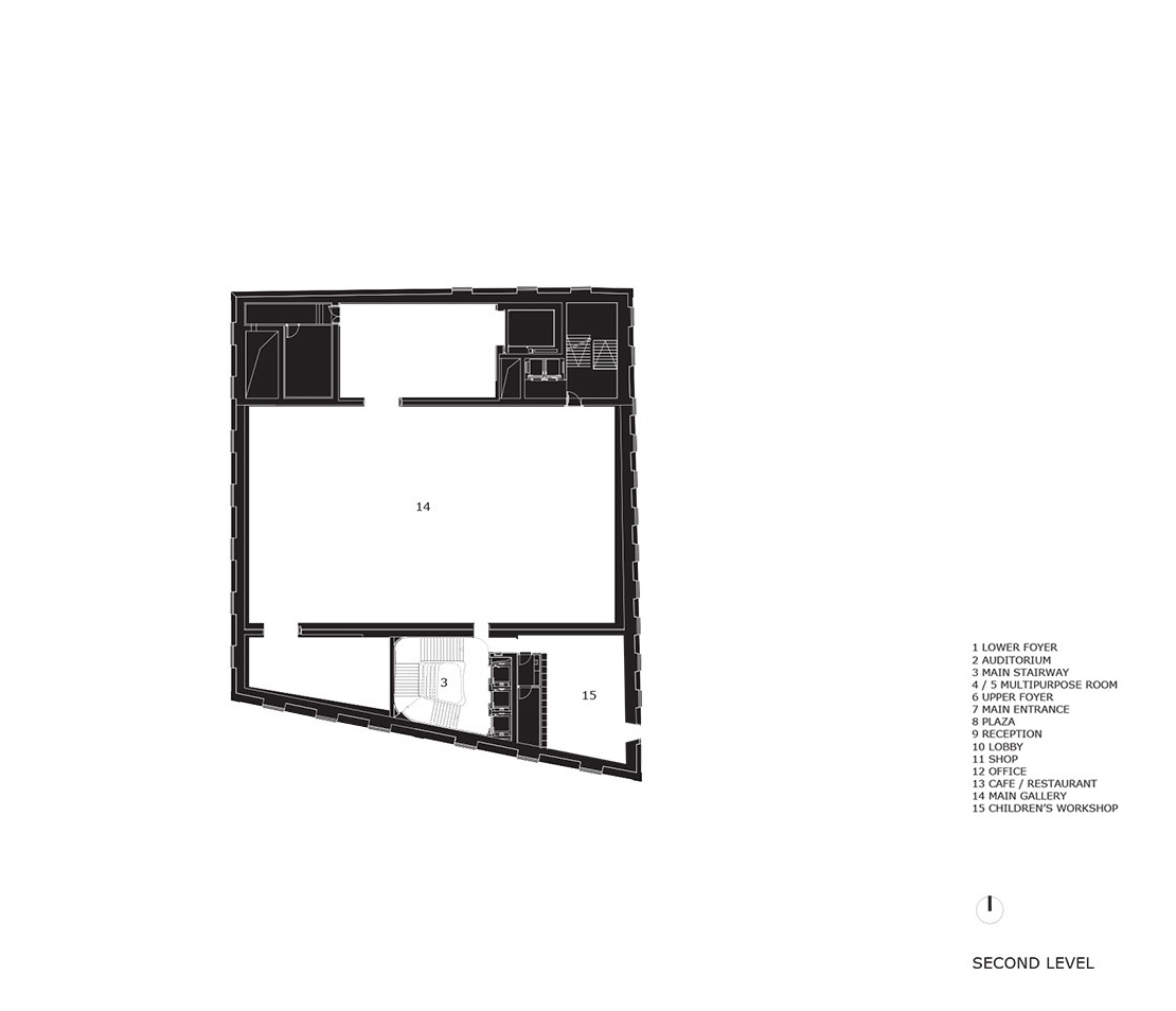 The separation of the structure from the ground level creates two worlds: one below and the other above the ground. The "underworld" buried beneath the topographically landscaped plaza provides space for a theater/auditorium, service rooms, and several parking spaces. The multi-storied building above ground houses the entrance lobby and galleries, a restaurant and administrative offices. There is a contrast between the flexible and loft-like character of the exhibition spaces and the spatial complexity of the top floor with its restaurant / bar and the offices. The surprising sculptural aspect of the CaixaForum’s silhouette is no mere architectural fancy, but reflects the roofscape of the surrounding buildings.