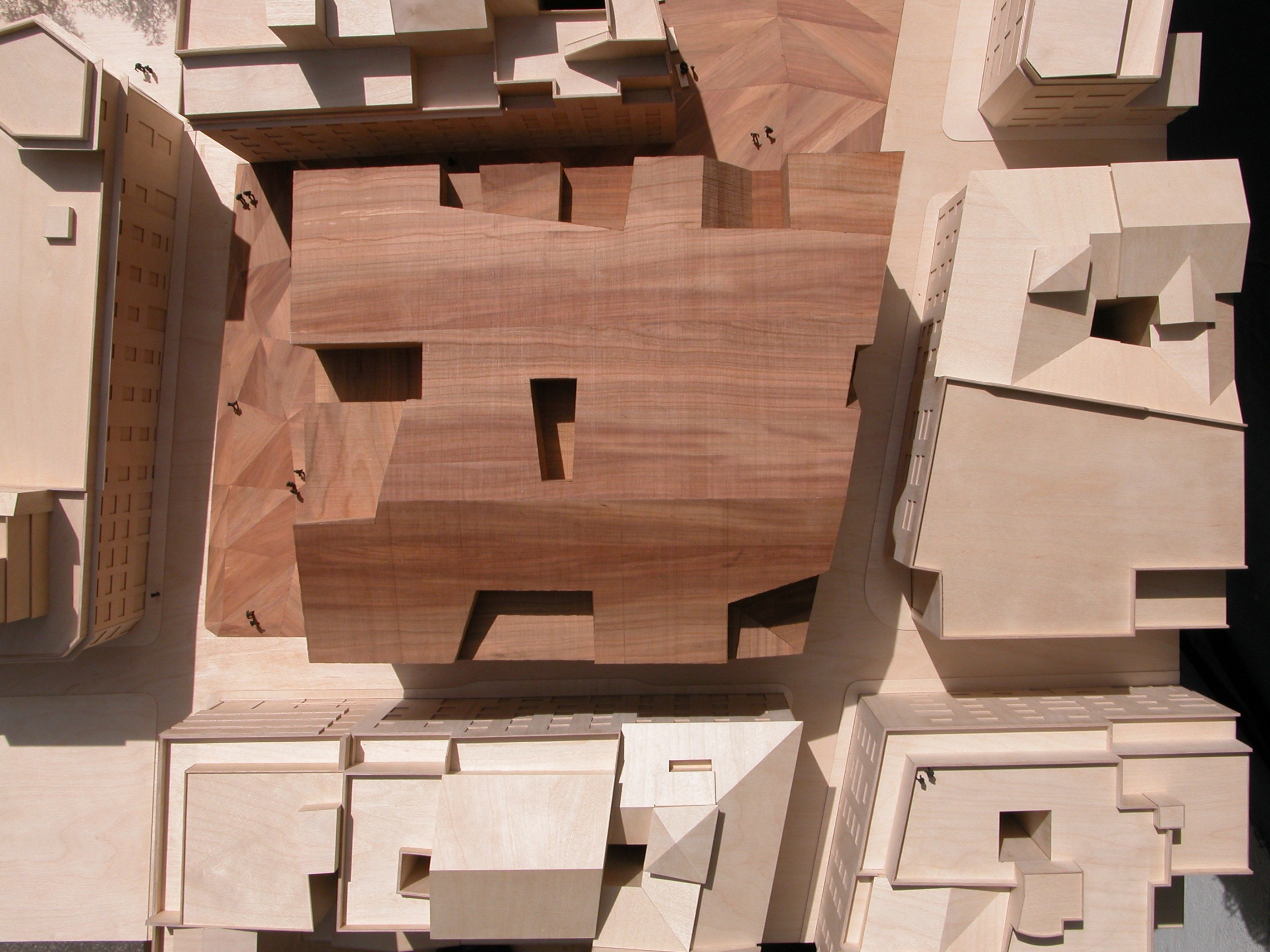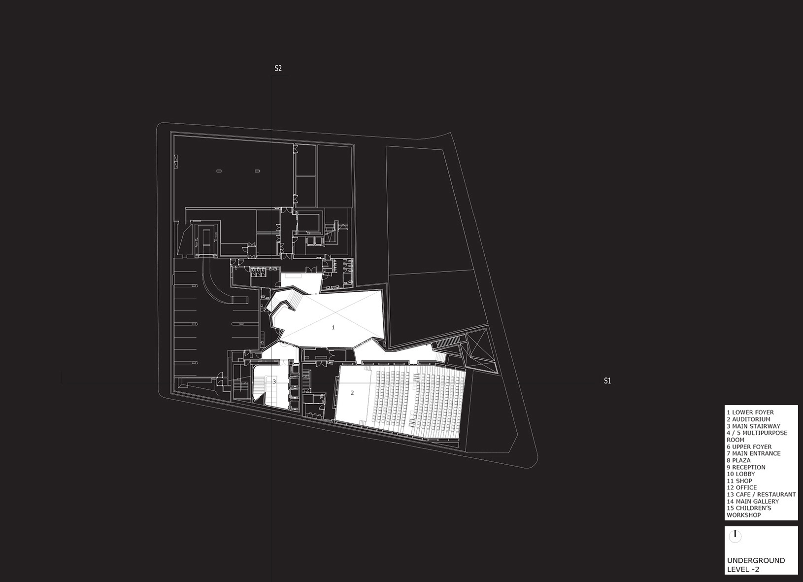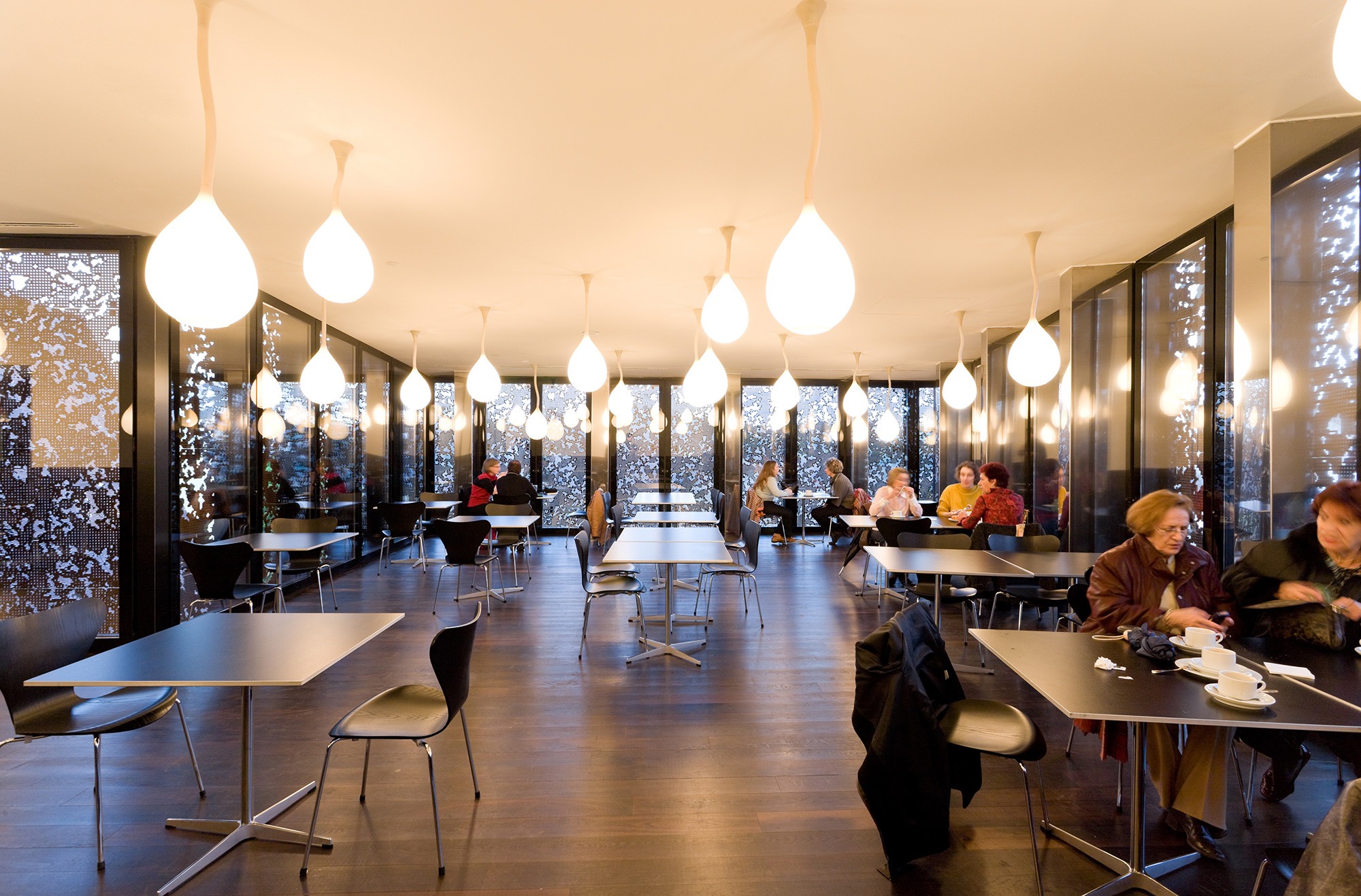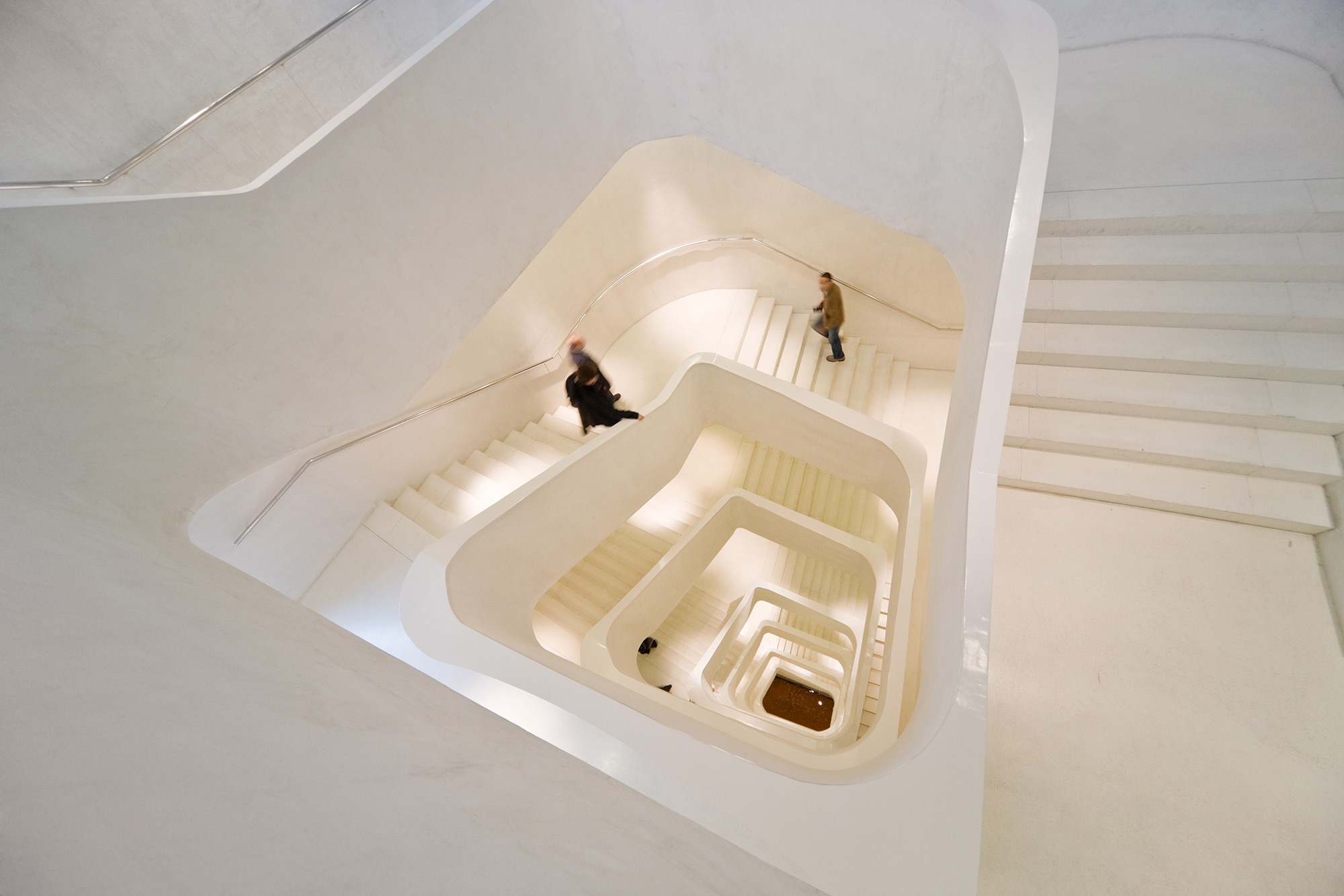The separation of the structure from the ground level creates two worlds: one below and the other above the ground. The "underworld" buried beneath the topographically landscaped plaza provides space for a theater/auditorium, service rooms, and several parking spaces. The multi-storied building above ground houses the entrance lobby and galleries, a restaurant and administrative offices. There is a contrast between the flexible and loft-like character of the exhibition spaces and the spatial complexity of the top floor with its restaurant / bar and the offices. The surprising sculptural aspect of the CaixaForum’s silhouette is no mere architectural fancy, but reflects the roofscape of the surrounding buildings.