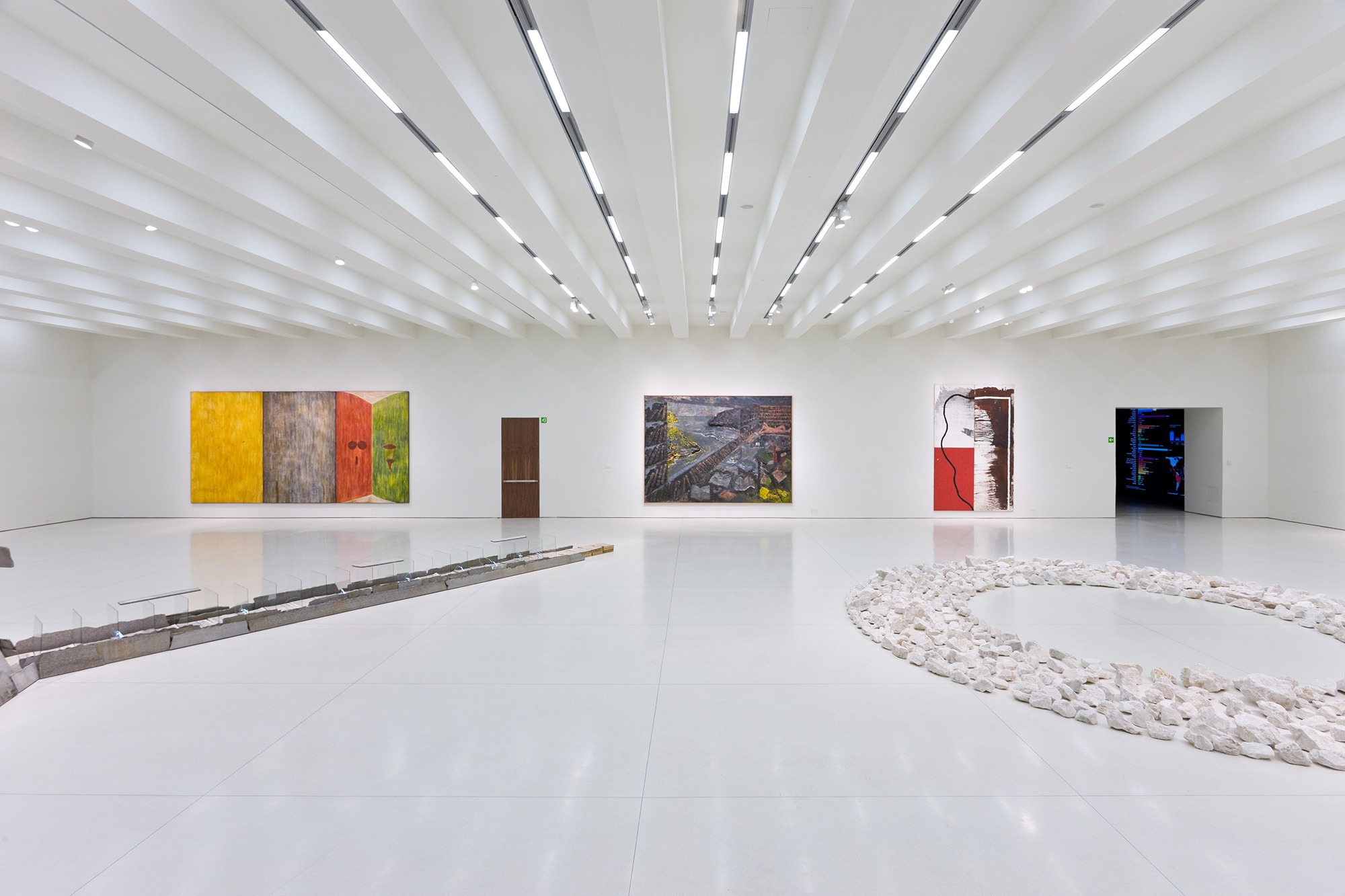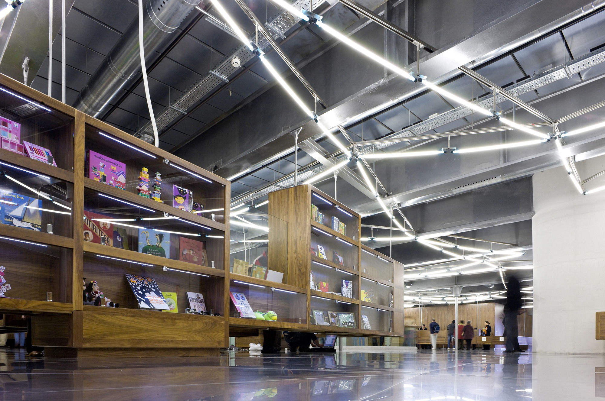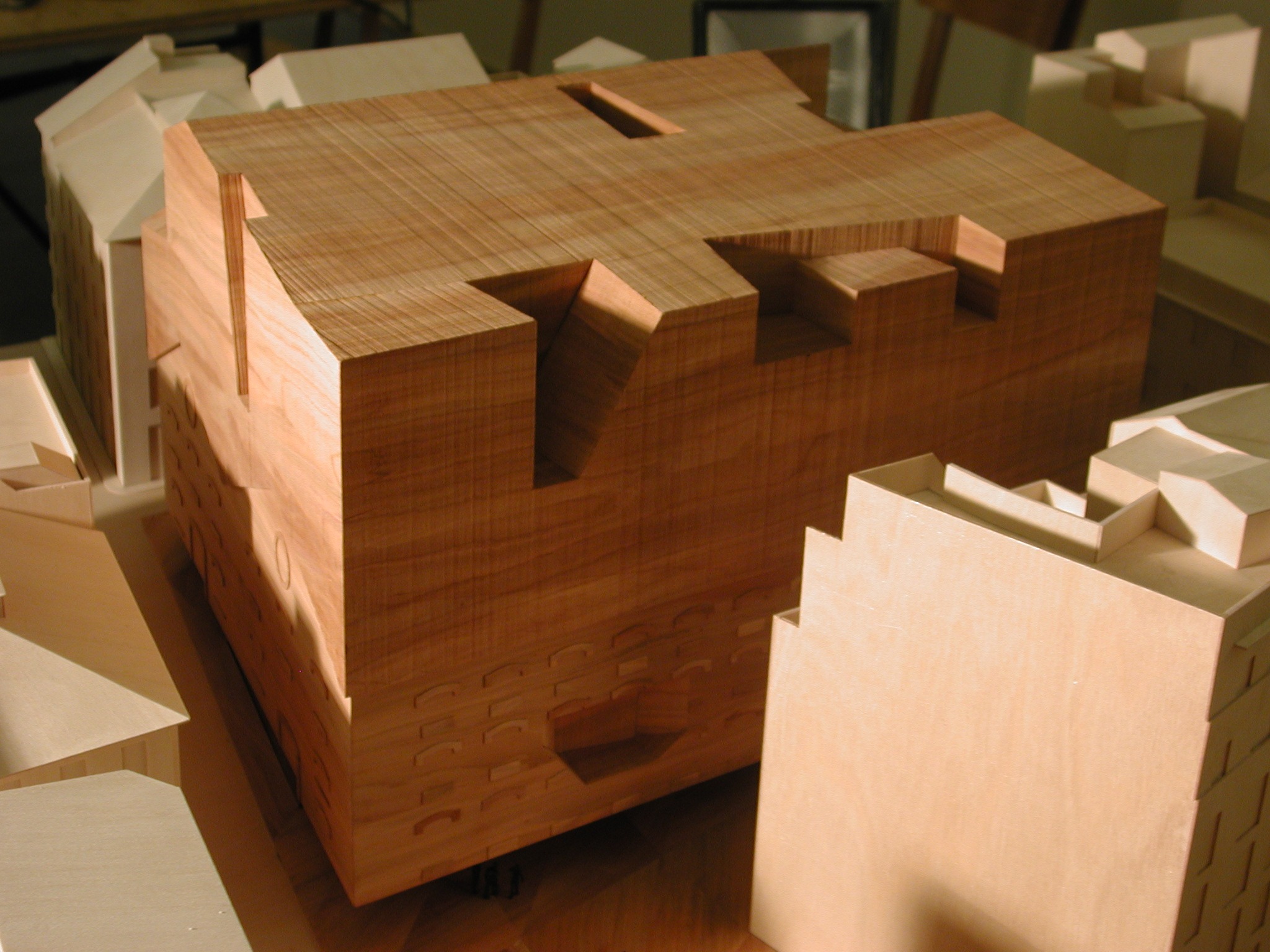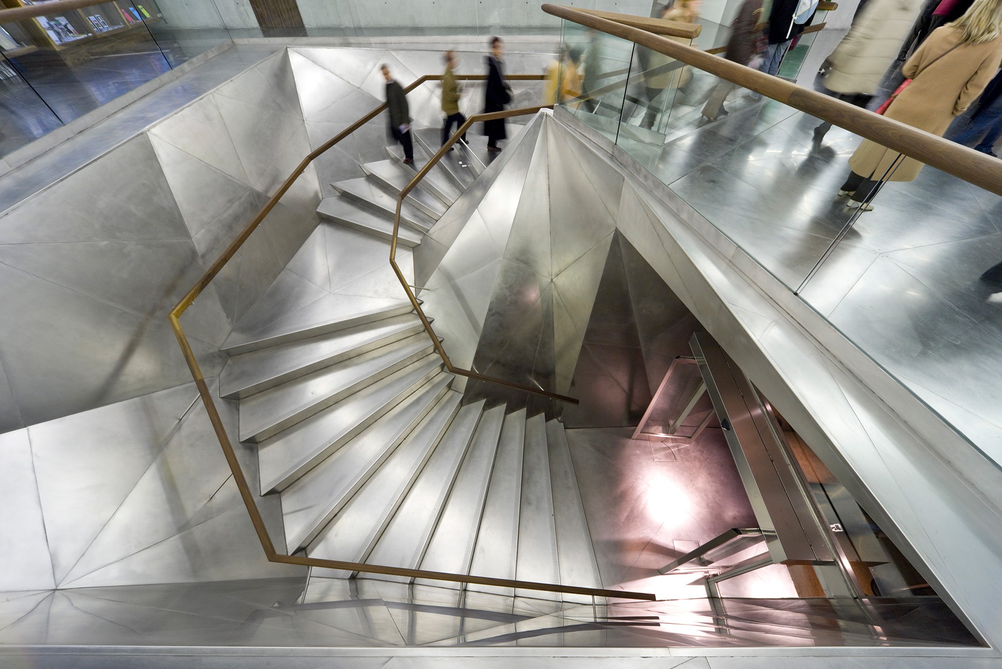 The separation of the structure from the ground level creates two worlds: one below and the other above the ground. The "underworld" buried beneath the topographically landscaped plaza provides space for a theater/auditorium, service rooms, and several parking spaces. The multi-storied building above ground houses the entrance lobby and galleries, a restaurant and administrative offices. There is a contrast between the flexible and loft-like character of the exhibition spaces and the spatial complexity of the top floor with its restaurant / bar and the offices. The surprising sculptural aspect of the CaixaForum’s silhouette is no mere architectural fancy, but reflects the roofscape of the surrounding buildings.