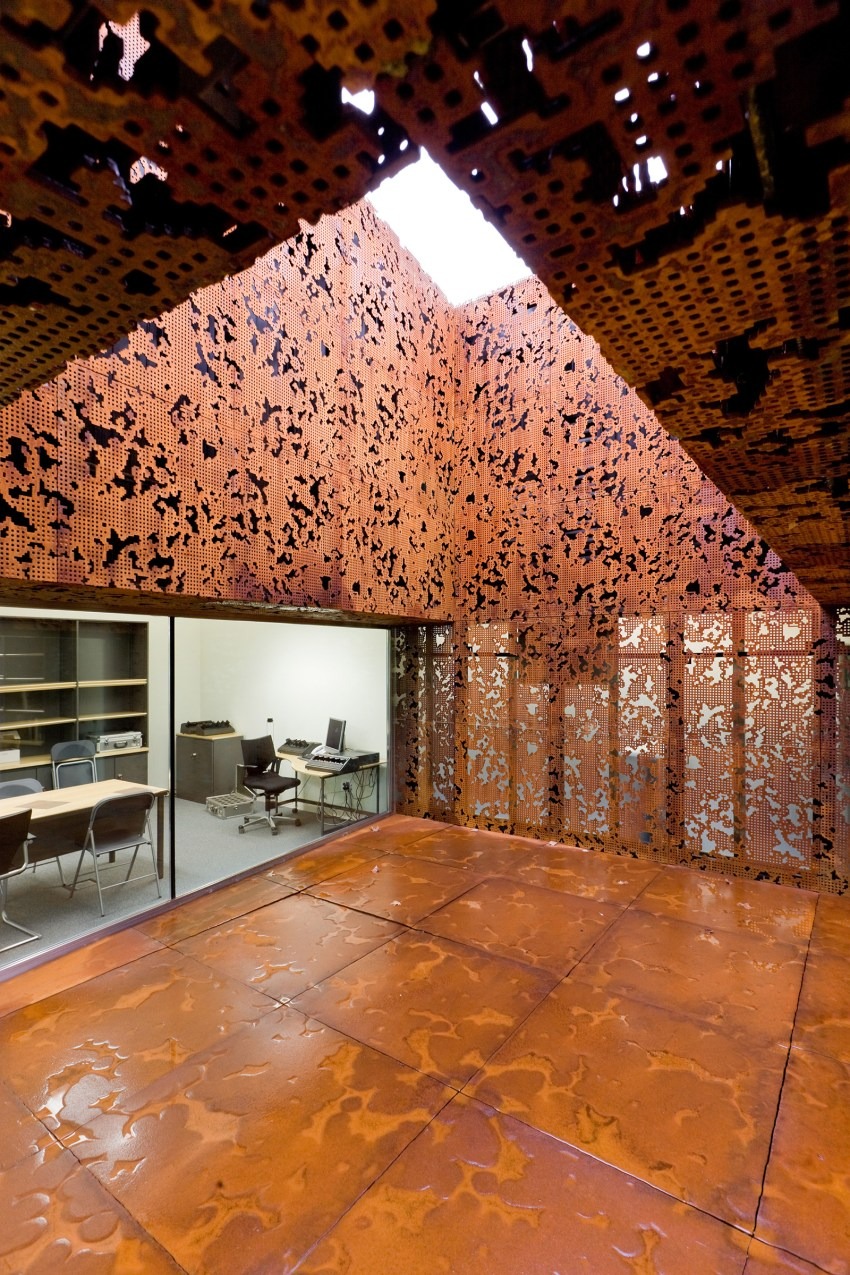 The only material of the old power station that we could use was the classified brick shell. In order to conceive and insert the new architectural components of the CaixaForum, we began with a surgical operation, separating and removing the base and the parts of the building no longer needed. This opened a completely novel and spectacular perspective that simultaneously solved a number of problems posed by the site. The removal of the base of the building left a covered plaza under the brick shell, which now appears to float above the street level. This sheltered space under the CaixaForum offers shade to visitors who want to spend time or meet outside, and at the same time, it is the entrance to the Forum itself. Problems such as the narrowness of the surrounding streets, the placement of the main entrance, and the architectural identity of this contemporary art institution are addressed and solved in a single urban and sculptural gesture.
