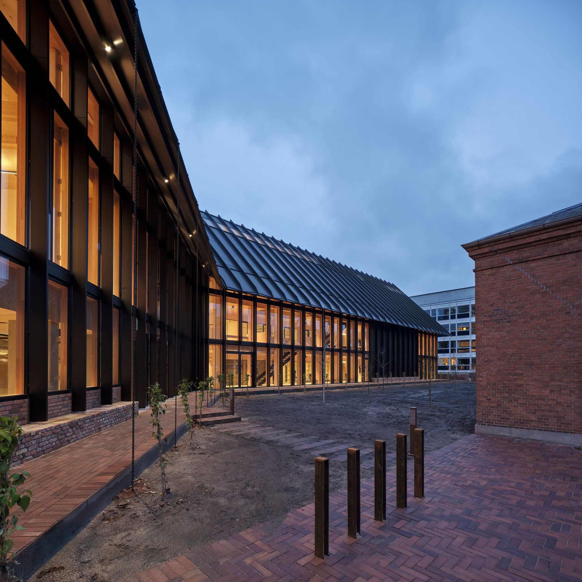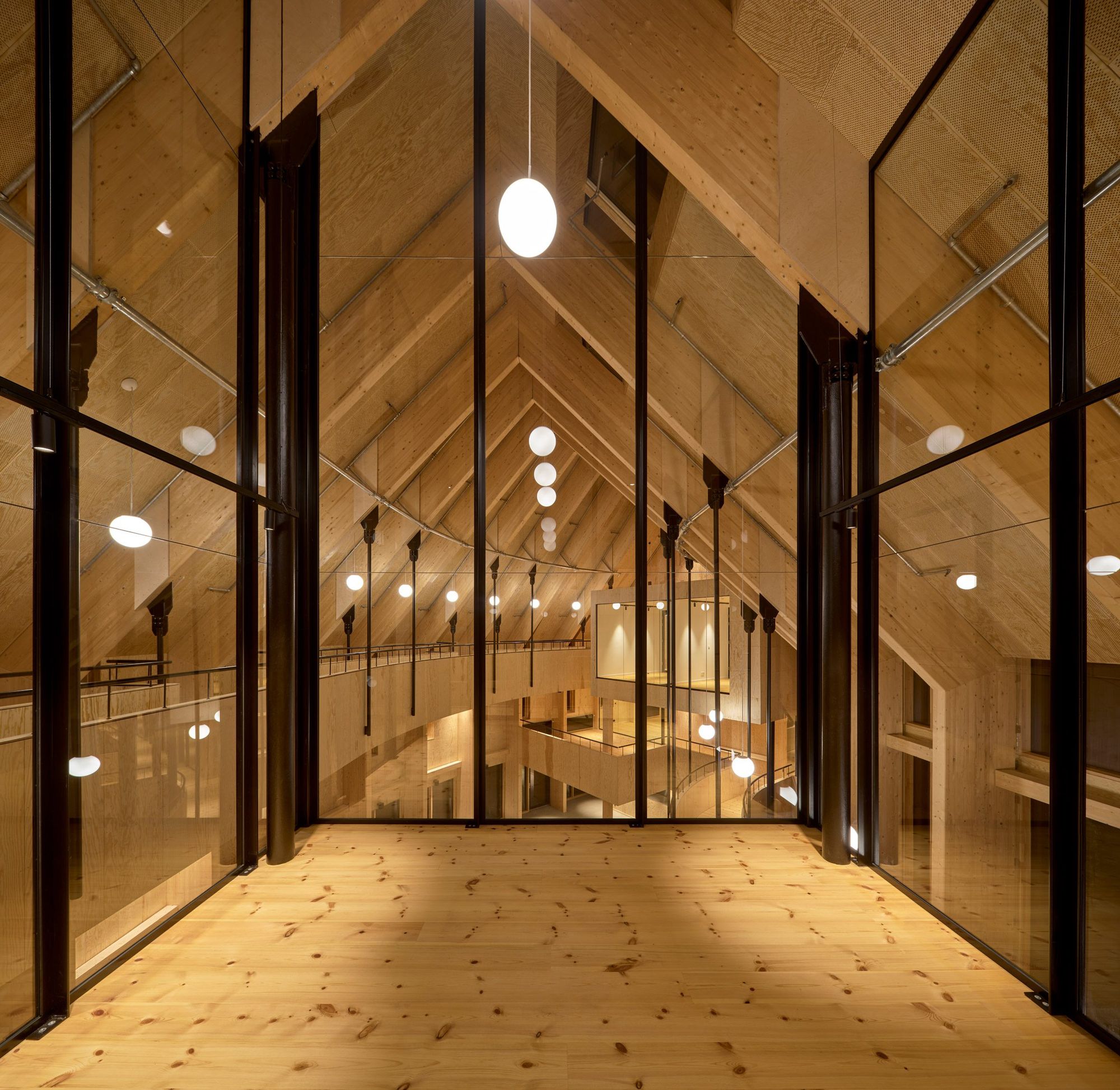Drawing inspiration from the gable motifs and saddle roofs characteristic of the area, Centre for Health reflects the diverse architectural heritage surrounding it and underlines the rhythm of the neighbouring buildings. However, while the building’s geometric form, materiality, and colour respectfully respond to the context, it simultaneously establishes a contemporary contrast, bridging past and the present. Centre for Health is shaped like a softly curved arch that opens towards a garden. Black-brown anodised aluminium sheets embrace and protect the interior spaces towards the street – like a protective skin pulled from the roof. On the garden side, the building opens with a full glass façade, inviting natural daylight and visually connecting the interior with the green outdoor spaces. 164 square metres of solar cells are seamlessly integrated into the roof, generating and restoring renewable energy for the building. From the outside, glimpses of the warm wooden interior create an inner glow which contributes to a welcoming atmosphere. The loadbearing glulam structure is a readable feature in the façade through deep slats, which offer protection from solar gain and contribute to water drainage.