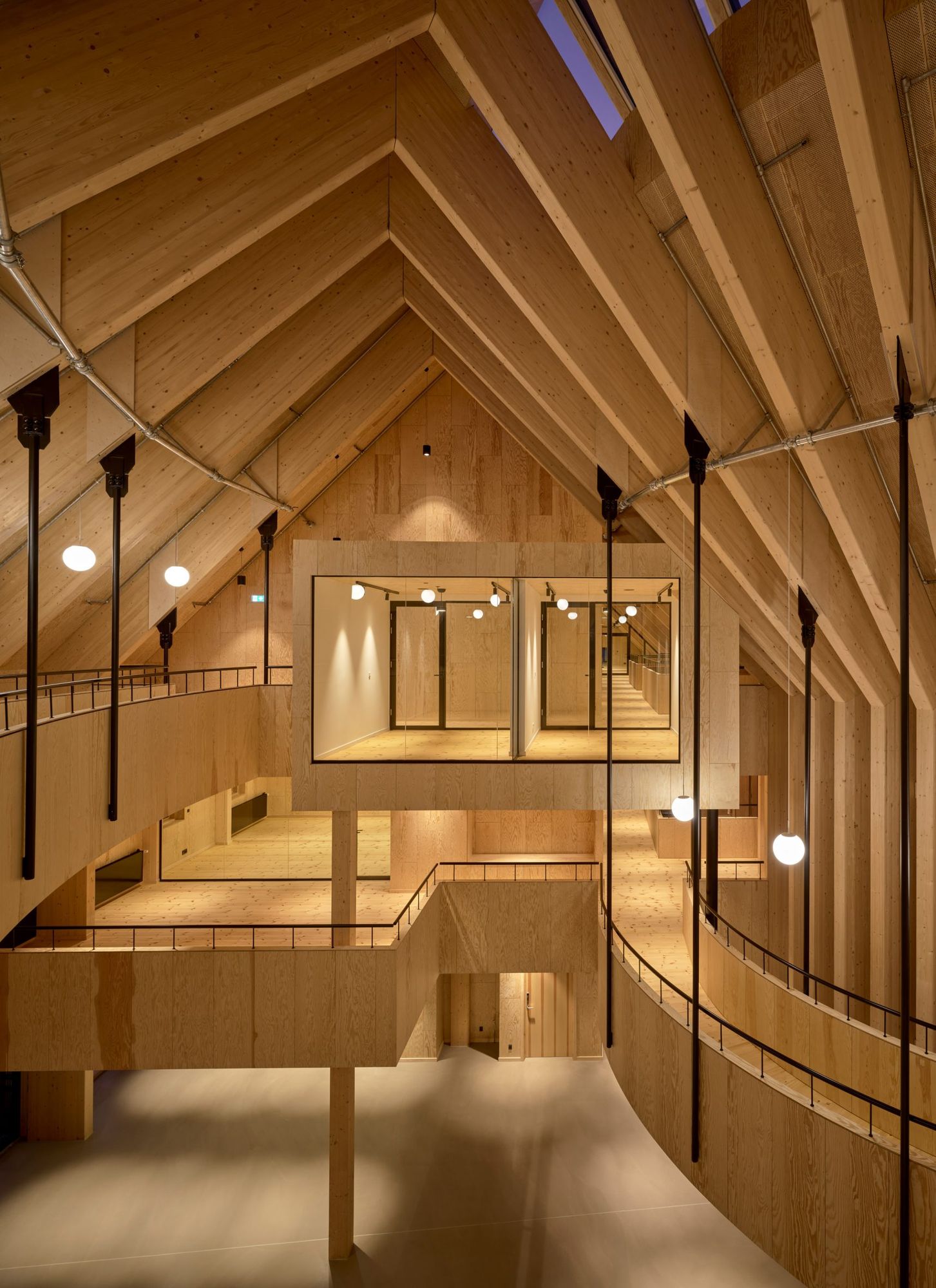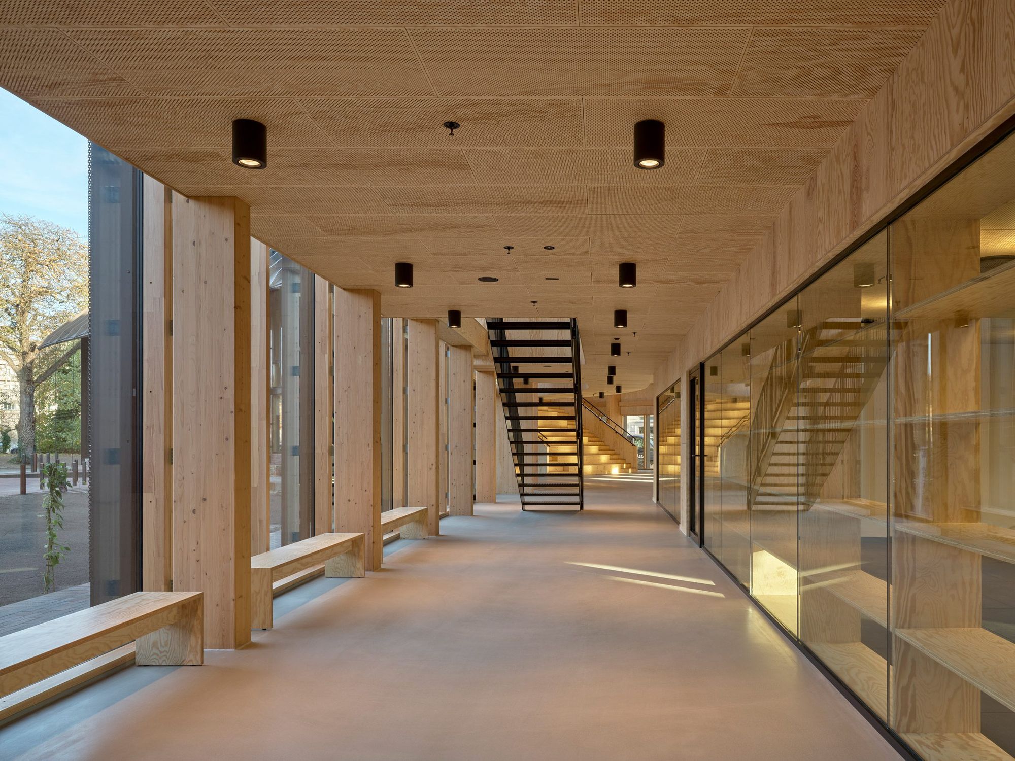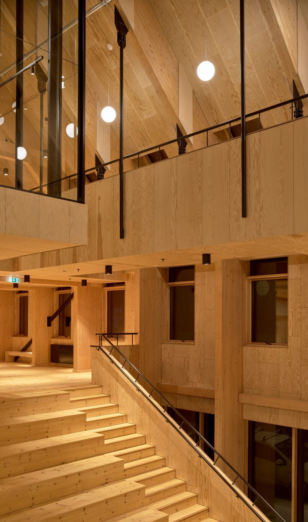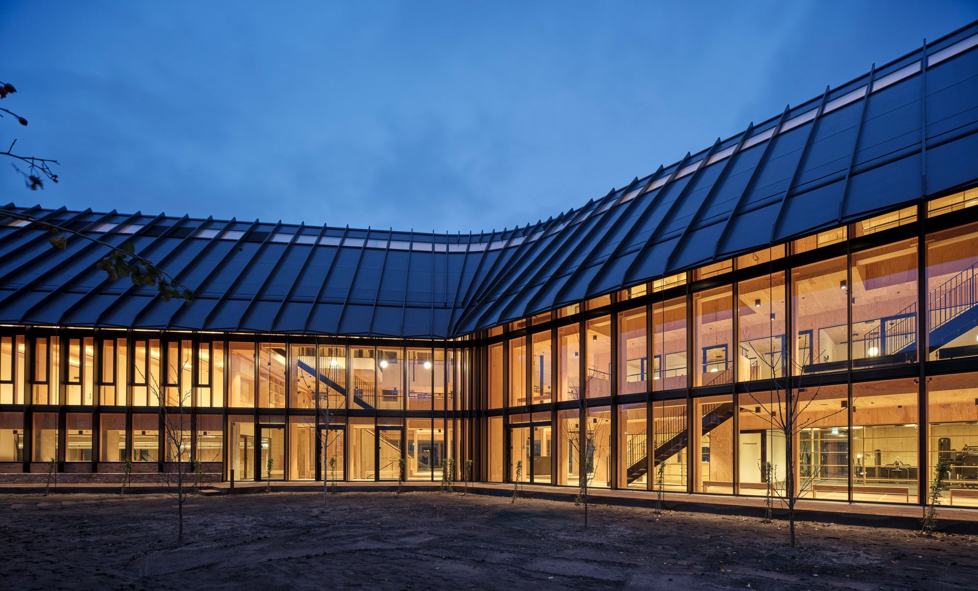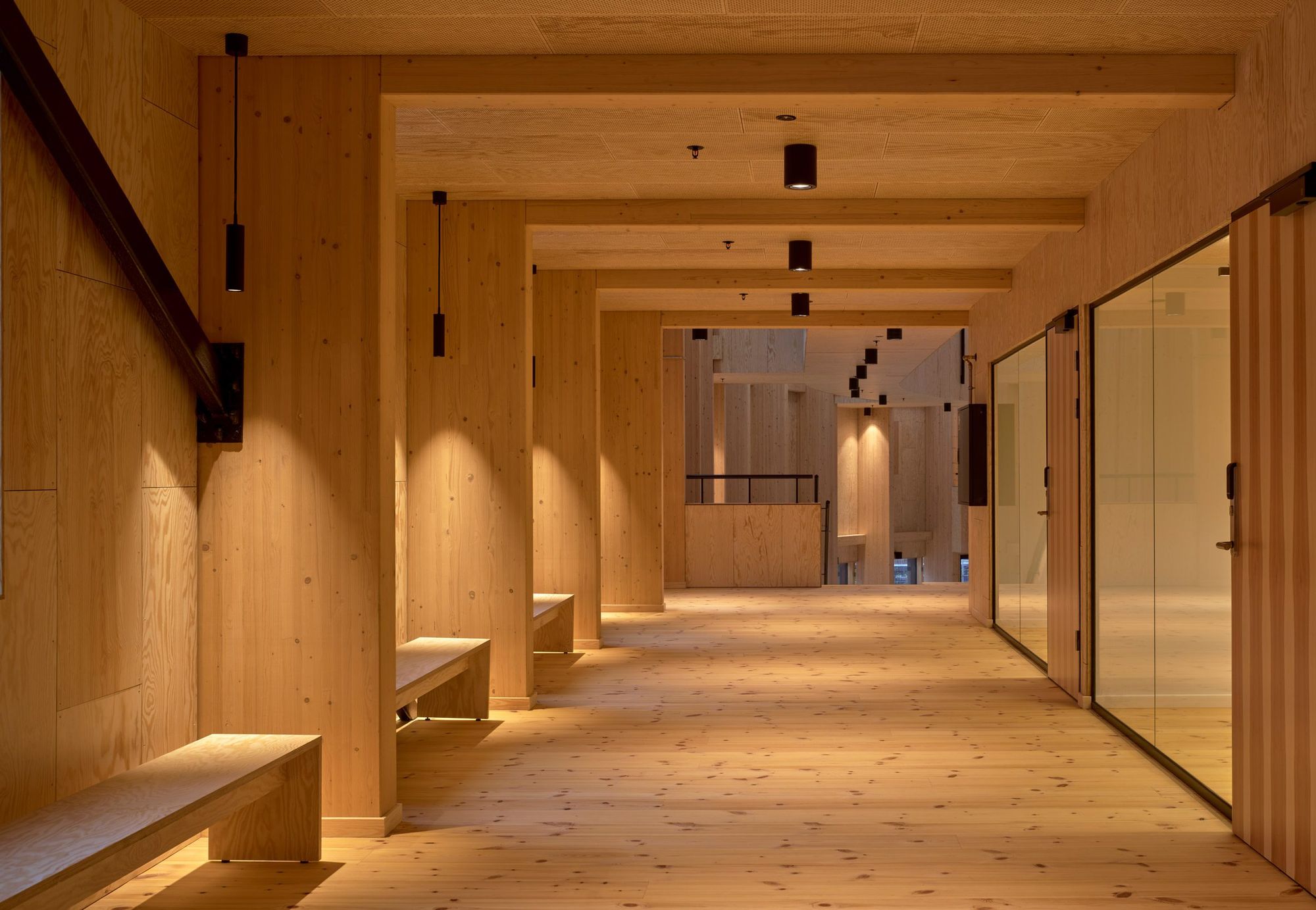 Warmth and homeliness permeate the interior spaces by the exposed plywood cladding on walls and ceiling – some perforated for acoustic regulations – chosen for its natural ability to breathe, provide comfort, enhance indoor quality, and reduce stress. Upon arrival, visitors are welcomed into an open atrium, shaped by the striking loadbearing structure consisting of 15-metre high three-hinged glulam arches. Known as the Heart Room, this central communal space connects to the building’s circulatory system and binds the various functions together. From here, there is access to classrooms, areas for physical training, consultation rooms, open meeting spaces, and a kitchen designed for healthy cooking workshops. A large wooden staircase with integrated seating forms a central meeting space within the Heart Room, where people can gather, interact, and engage in spontaneous, impromptu activities and social encounters. The interior spaces are illuminated by a gentle natural light influx from the large windows in the façades and roof which continuously offer new impressions throughout the day.