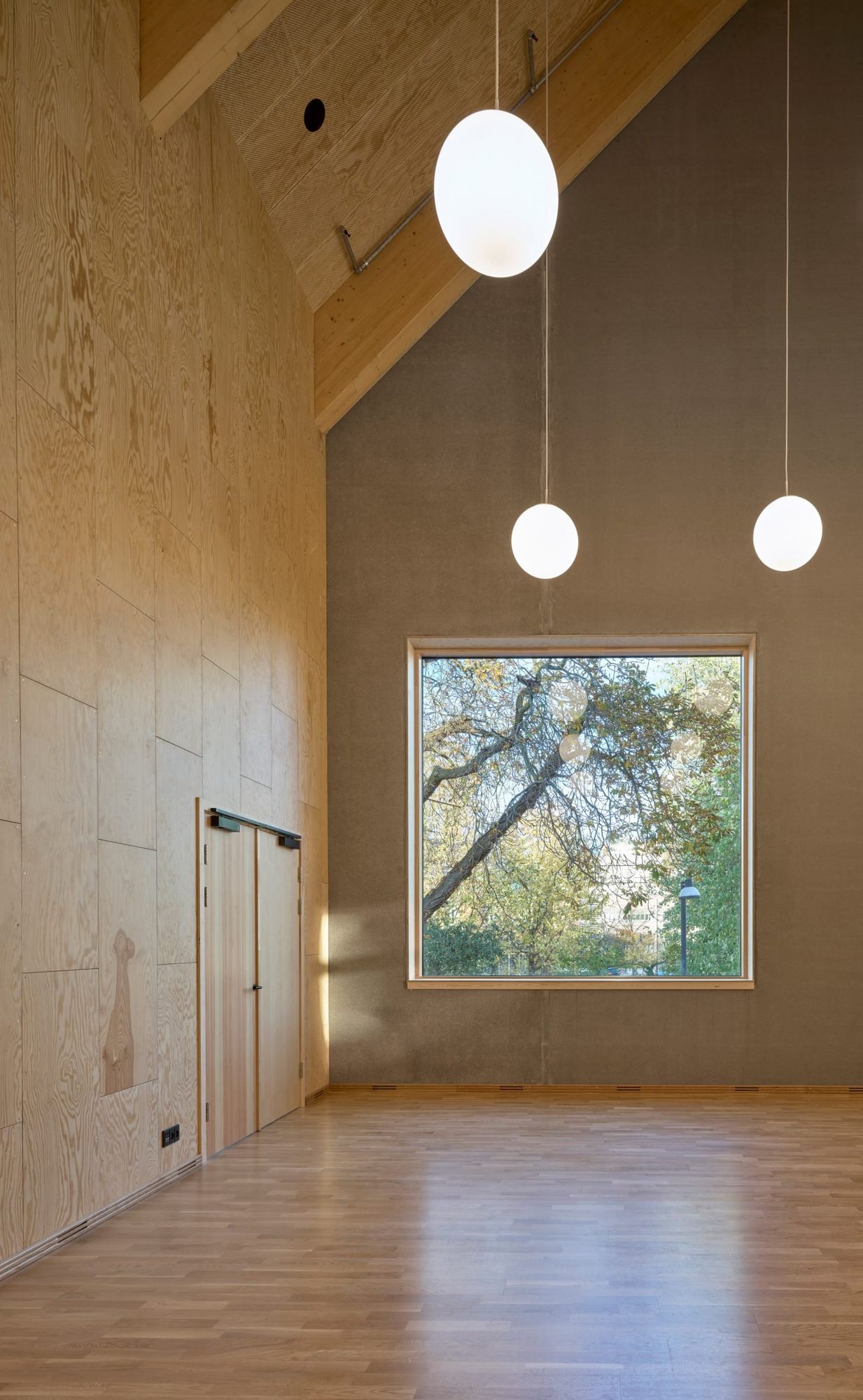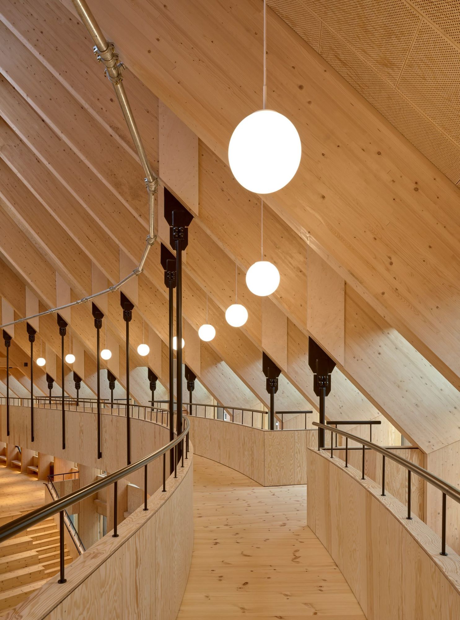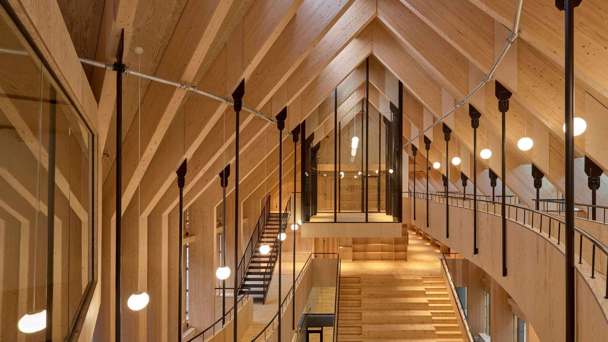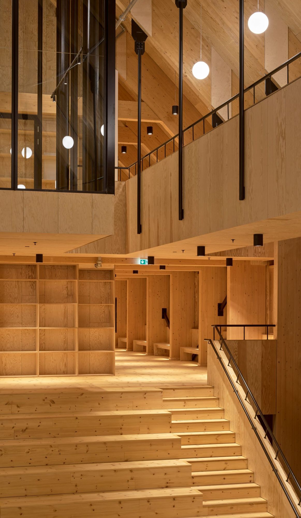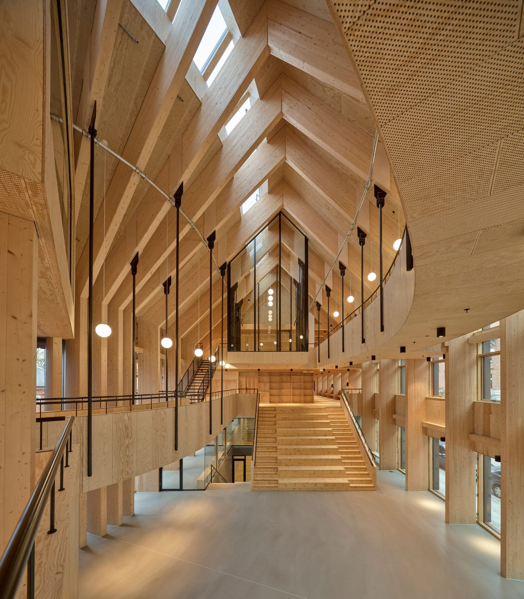 Warmth and homeliness permeate the interior spaces by the exposed plywood cladding on walls and ceiling – some perforated for acoustic regulations – chosen for its natural ability to breathe, provide comfort, enhance indoor quality, and reduce stress. Upon arrival, visitors are welcomed into an open atrium, shaped by the striking loadbearing structure consisting of 15-metre high three-hinged glulam arches. Known as the Heart Room, this central communal space connects to the building’s circulatory system and binds the various functions together. From here, there is access to classrooms, areas for physical training, consultation rooms, open meeting spaces, and a kitchen designed for healthy cooking workshops. A large wooden staircase with integrated seating forms a central meeting space within the Heart Room, where people can gather, interact, and engage in spontaneous, impromptu activities and social encounters. The interior spaces are illuminated by a gentle natural light influx from the large windows in the façades and roof which continuously offer new impressions throughout the day.