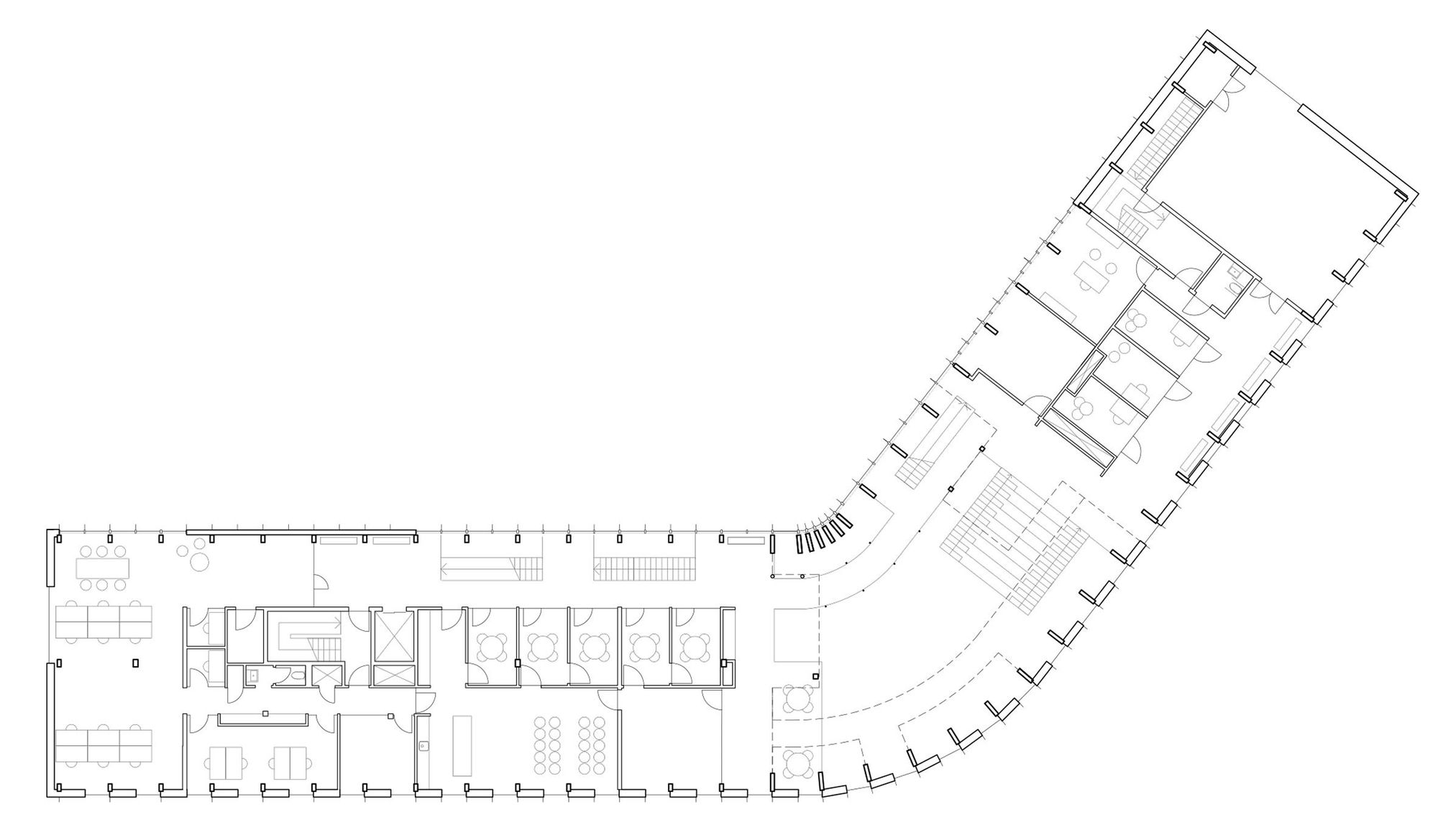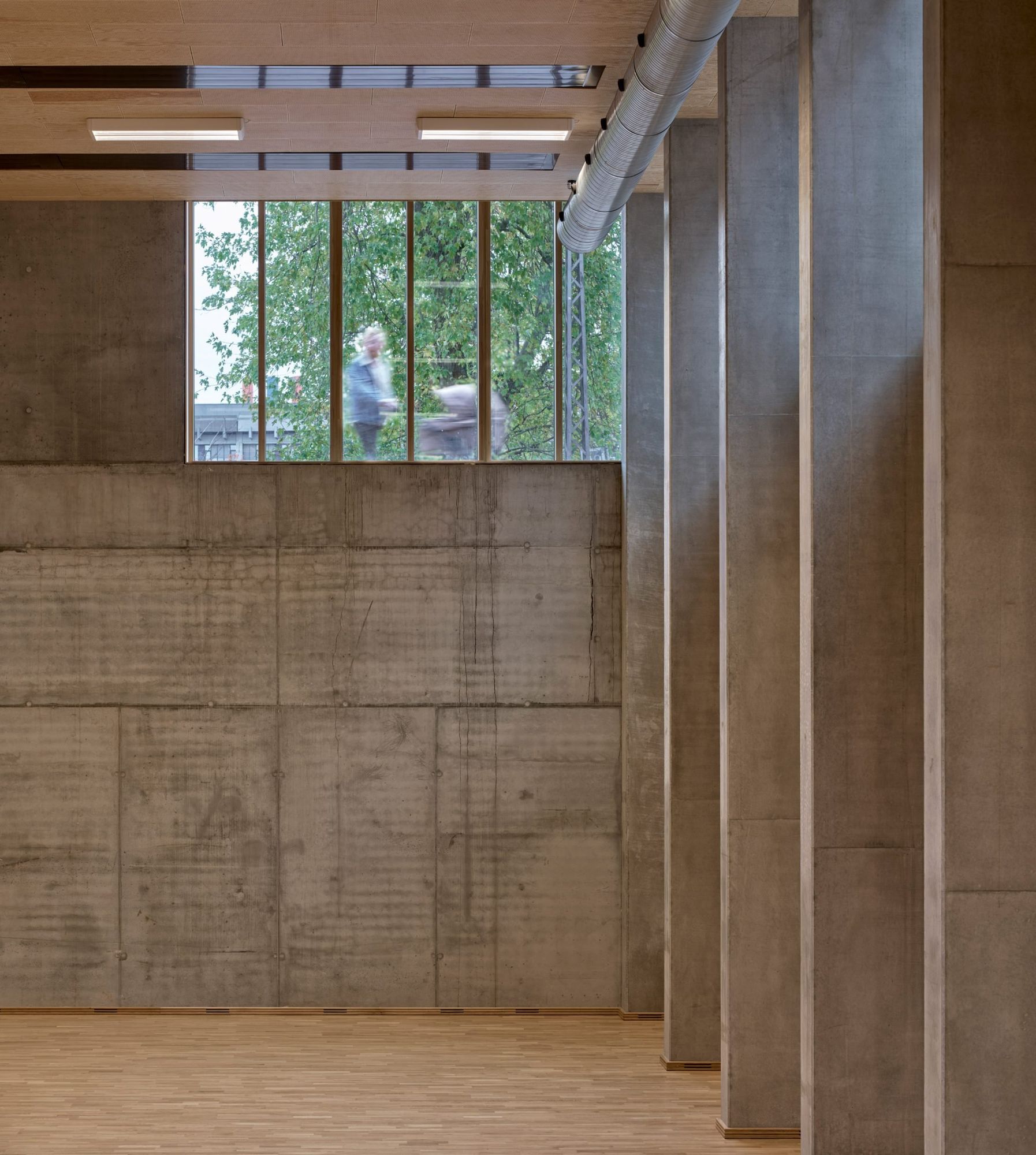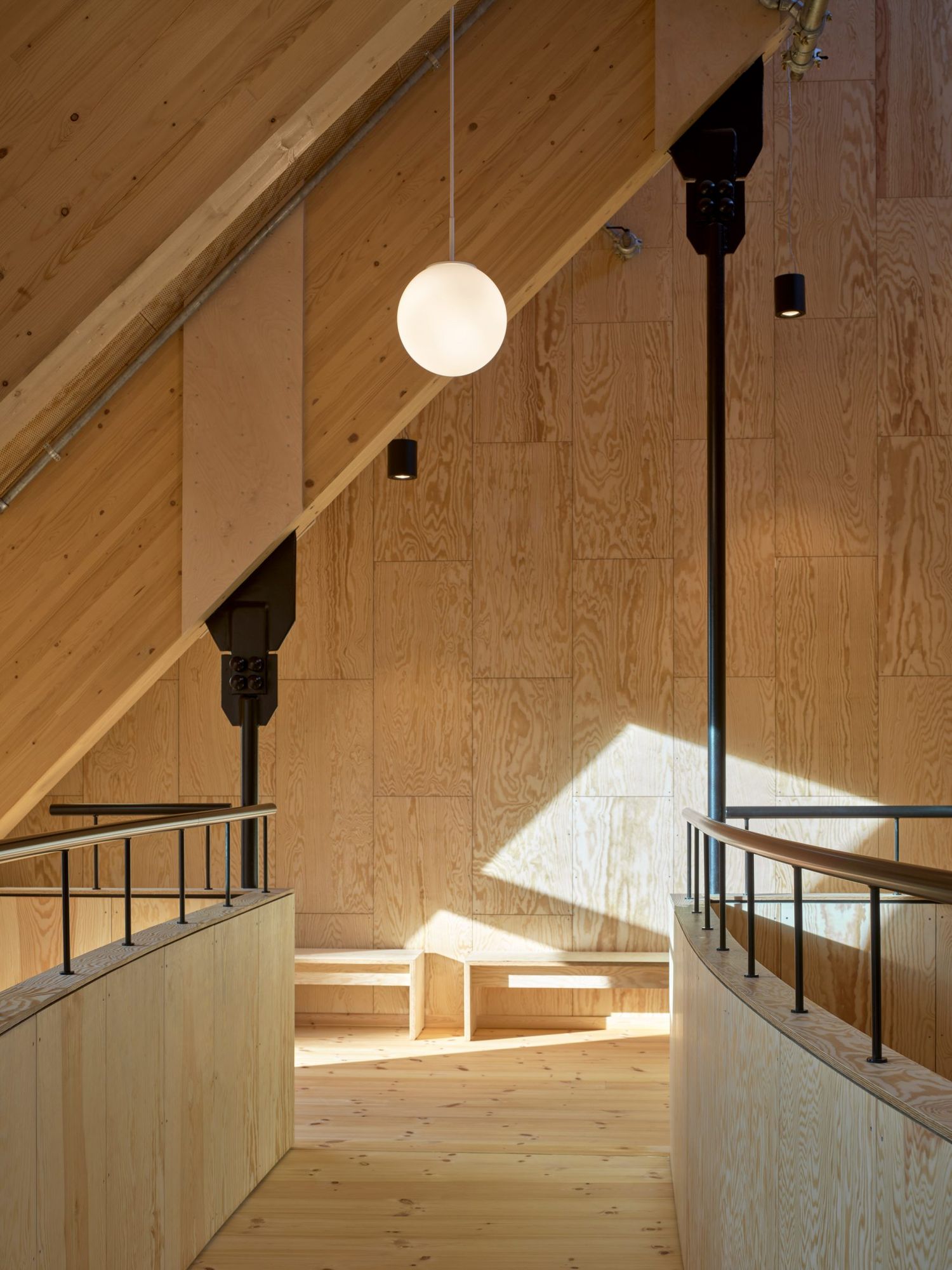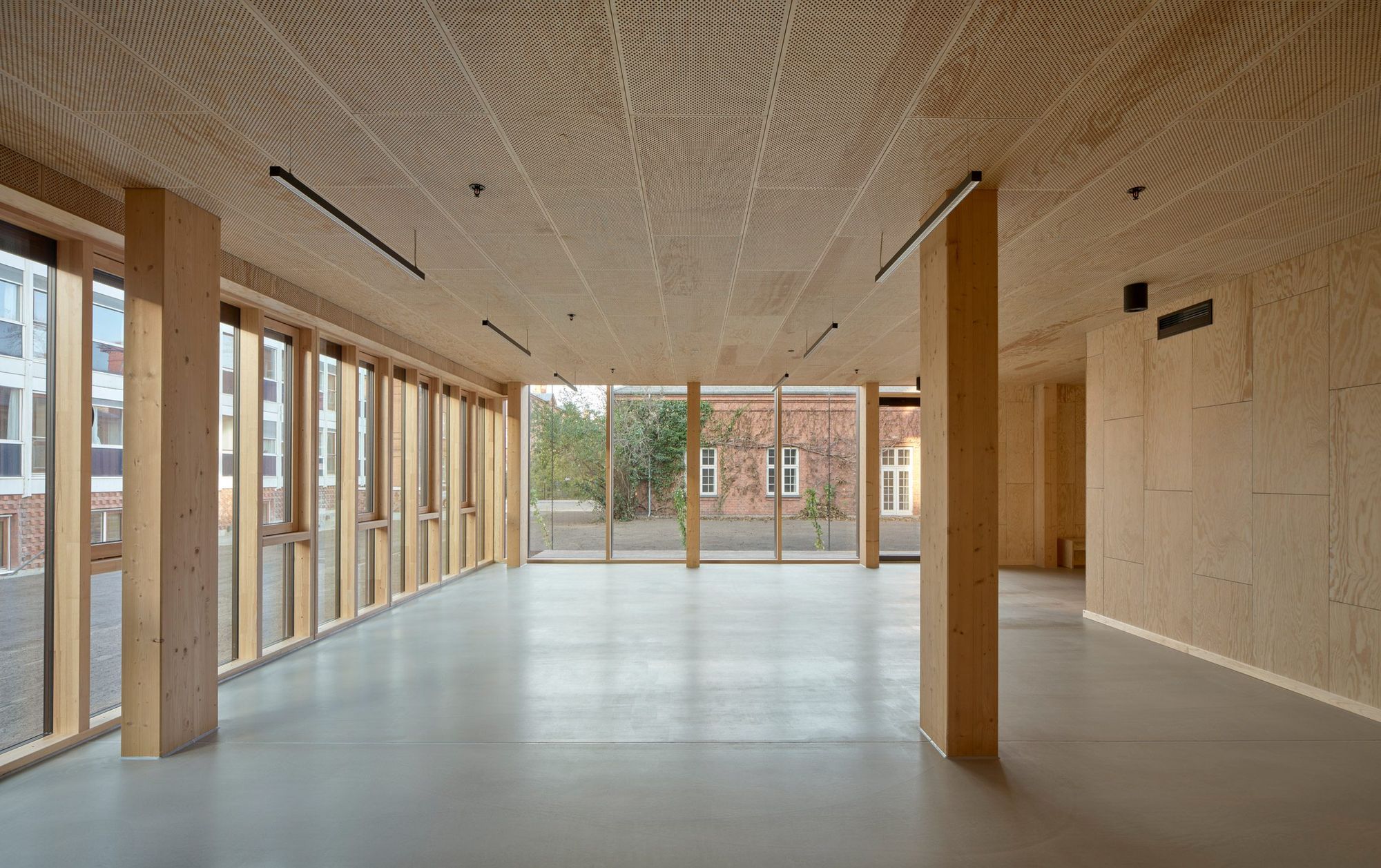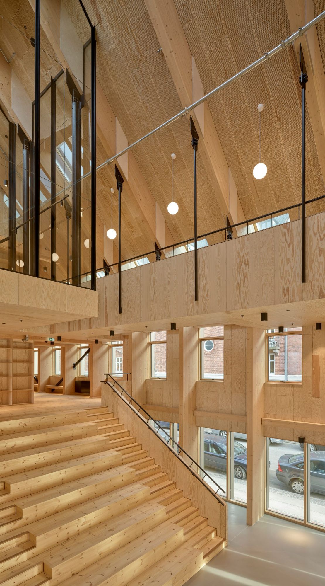 Warmth and homeliness permeate the interior spaces by the exposed plywood cladding on walls and ceiling – some perforated for acoustic regulations – chosen for its natural ability to breathe, provide comfort, enhance indoor quality, and reduce stress. Upon arrival, visitors are welcomed into an open atrium, shaped by the striking loadbearing structure consisting of 15-metre high three-hinged glulam arches. Known as the Heart Room, this central communal space connects to the building’s circulatory system and binds the various functions together. From here, there is access to classrooms, areas for physical training, consultation rooms, open meeting spaces, and a kitchen designed for healthy cooking workshops. A large wooden staircase with integrated seating forms a central meeting space within the Heart Room, where people can gather, interact, and engage in spontaneous, impromptu activities and social encounters. The interior spaces are illuminated by a gentle natural light influx from the large windows in the façades and roof which continuously offer new impressions throughout the day.