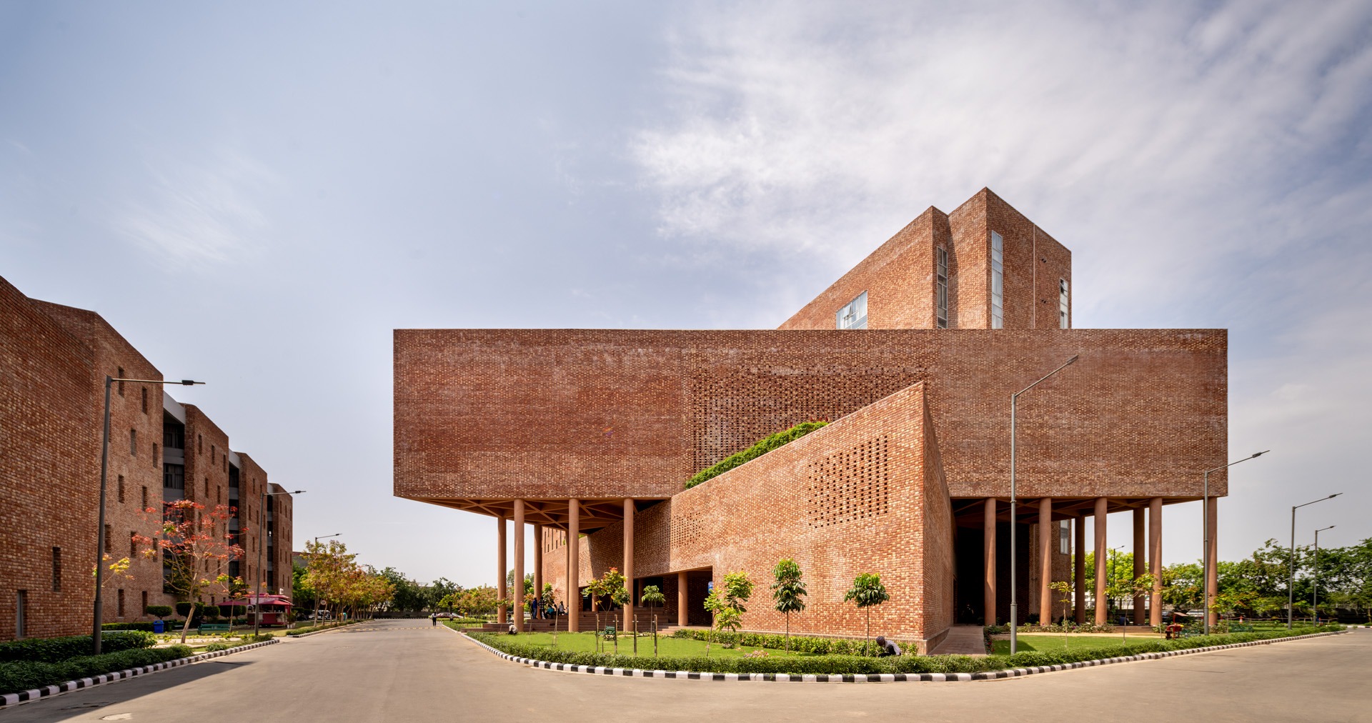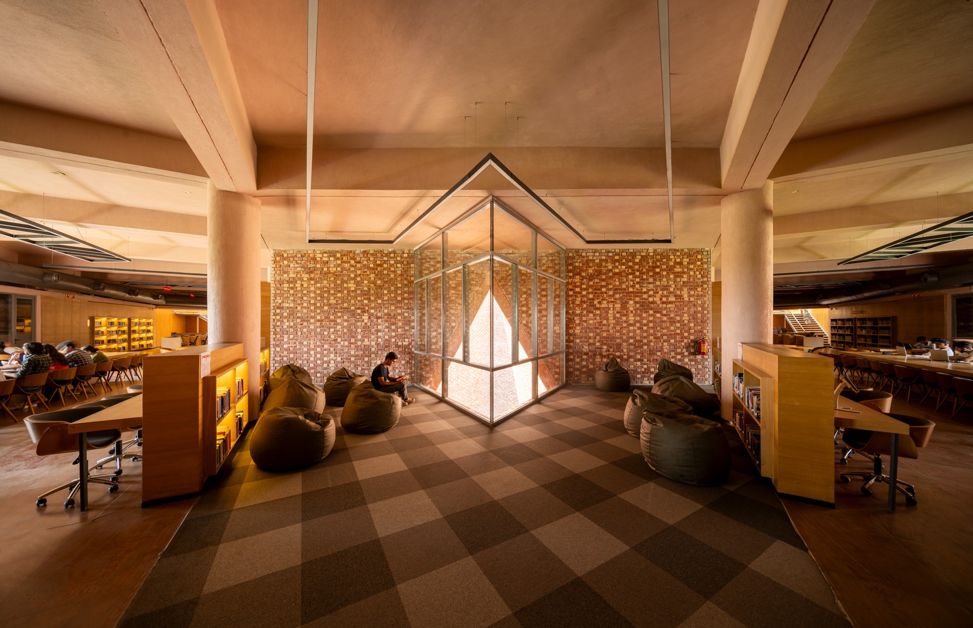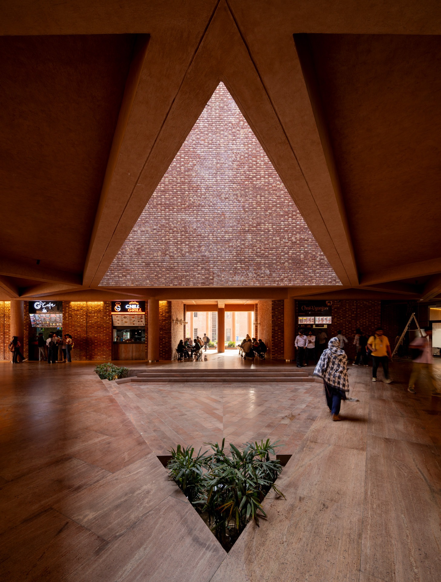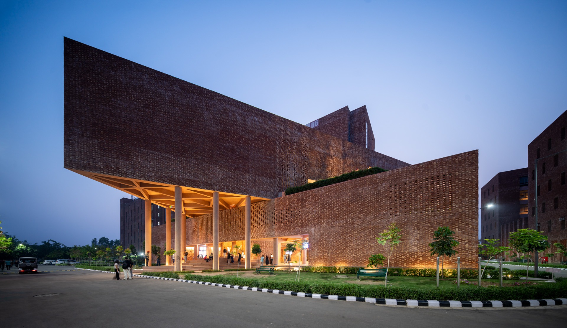 Chandigarh University D6 is a 94,000 sq.ft. multi-utility building serving over 7,000 students in Mohali. It integrates a cafeteria, library, and guest house within a unified structure composed of two interlocked triangular prisms and a cuboid. Building is vertically zoned: ground and first floors host dining and retail; second and third house double-height library; upper levels accommodate a guest house. steel-reinforced RCC structure allows for cantilevers and open planning. Exposed brick in Flemish bond, perforated jaalis, & red granite flooring ground building in regional materiality while ensuring ventilation, durability, thermal comfort
