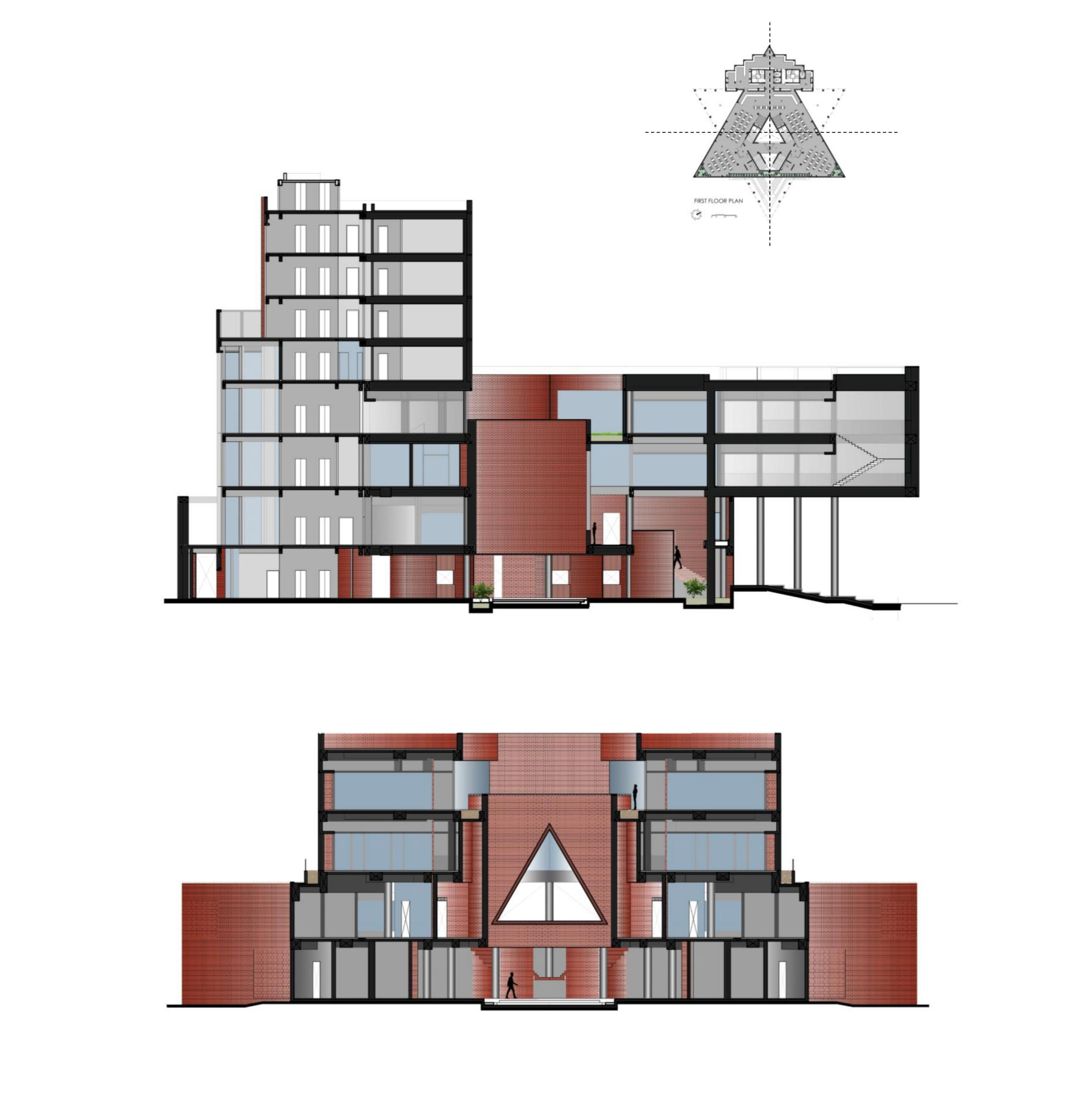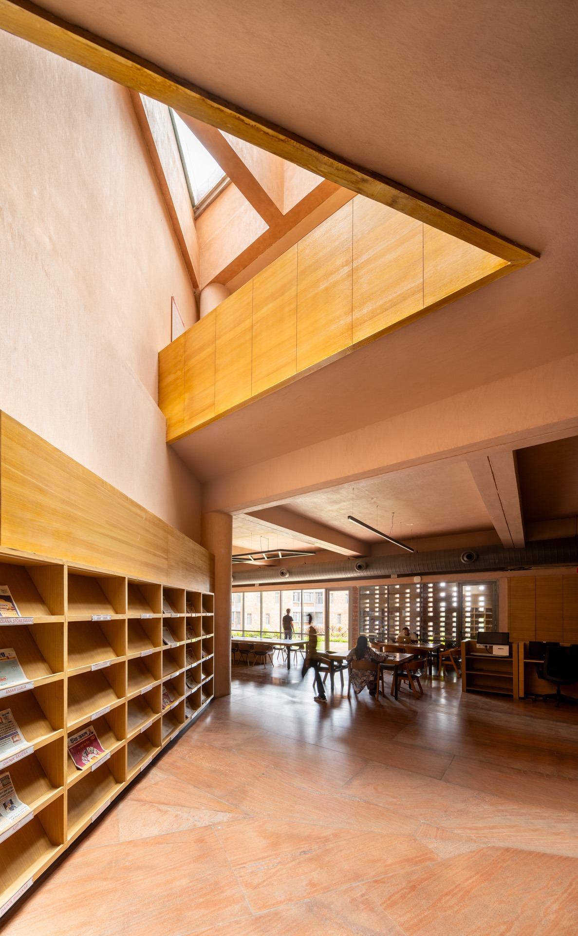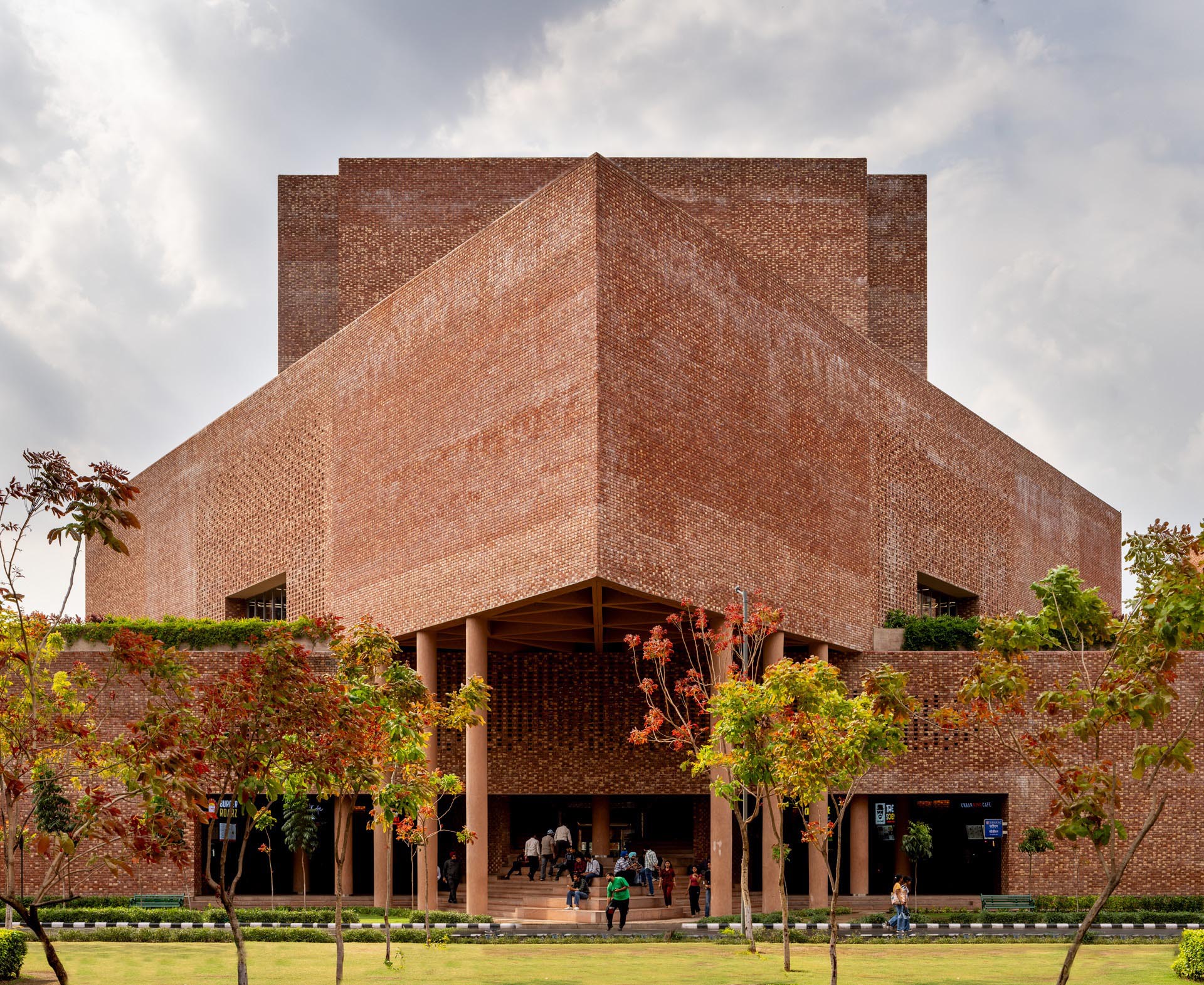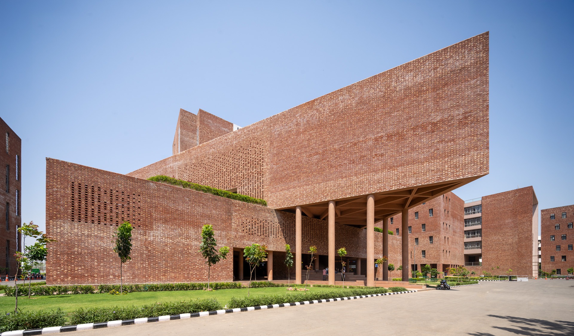 Chandigarh University D6 is a 94,000 sq.ft. multi-utility building serving over 7,000 students in Mohali. It integrates a cafeteria, library, and guest house within a unified structure composed of two interlocked triangular prisms and a cuboid. Building is vertically zoned: ground and first floors host dining and retail; second and third house double-height library; upper levels accommodate a guest house. steel-reinforced RCC structure allows for cantilevers and open planning. Exposed brick in Flemish bond, perforated jaalis, & red granite flooring ground building in regional materiality while ensuring ventilation, durability, thermal comfort