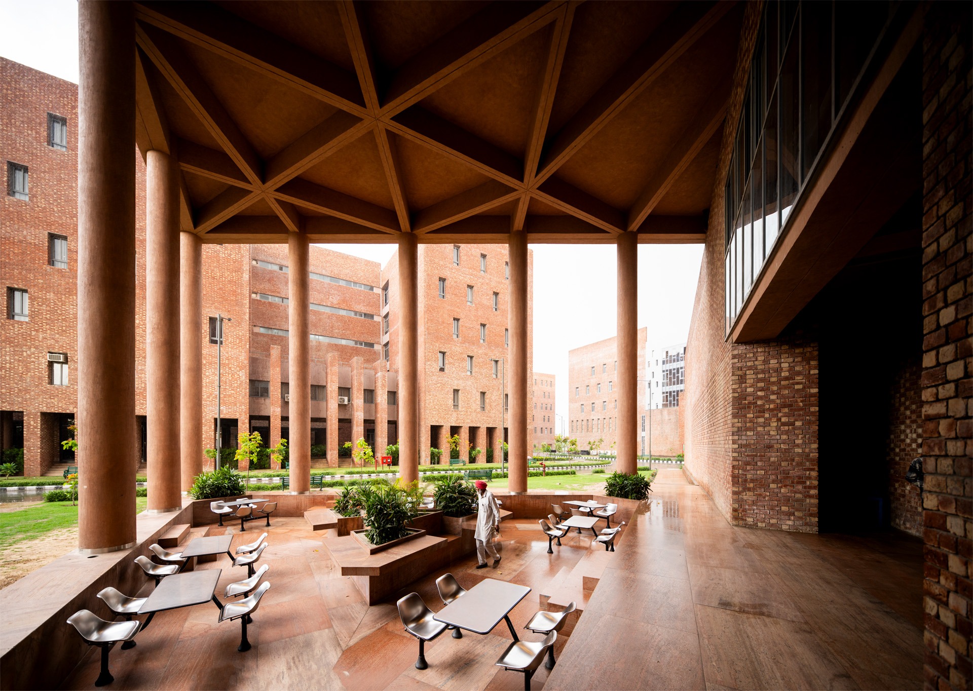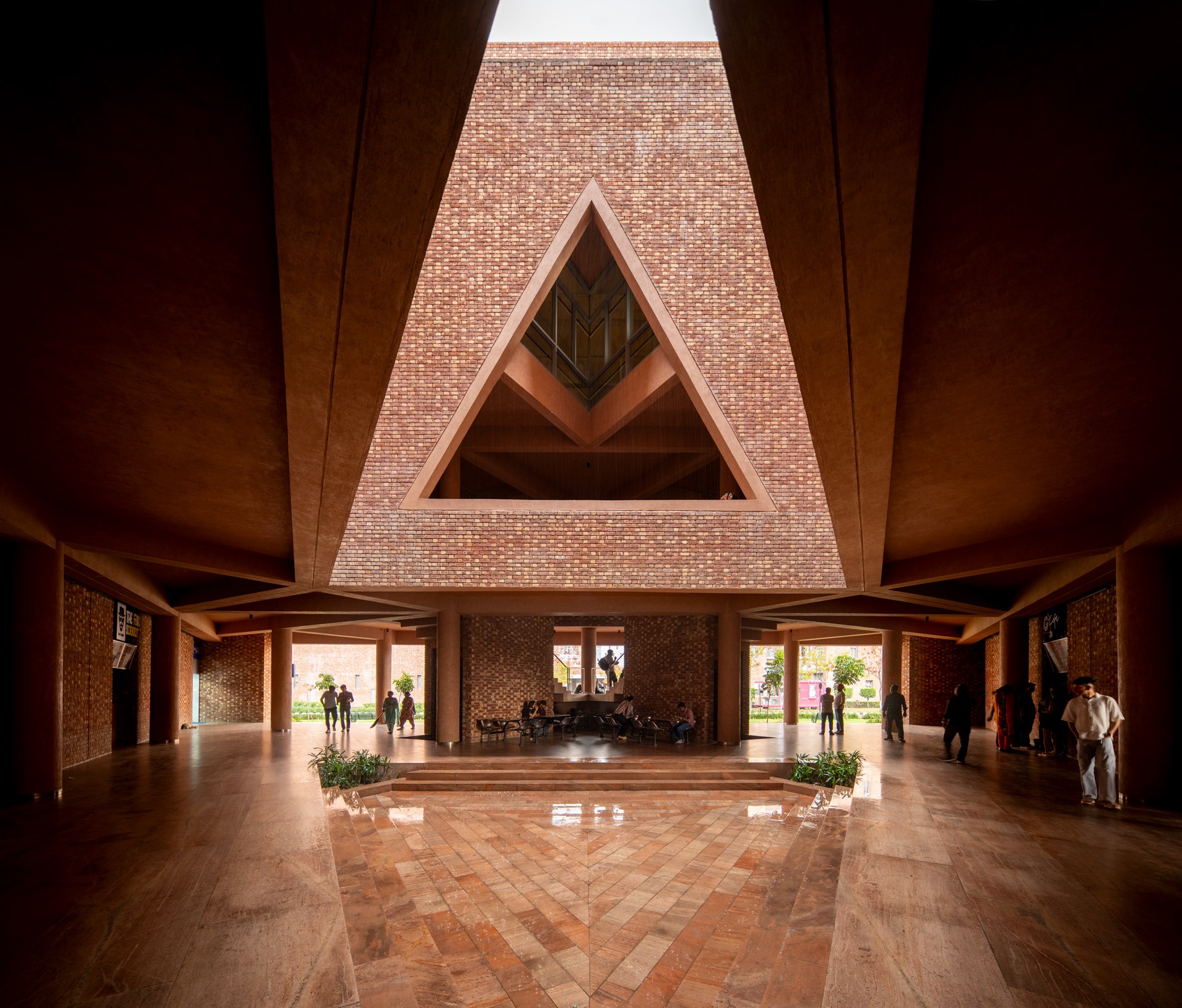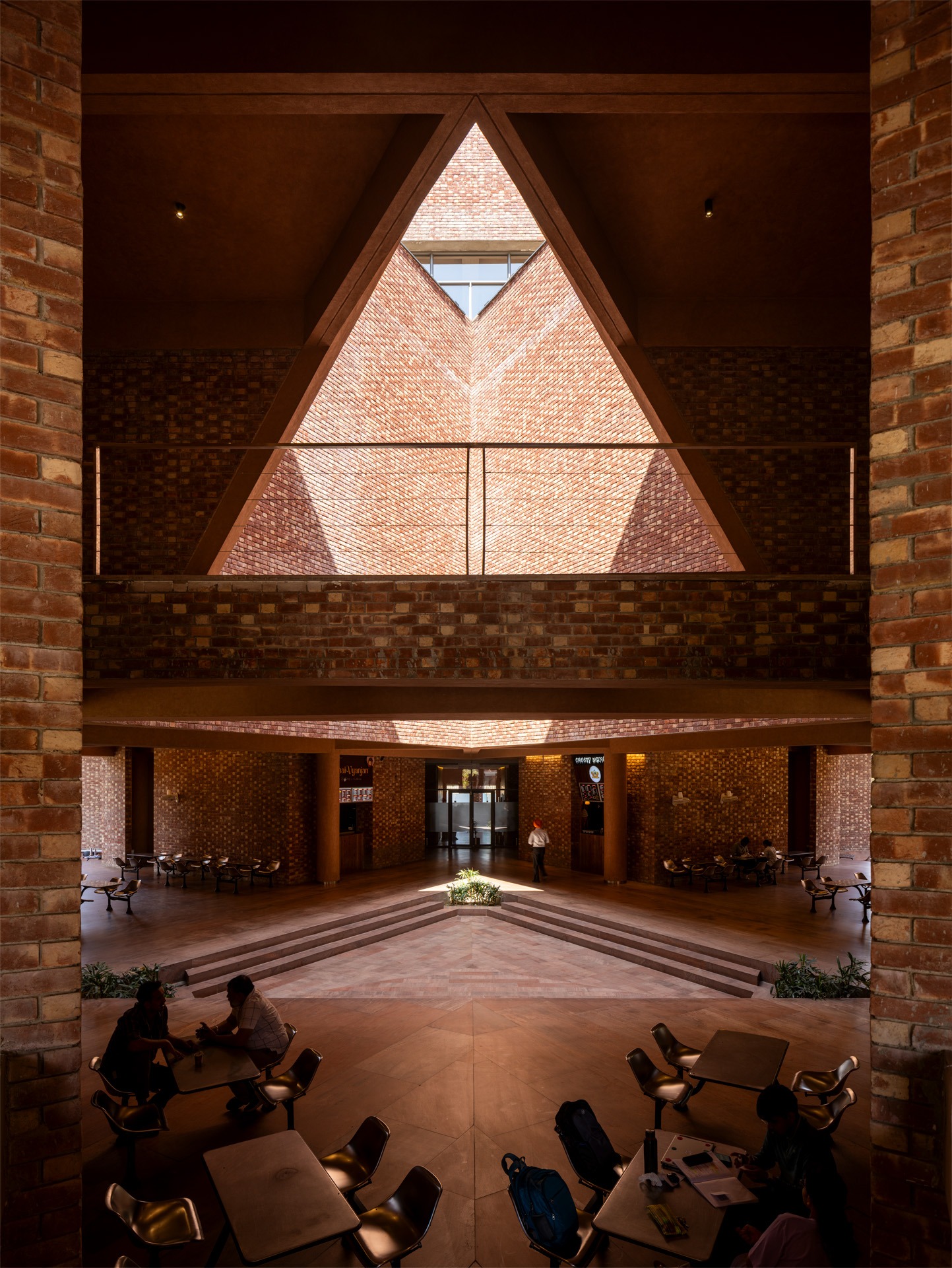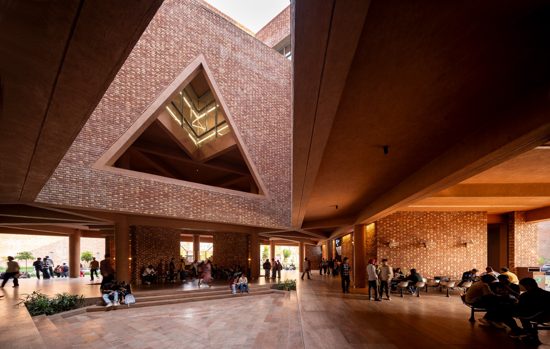 The triangular volumes generate large overhangs, shaded recesses, and cut-outs, promoting thermal comfort while creating incidental gathering spaces. On the ground level, the absence of enclosing walls results in an amorphous, open-plan configuration that fosters transparency, fluid movement, and informal social interactions—aligning with the ethos of a participatory campus life.