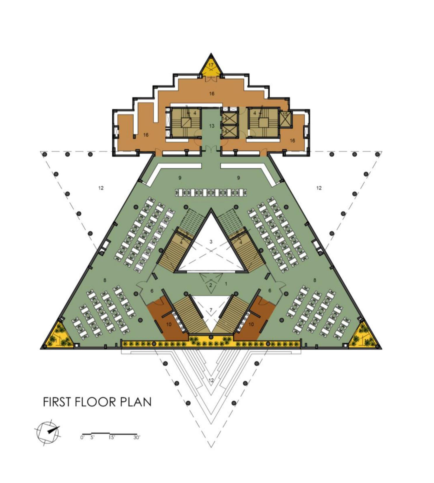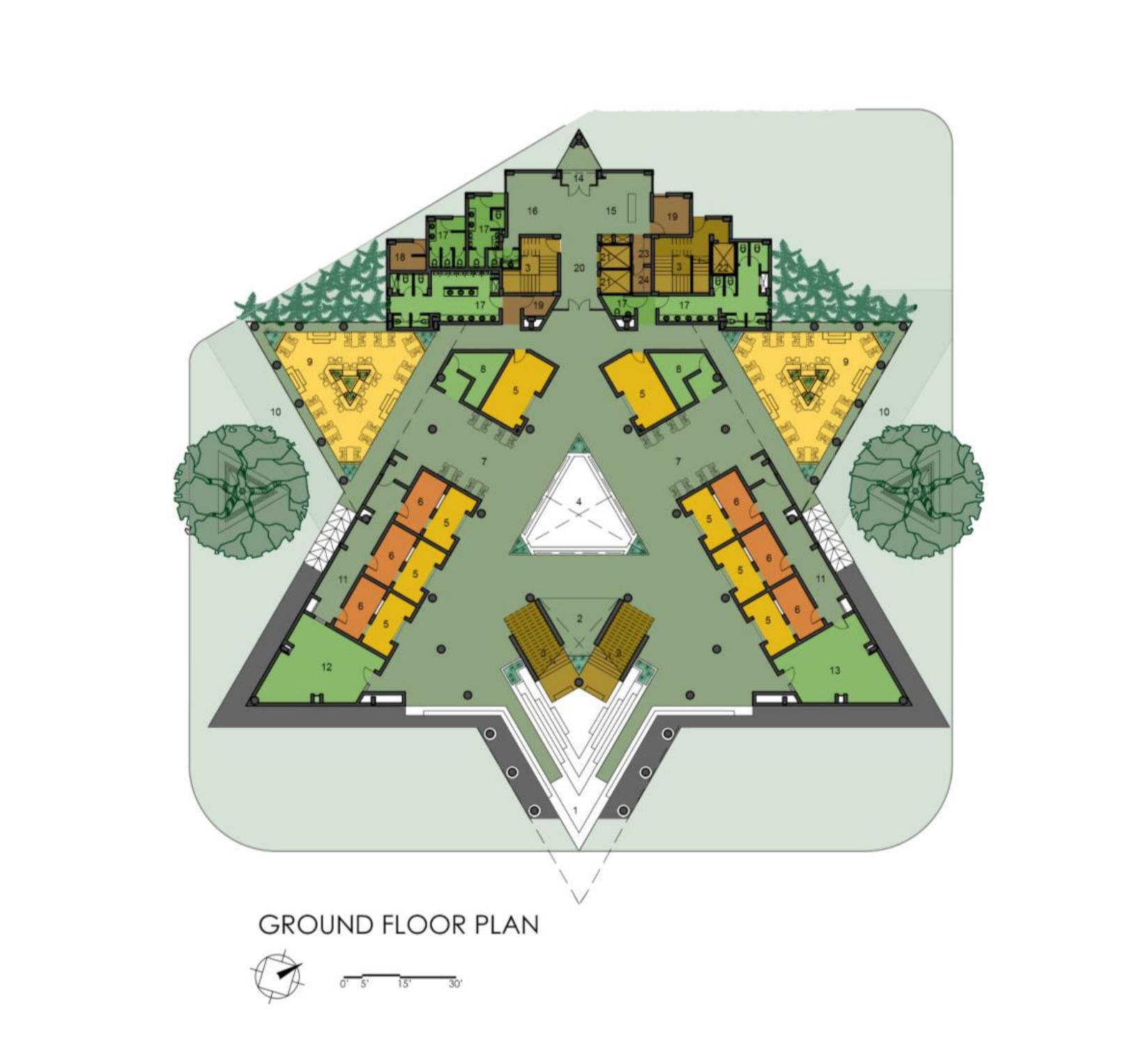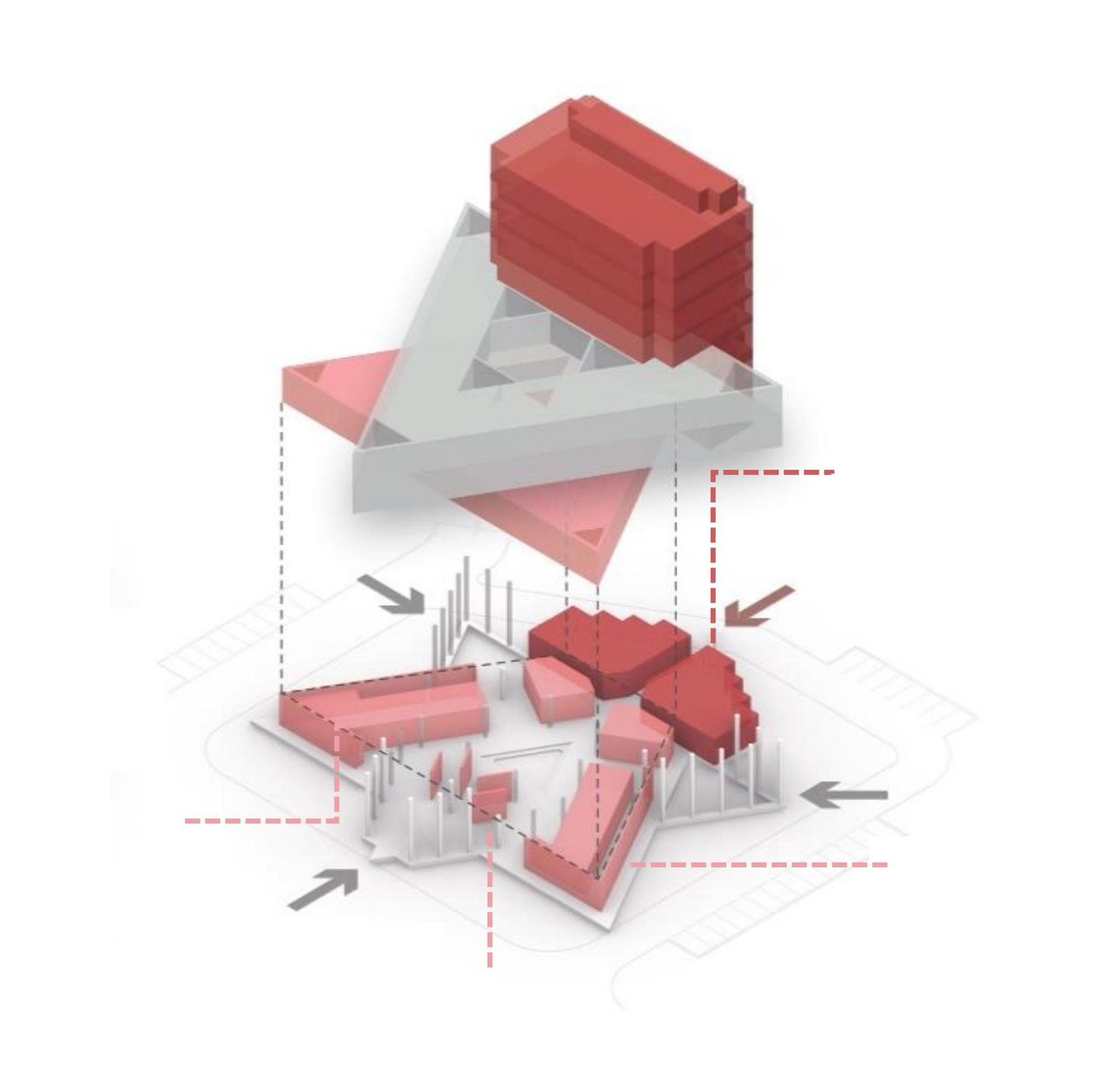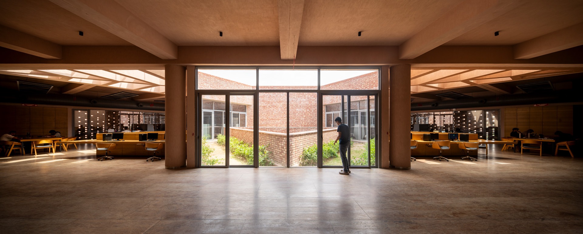 The triangular volumes generate large overhangs, shaded recesses, and cut-outs, promoting thermal comfort while creating incidental gathering spaces. On the ground level, the absence of enclosing walls results in an amorphous, open-plan configuration that fosters transparency, fluid movement, and informal social interactions—aligning with the ethos of a participatory campus life.
