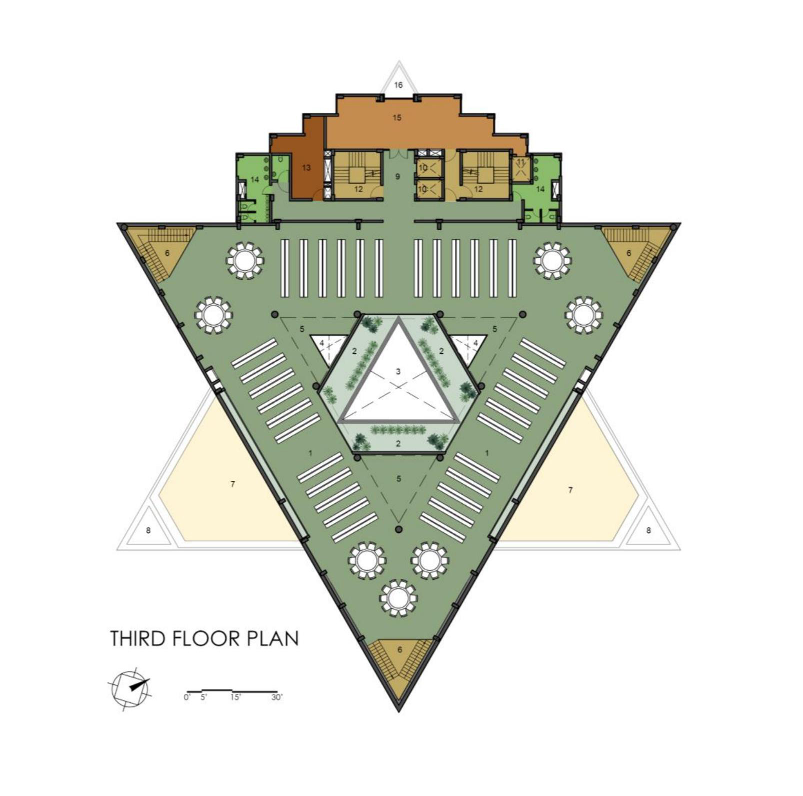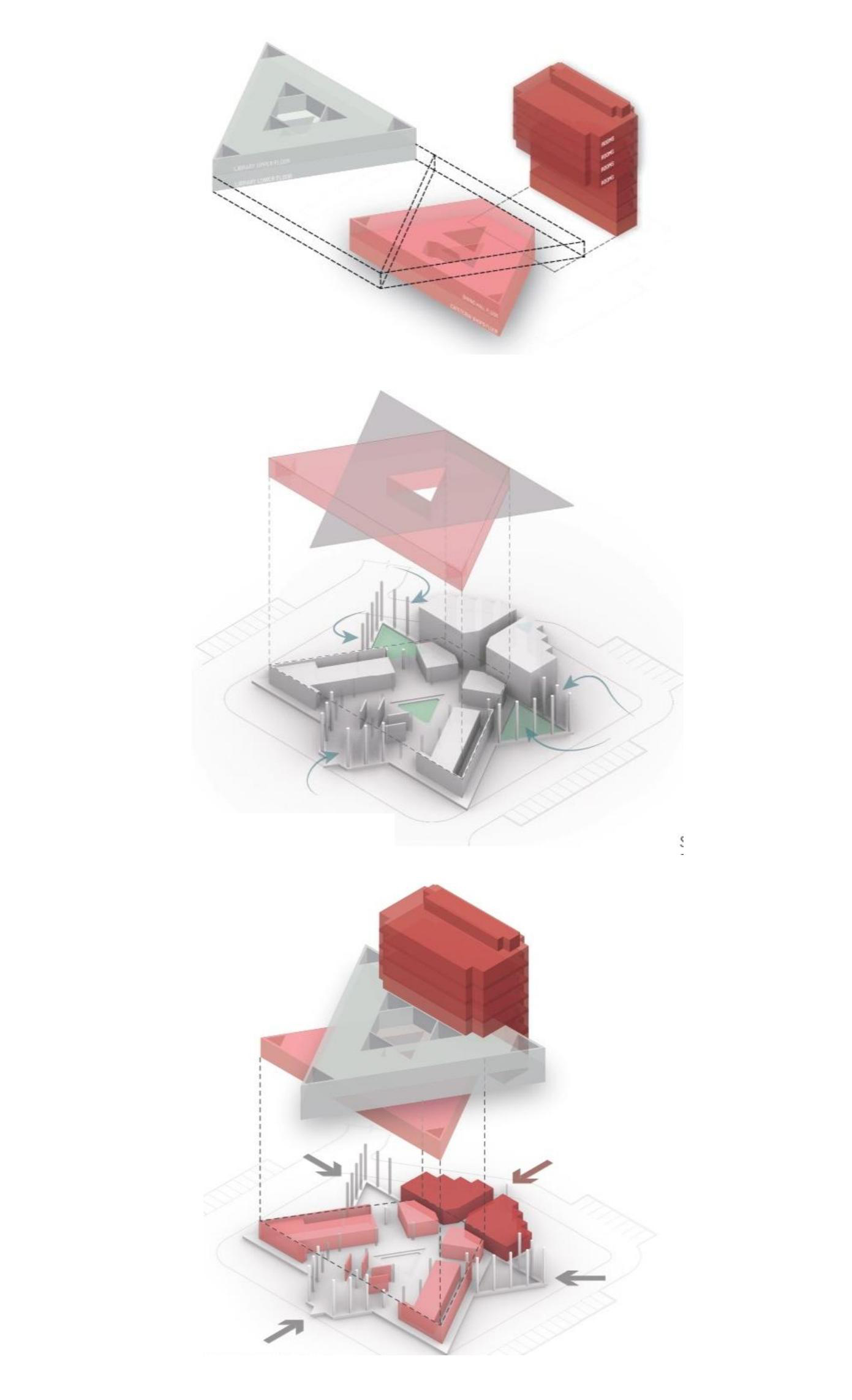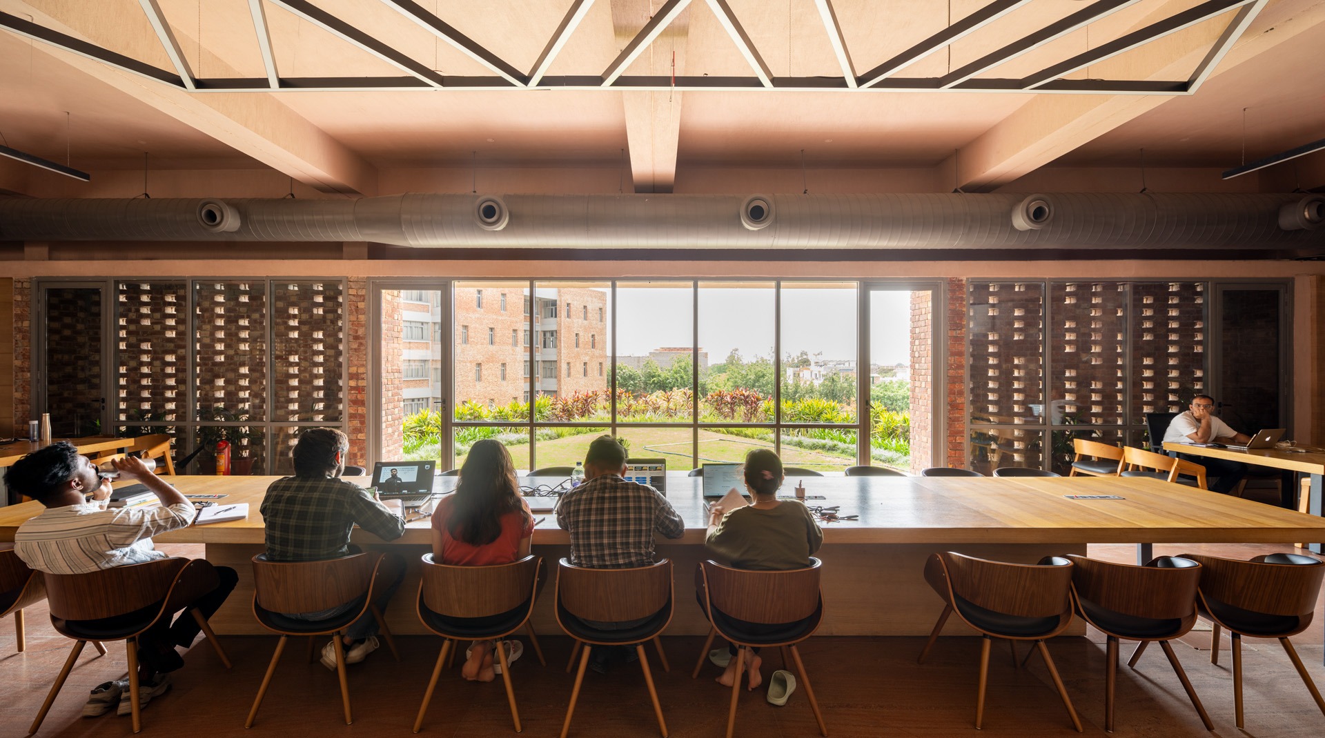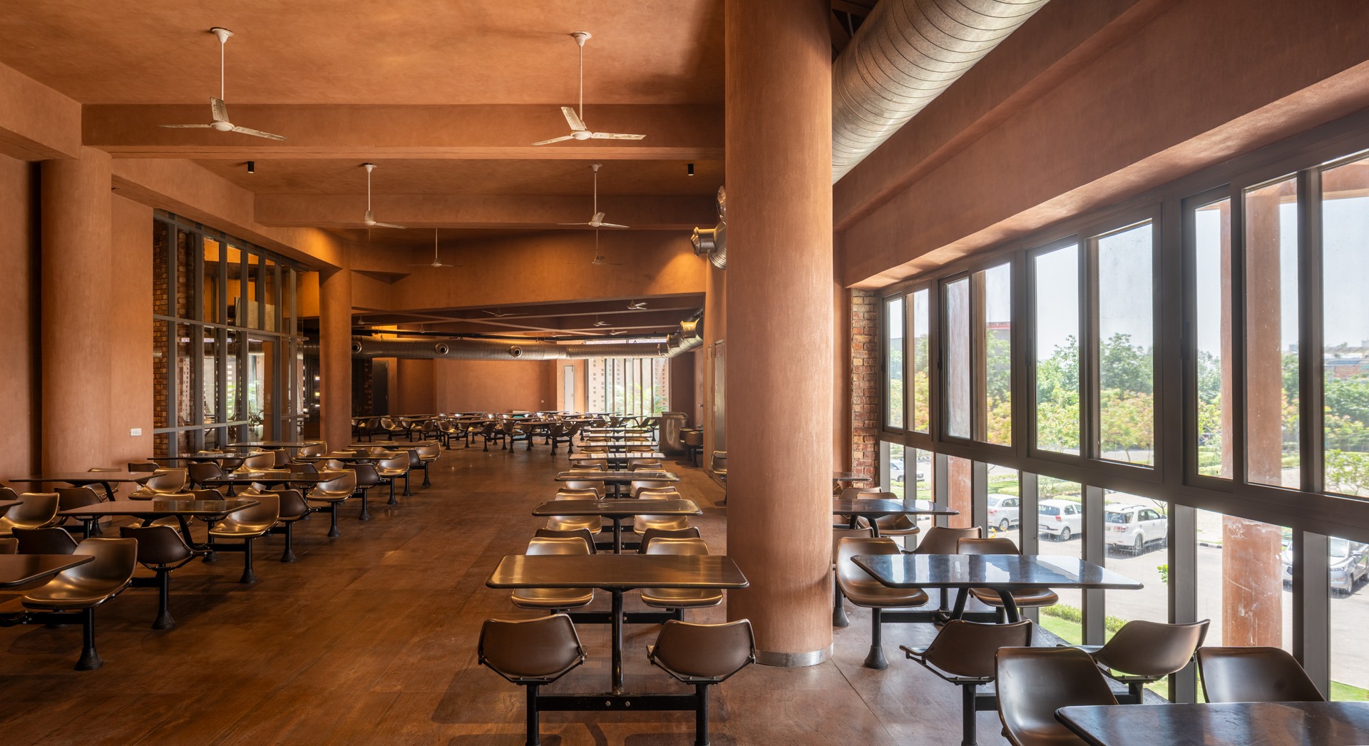 The triangular volumes generate large overhangs, shaded recesses, and cut-outs, promoting thermal comfort while creating incidental gathering spaces. On the ground level, the absence of enclosing walls results in an amorphous, open-plan configuration that fosters transparency, fluid movement, and informal social interactions—aligning with the ethos of a participatory campus life.