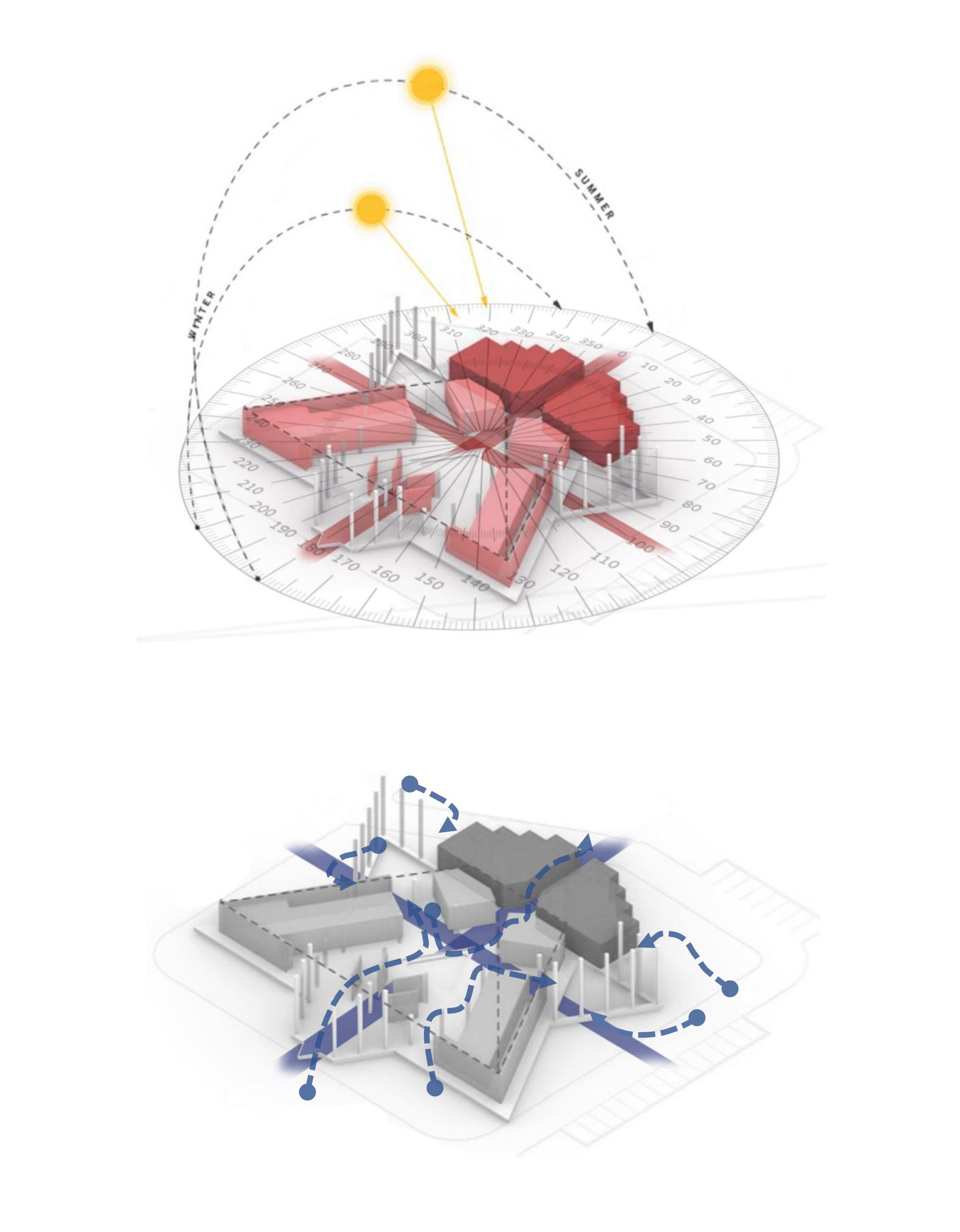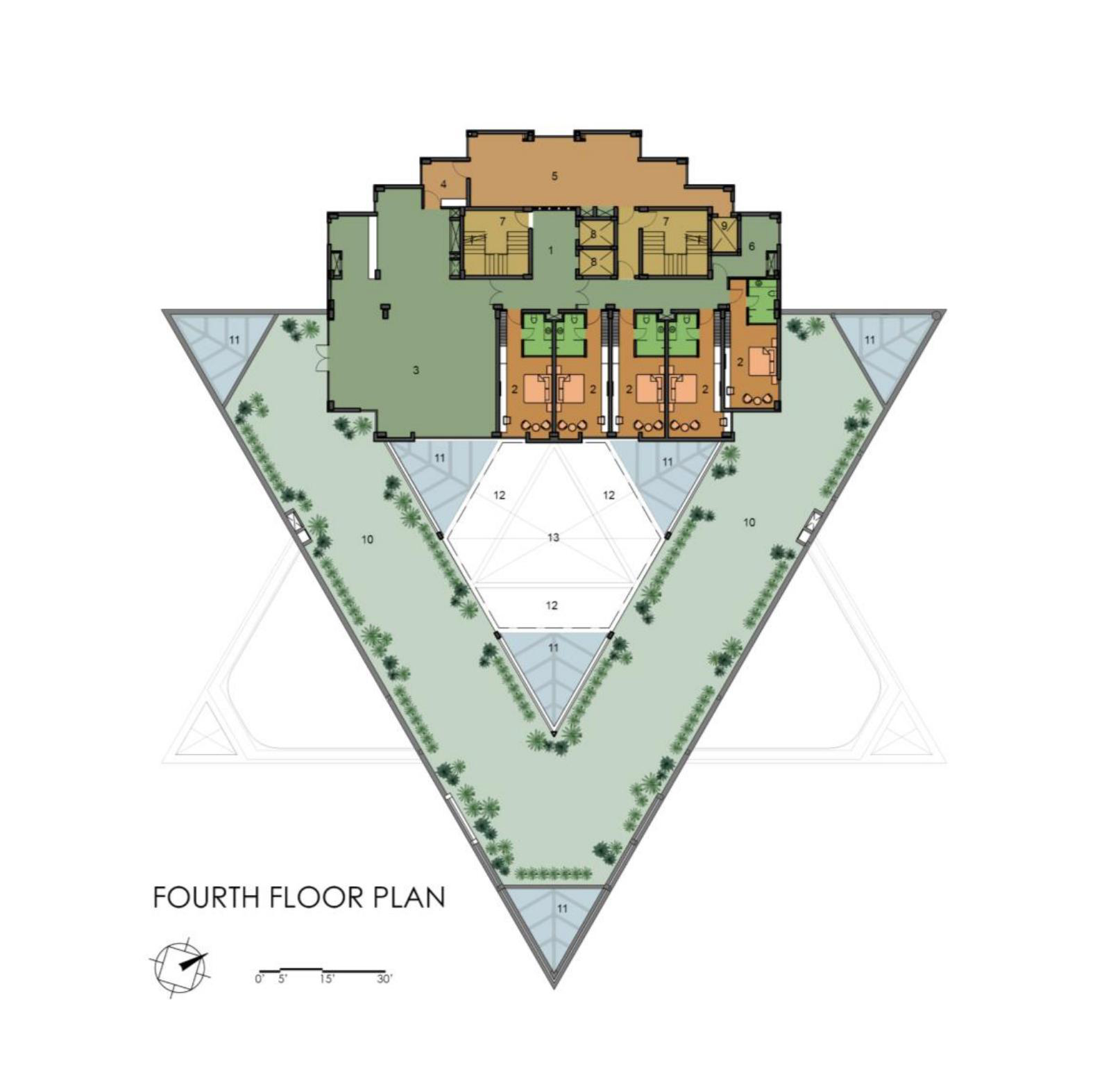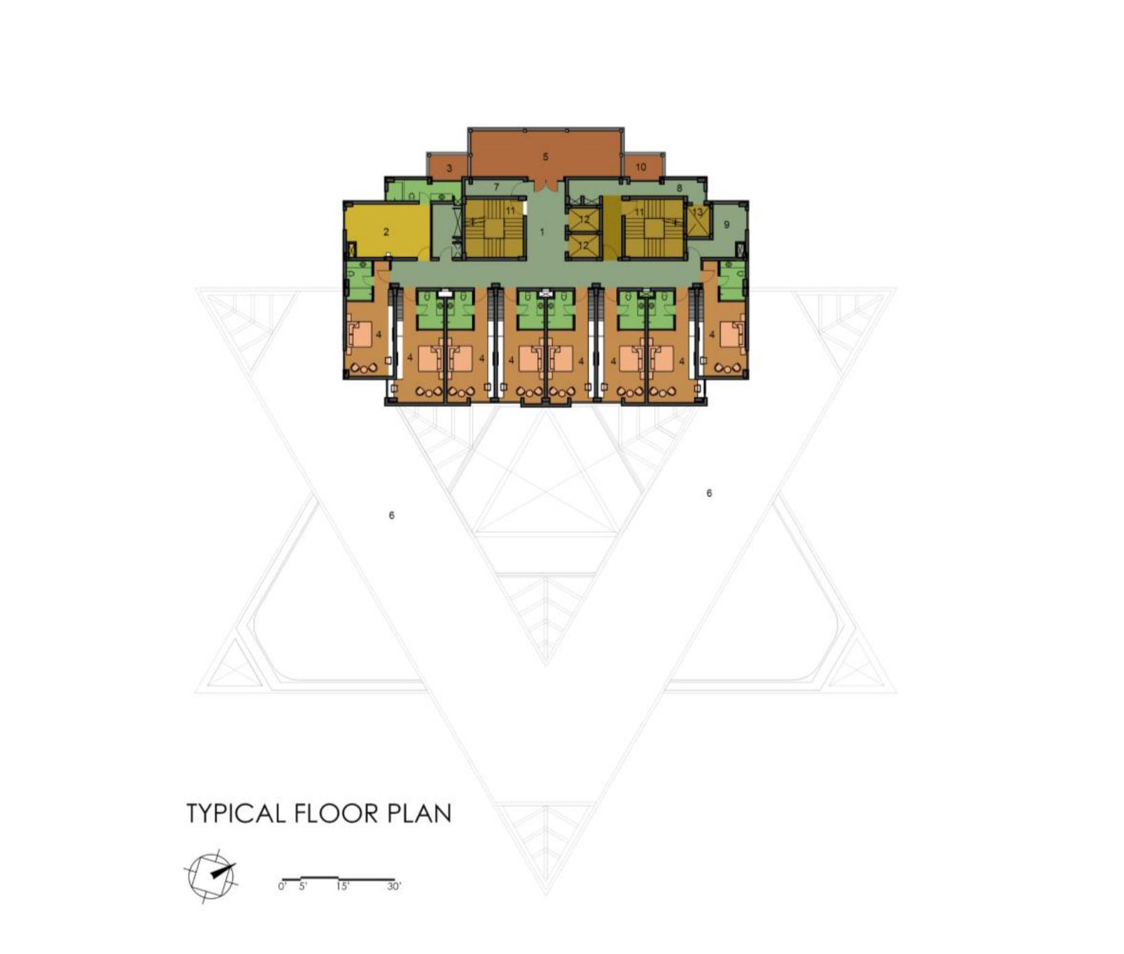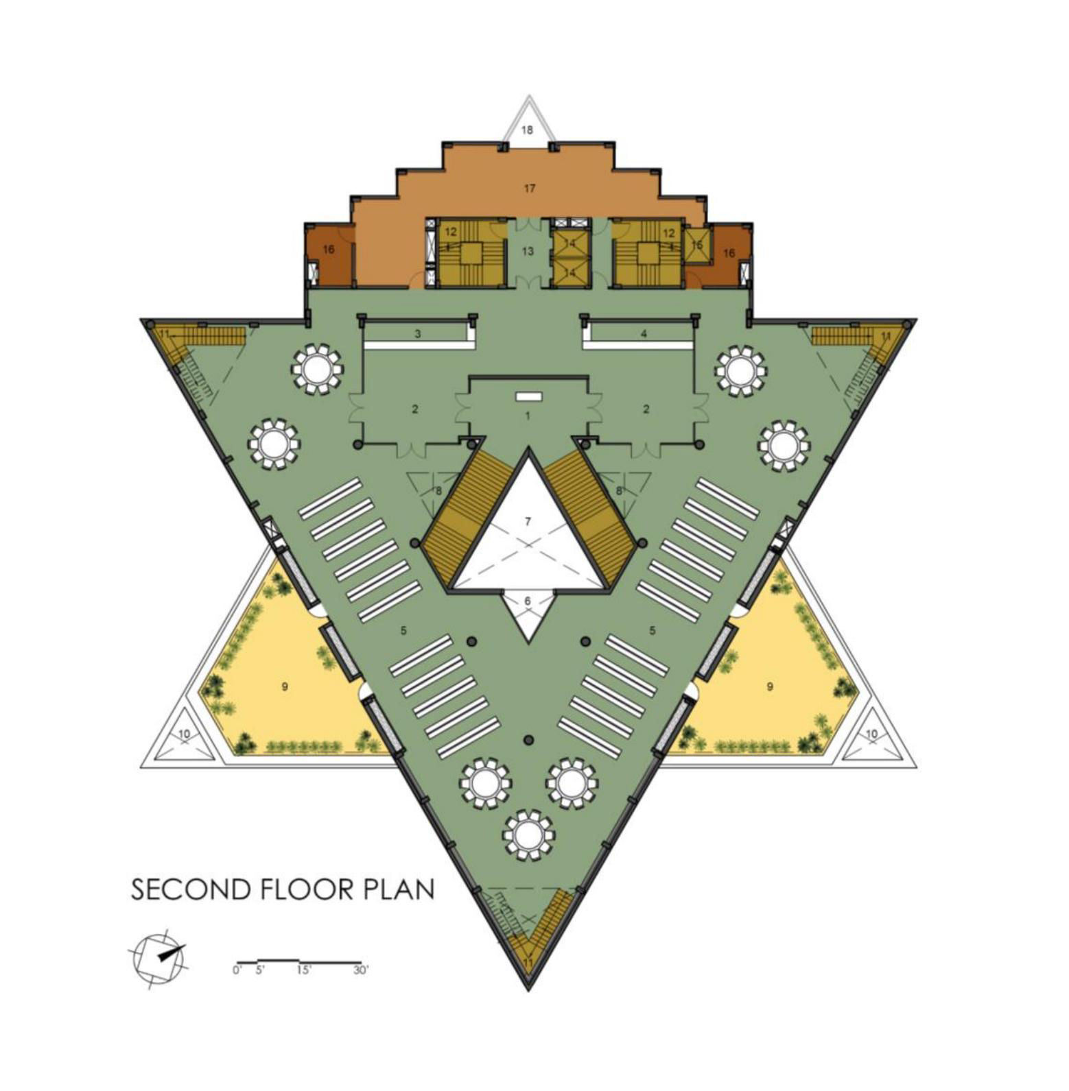 The triangular volumes generate large overhangs, shaded recesses, and cut-outs, promoting thermal comfort while creating incidental gathering spaces. On the ground level, the absence of enclosing walls results in an amorphous, open-plan configuration that fosters transparency, fluid movement, and informal social interactions—aligning with the ethos of a participatory campus life.