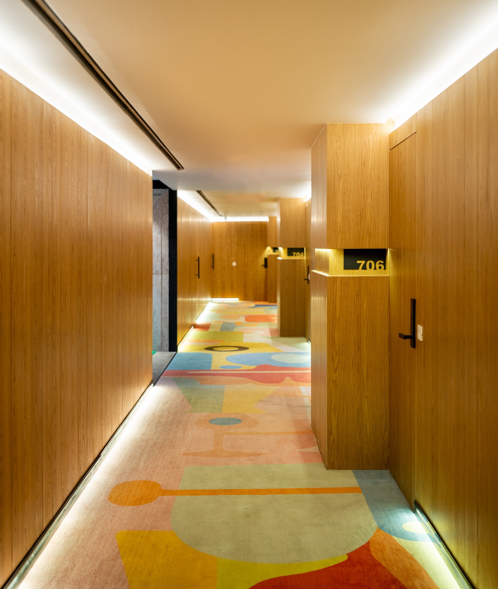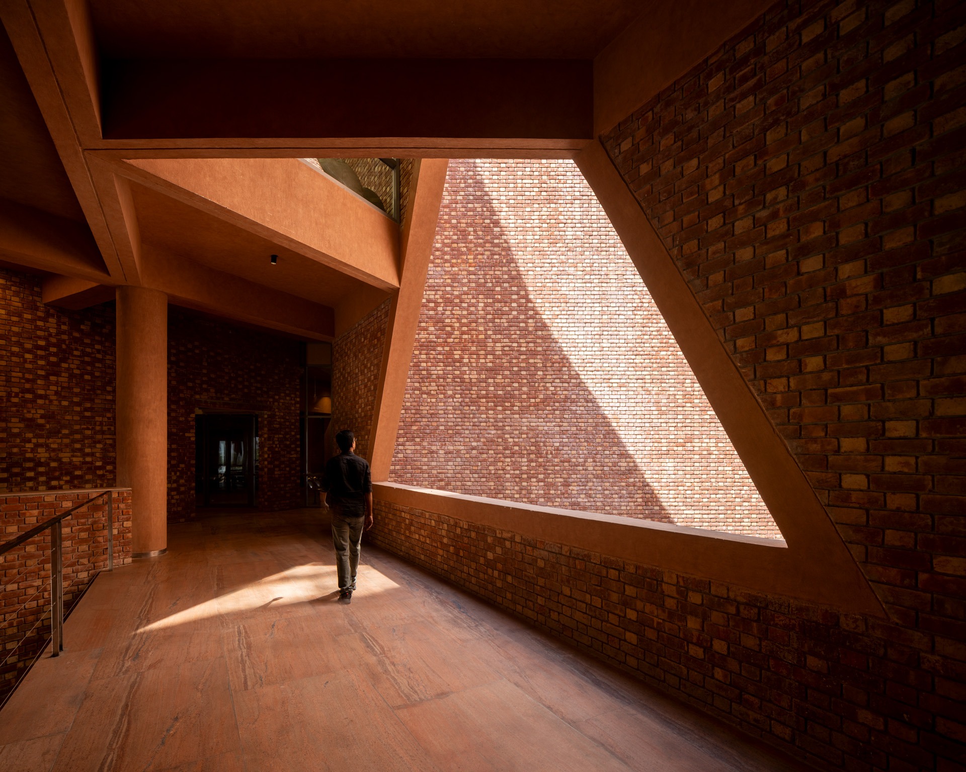 Materially, the building is defined by its exposed red brick façade laid in Flemish bond—a conscious reference to Chandigarh’s modernist architectural lineage. Brick jaalis introduce porosity for filtered light and cross ventilation, while red granite flooring in public zones offers tactile durability and visual warmth. These materials anchor the building in the regional context, reinforcing a sense of belonging while enhancing passive climate responsiveness.