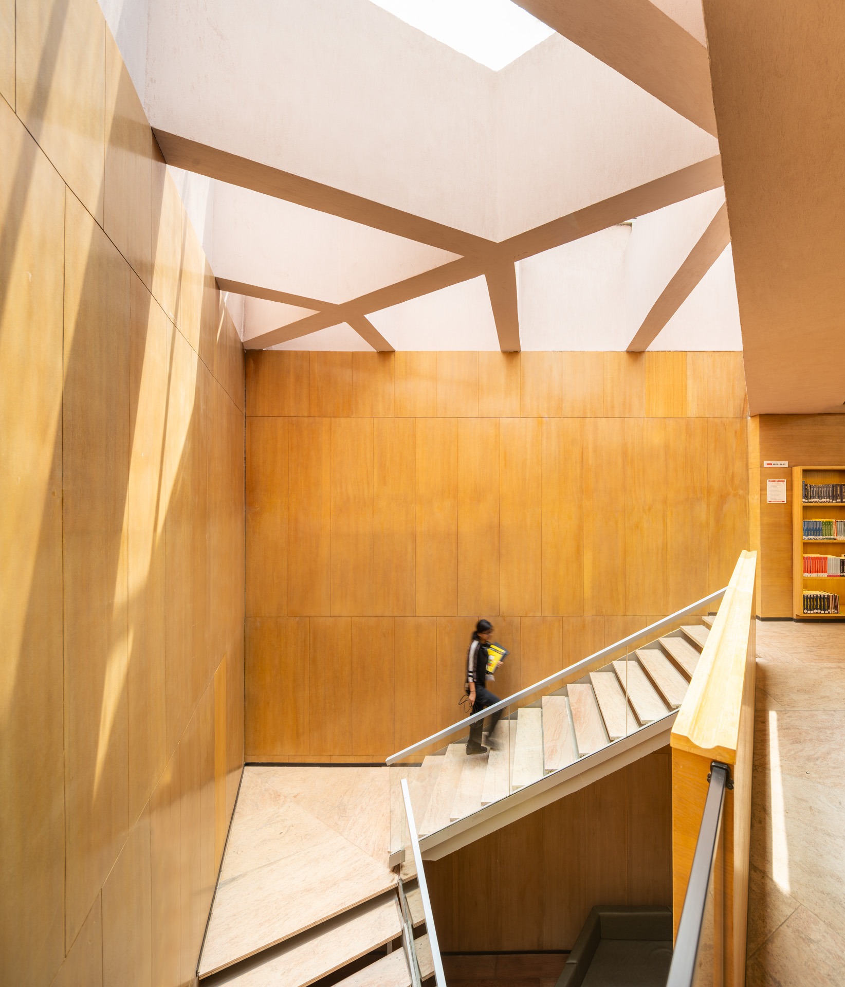 Spatially, the building is vertically organized by function. The ground and first floors act as student commons, housing cafeterias, utility shops, and a dining hall for approximately 500 students. The second and third floors are dedicated to a double-height library, accessed through a ceremonial staircase at the primary entrance. This architectural promenade transforms a simple act of movement into a spatial experience. The upper levels accommodate a guest house for faculty and VIPs, complete with separate access and reception, ensuring privacy and functional efficiency.
