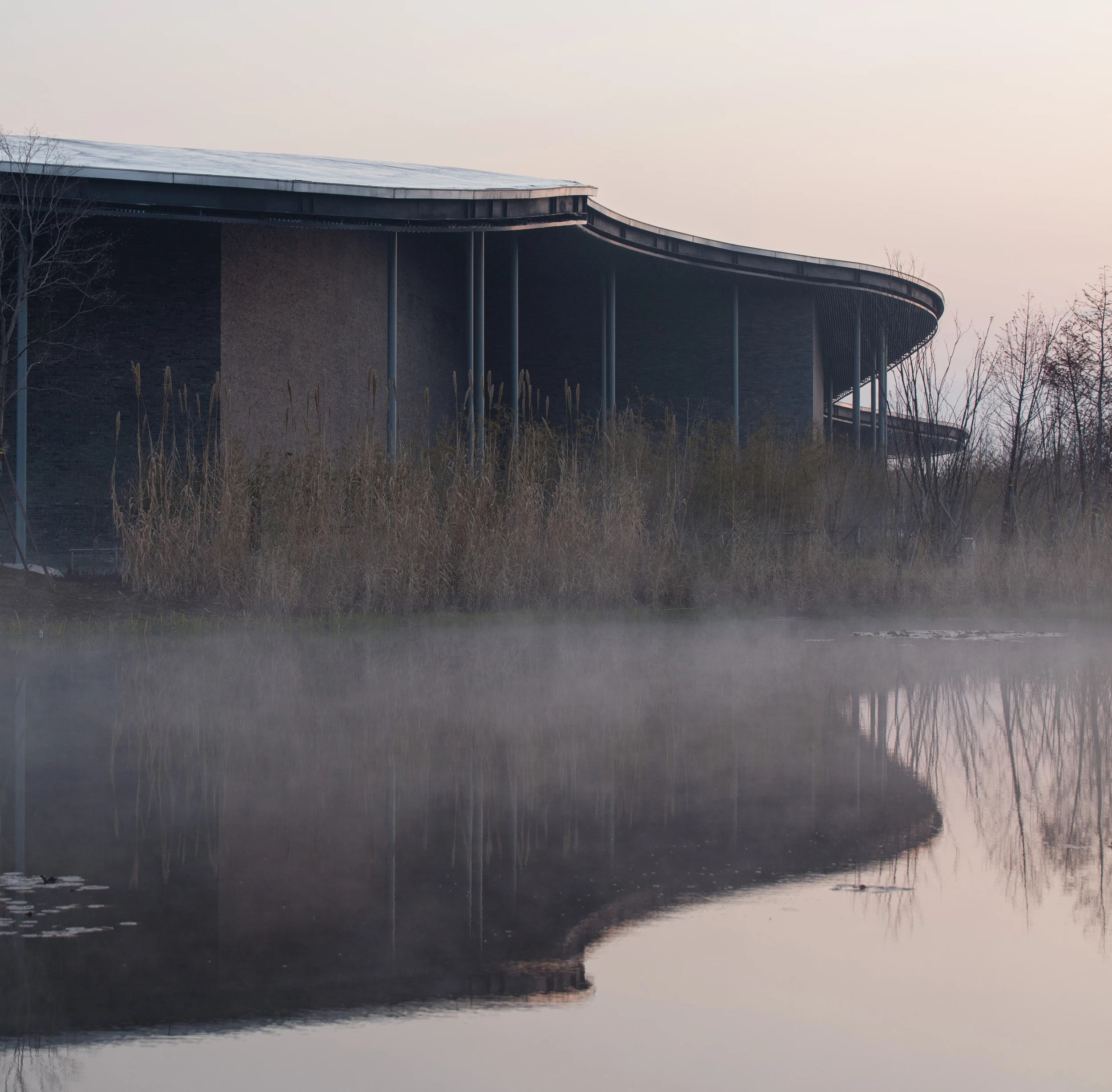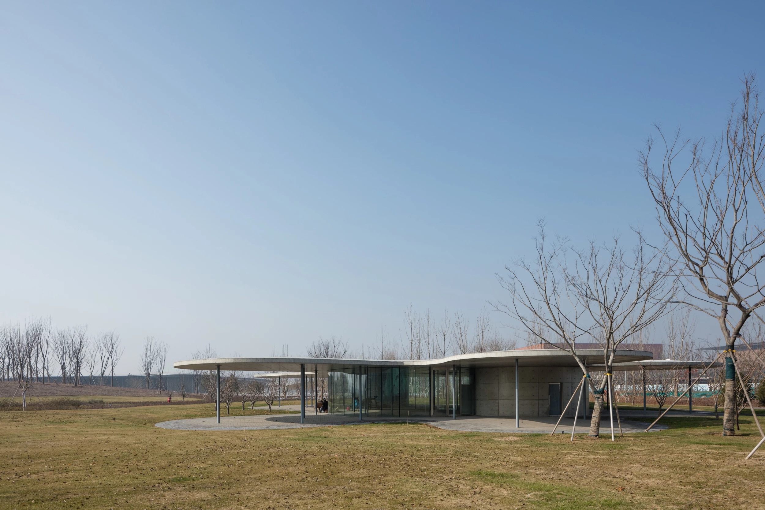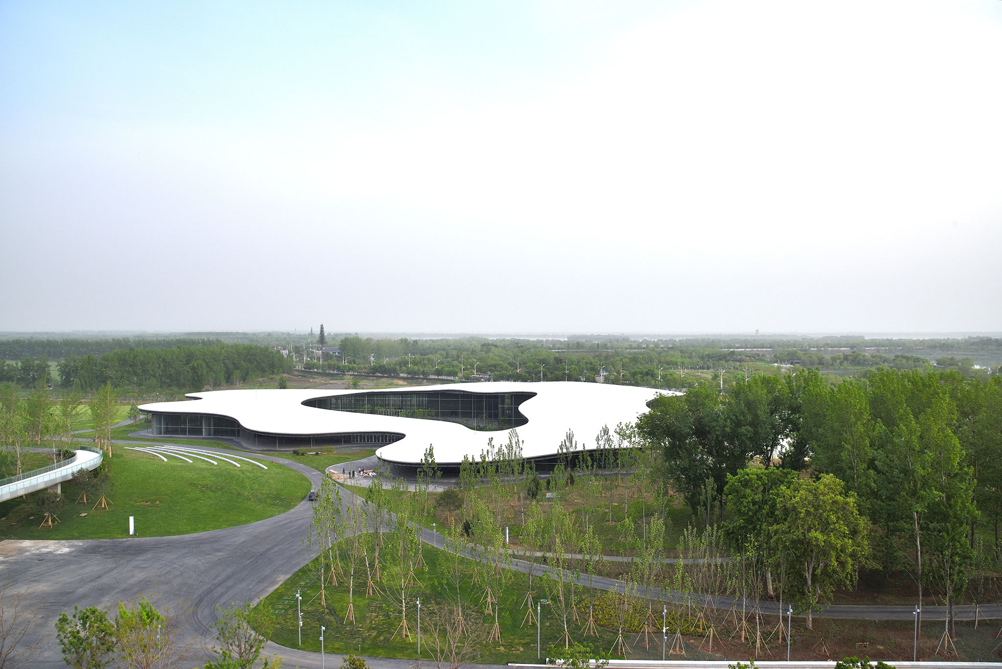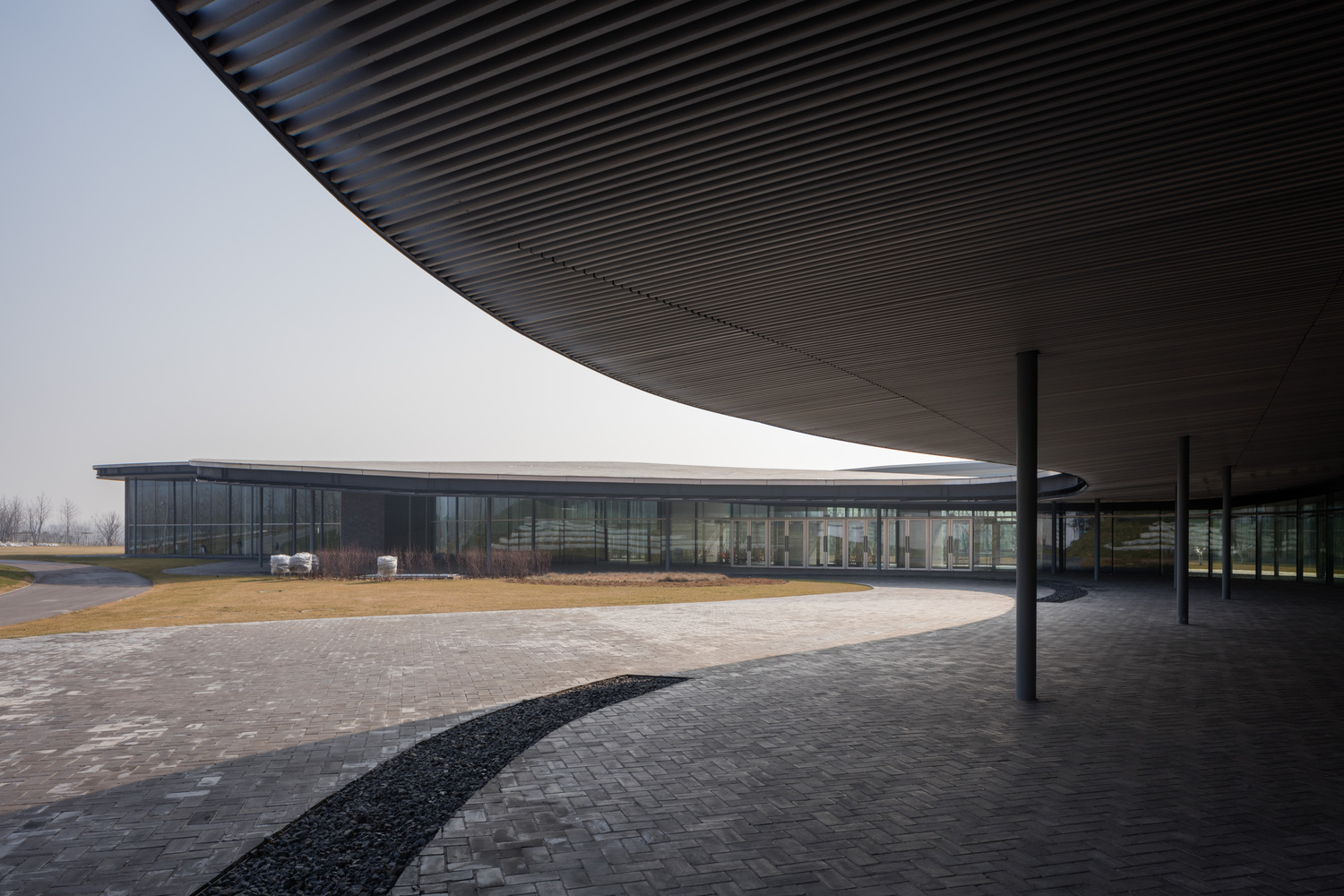 This project was to design a museum with a park and café in Jining City, Shandong Province, China. It was completed in May 2019. The site is in part of a large development area about twenty minutes by car from the city. This is an extensive development project that will become a new cultural centre of Jining City. The plan includes four cultural facilities including a library, three different types of museums, commercial facilities, an office, and a park. This new art museum was planned inside the park. The site itself is surrounded by nature with a large lake adjacent to the property, as well as greenery and some waterfront space inside the lot.