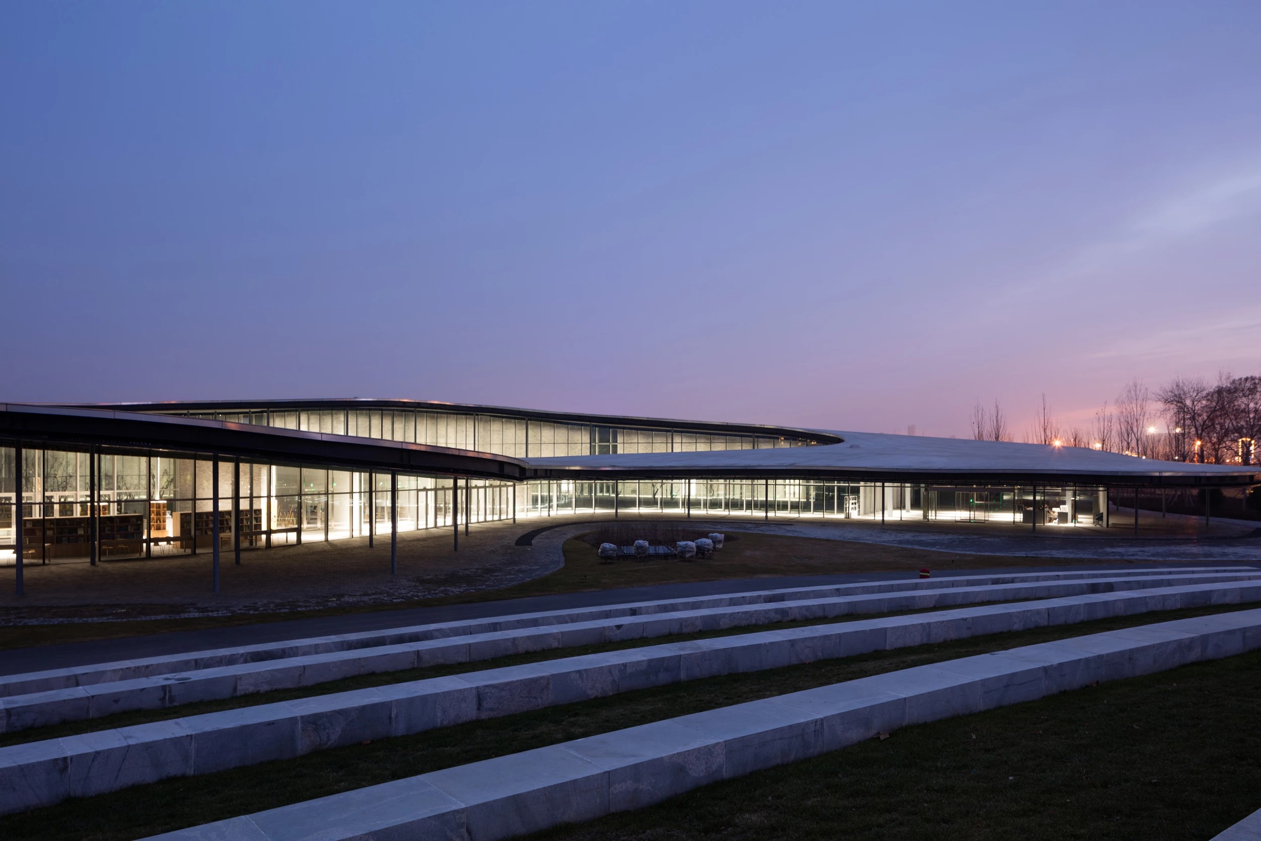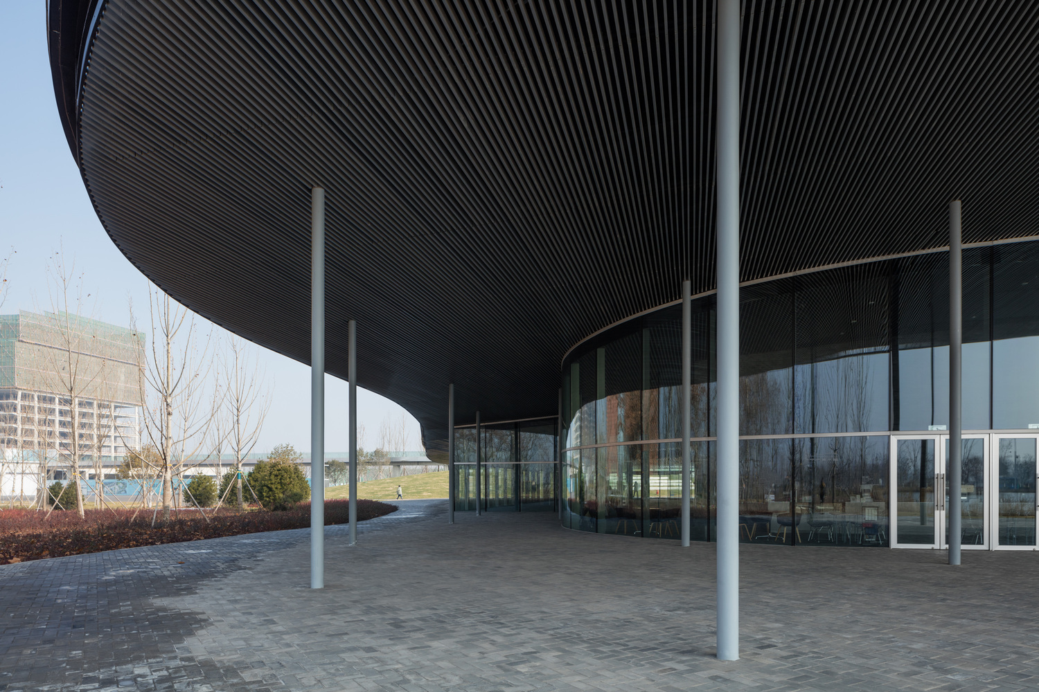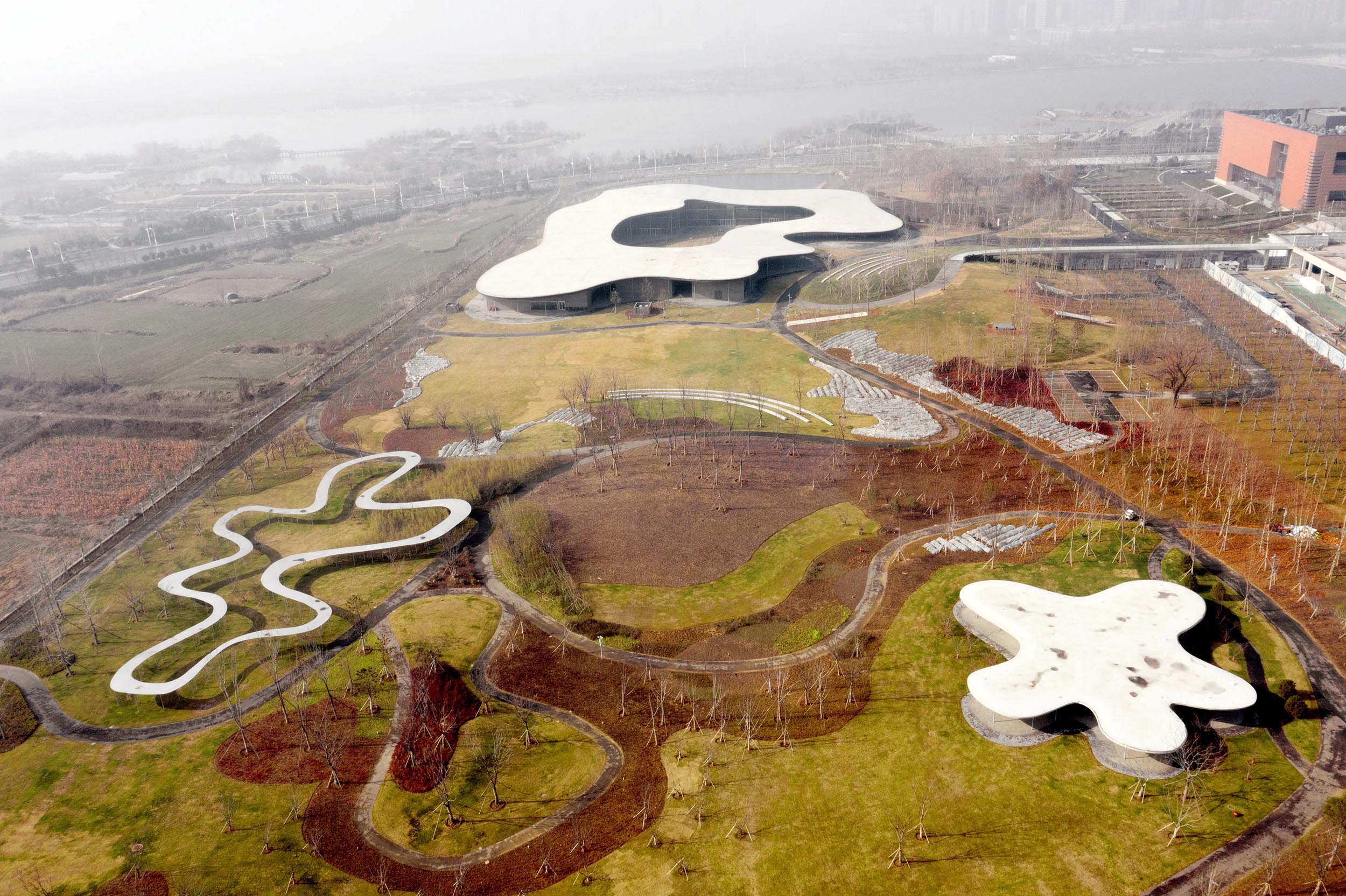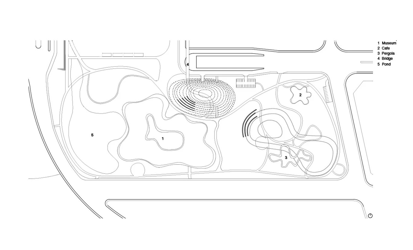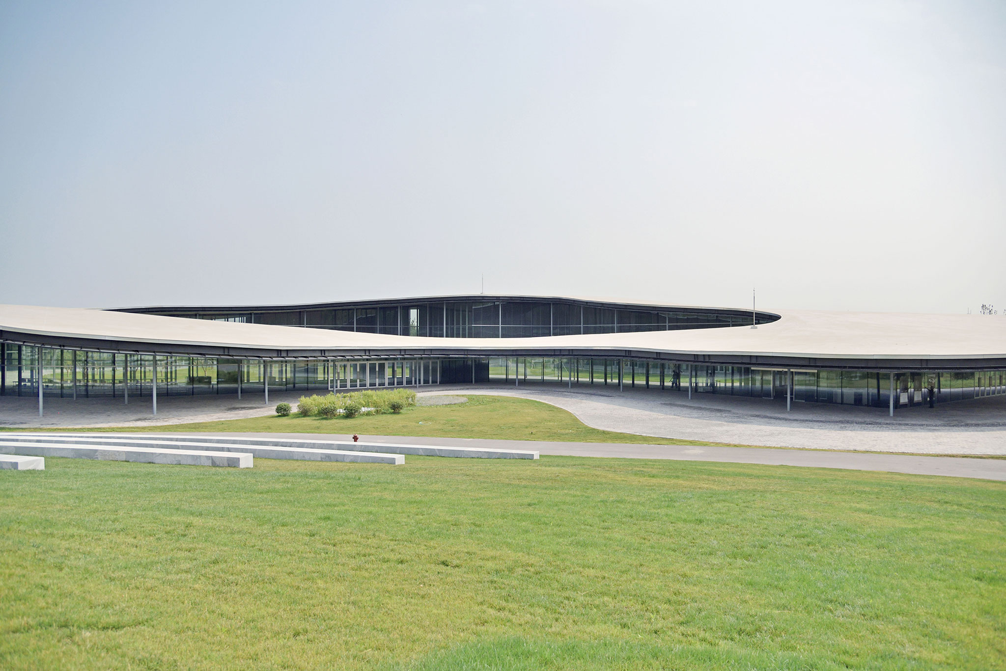 This project was to design a museum with a park and café in Jining City, Shandong Province, China. It was completed in May 2019. The site is in part of a large development area about twenty minutes by car from the city. This is an extensive development project that will become a new cultural centre of Jining City. The plan includes four cultural facilities including a library, three different types of museums, commercial facilities, an office, and a park. This new art museum was planned inside the park. The site itself is surrounded by nature with a large lake adjacent to the property, as well as greenery and some waterfront space inside the lot.