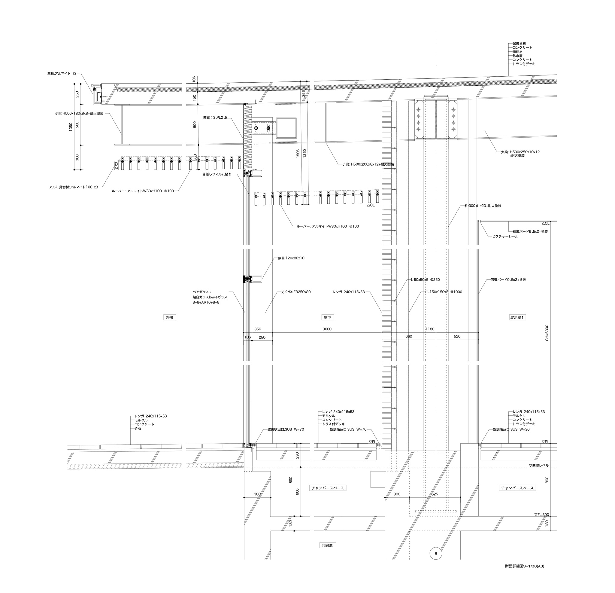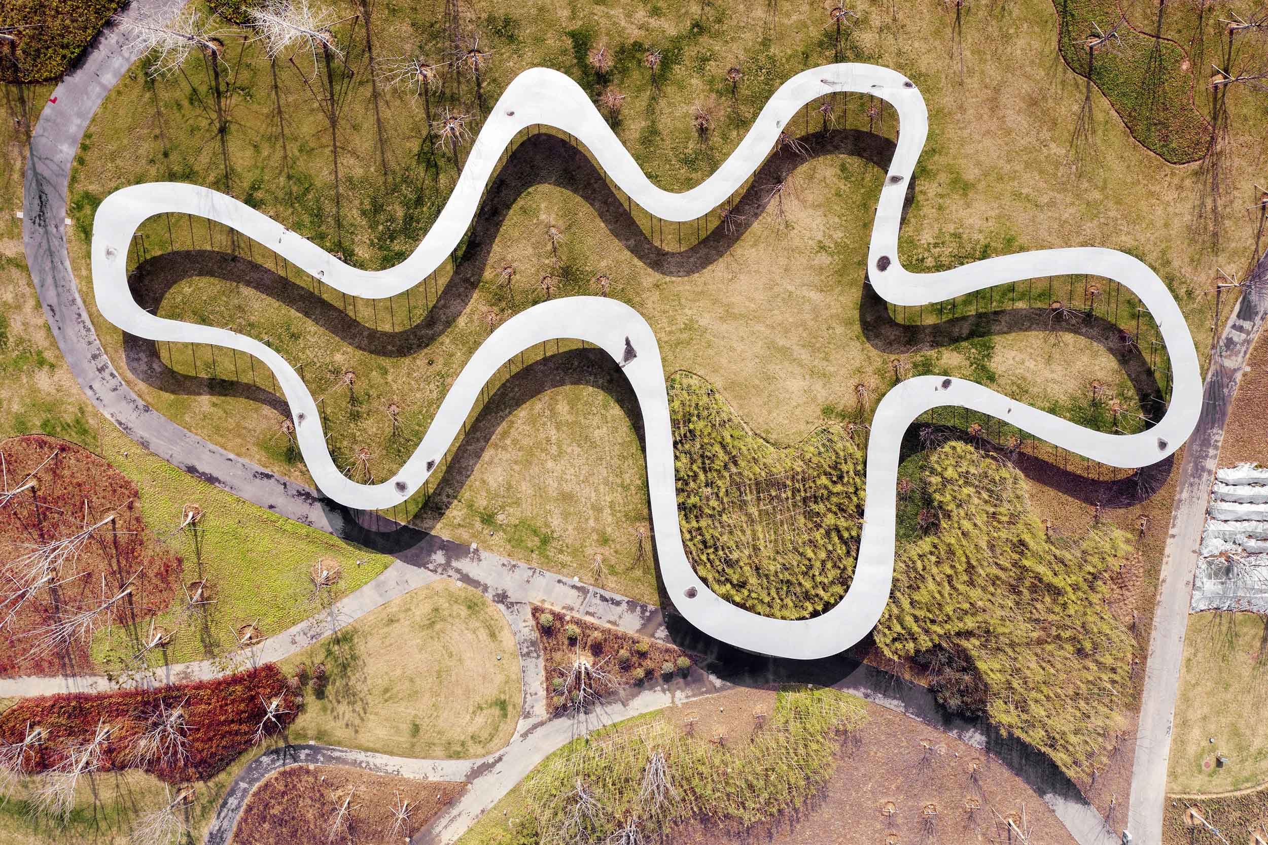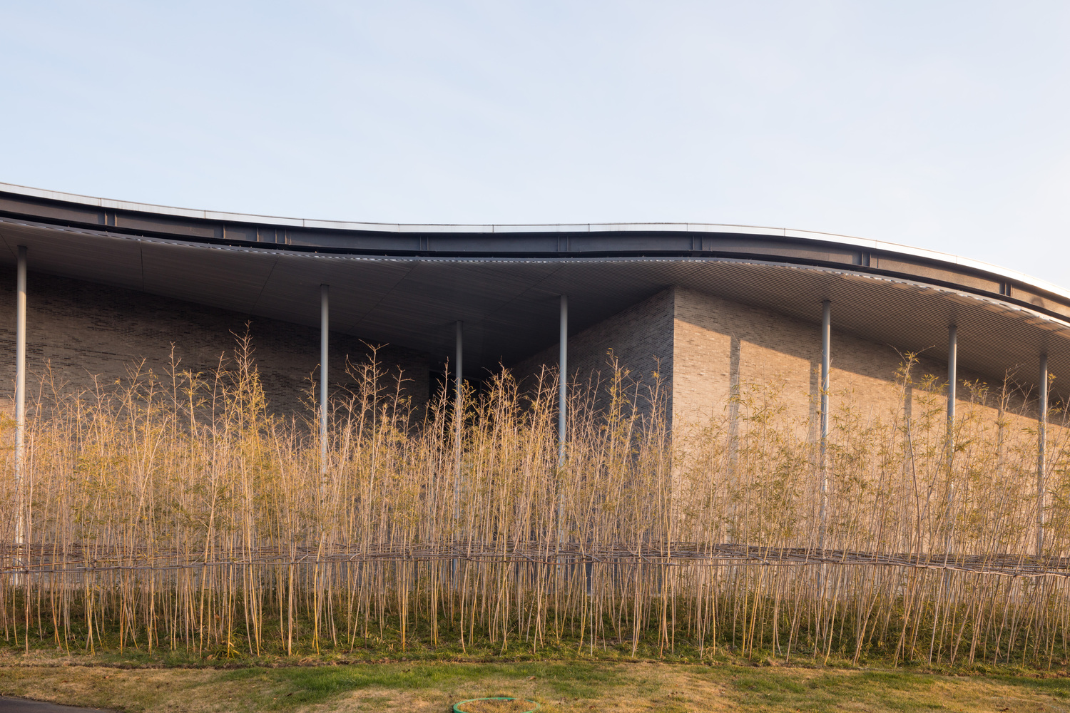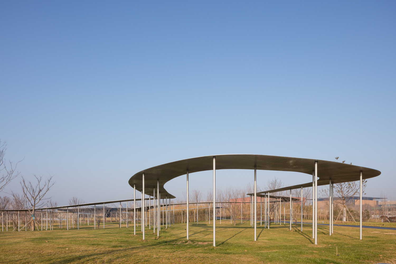 We wanted the museum to blend into nature so the main architectural design was to incorporate an organic curve shape to the big roof. The big roof height gradually changes from 4 to 13 meters so that it naturally continues from the organic landscape of the park. The structure itself is made of steel frames. Approximately half of the space underneath this roof is used as park space and the rest of the space functions as museum space. Large and small exhibition rooms and various other rooms are arranged independently in the museum space, surrounded by glass corridors to form courtyards.