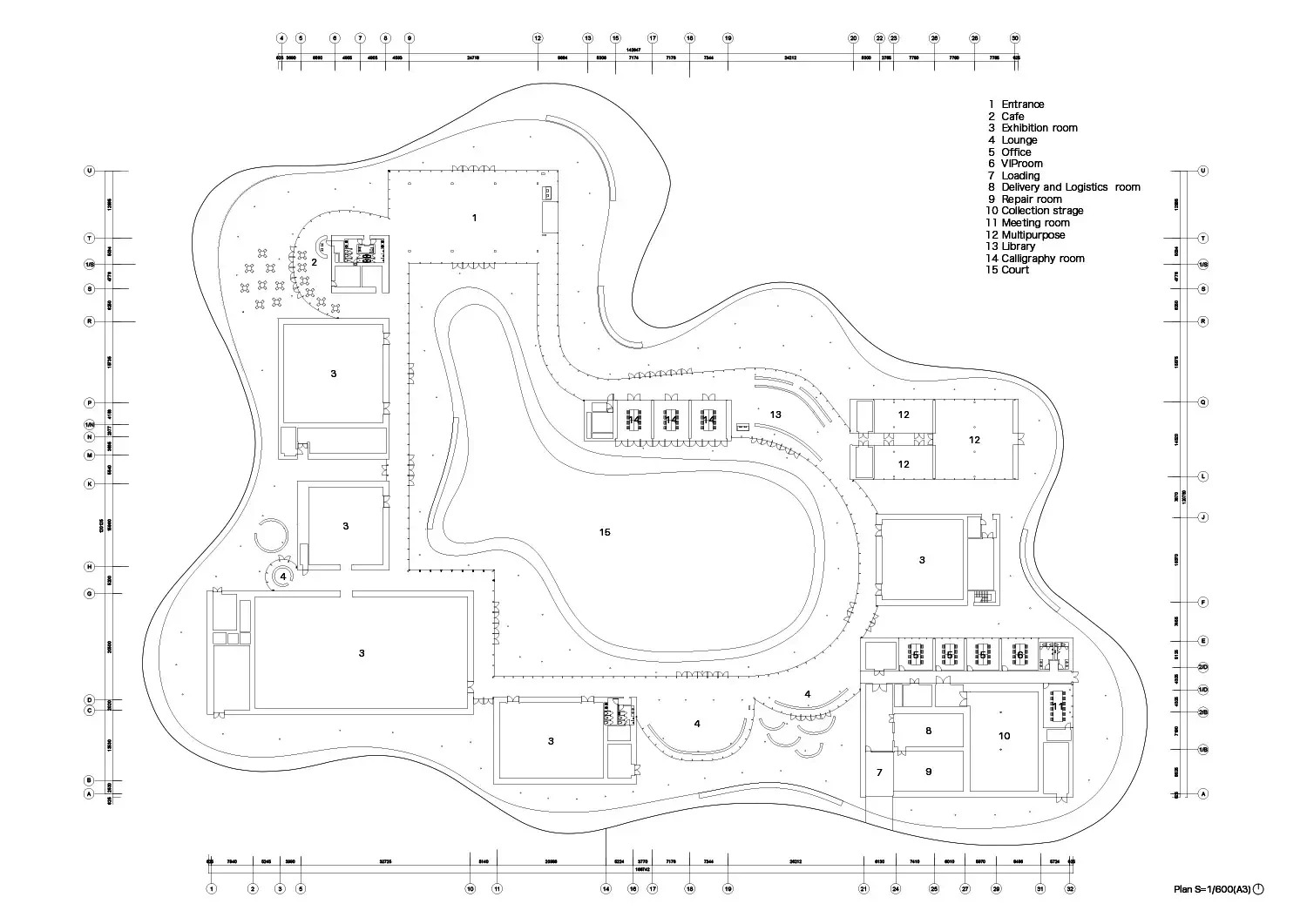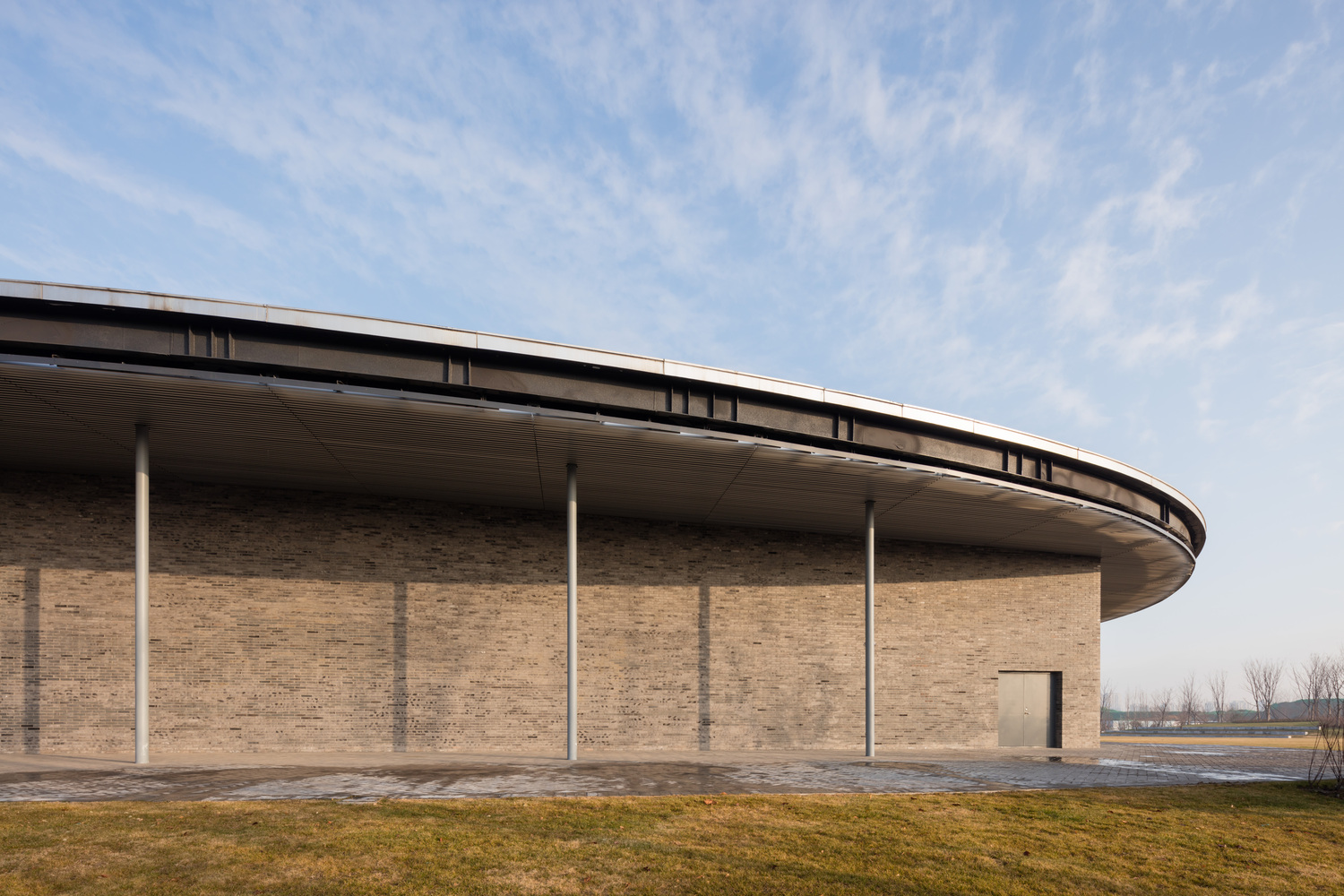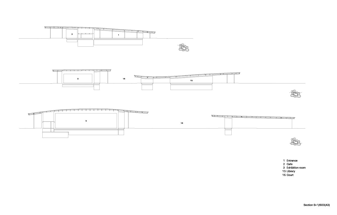 The corridors are not only connecting to each exhibition space but also become multi- function spaces as they change their width for particular spaces such as cafés, lounges and book shops. The park-side space is covered by the eaves on the outer periphery of the big roof, which is a semi-outdoor space that can also be used as part of the museum, but it can also be approached directly from the park side and used independently. We hoped the roof to act as a sunshade for people during hot summer days in Jining. A sense of transparency and brightness is created by the courtyards, and at the same time, shady and dark spaces exist that are made by a big roof and a solid volume of bricks. We aimed for this architecture to become part of the park and harmonizing with the surrounding landscape.