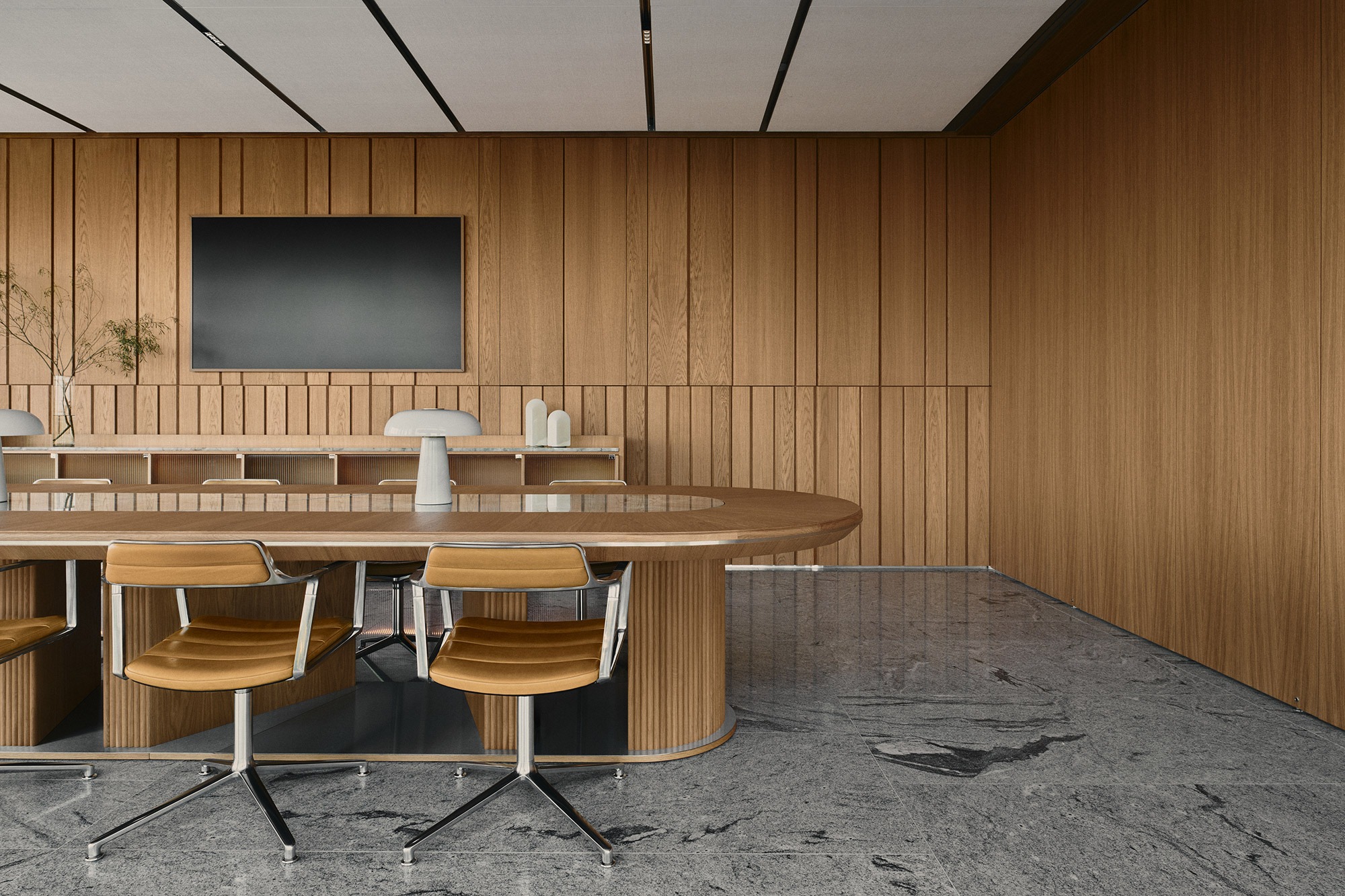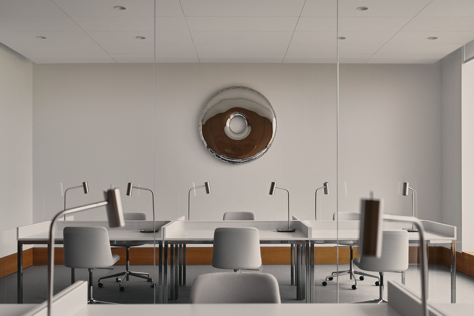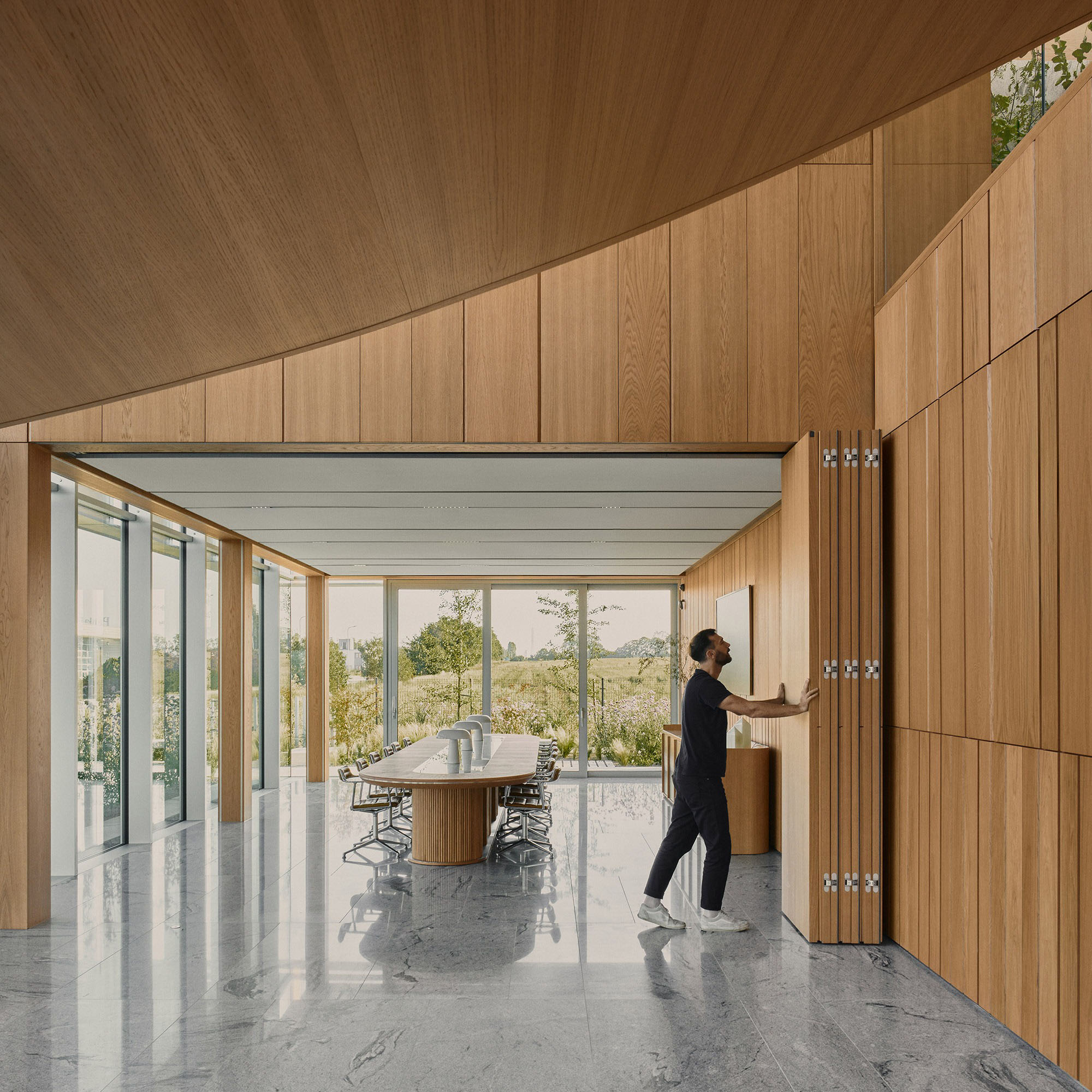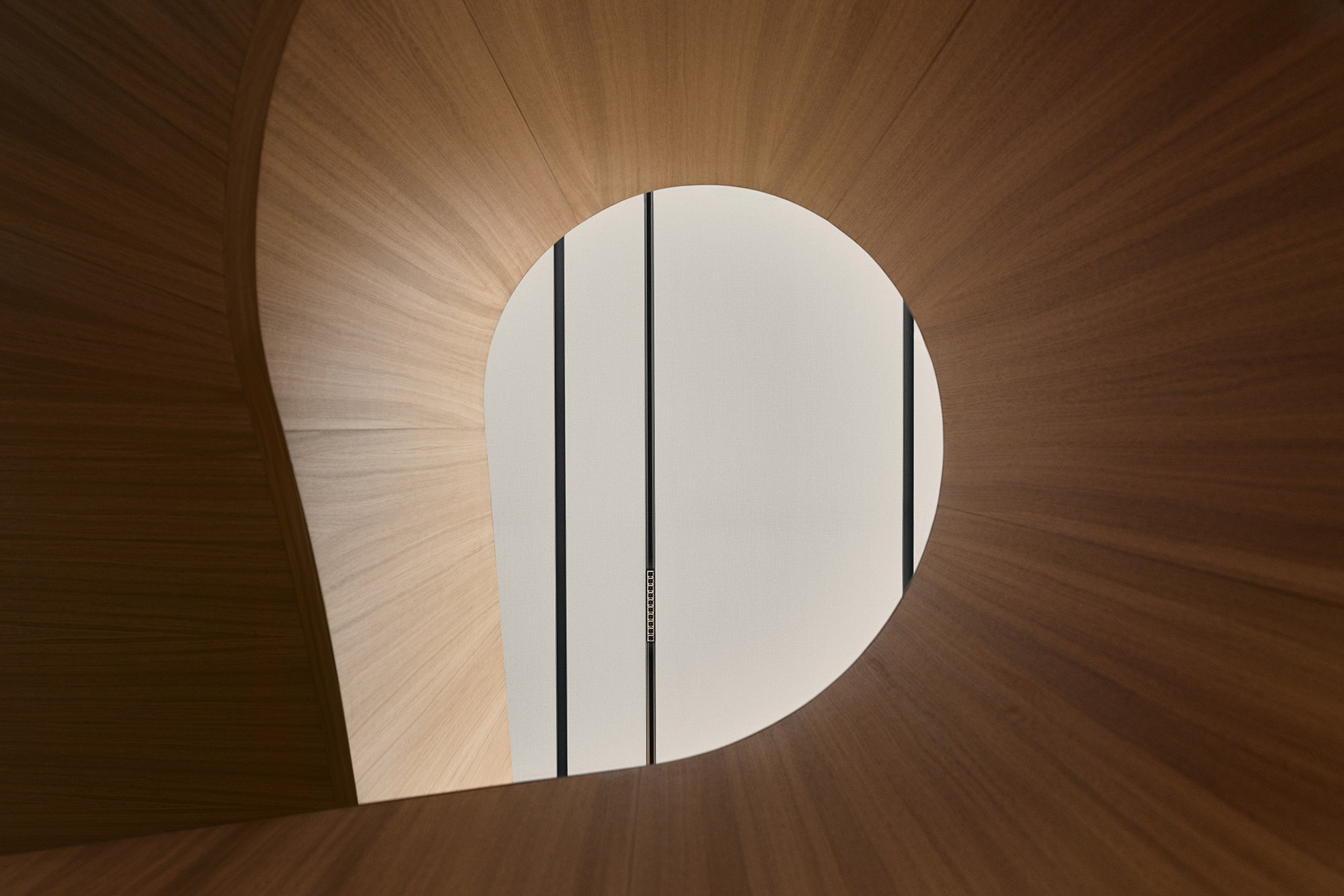 The lobby, defined by vertical wooden panels, establishes a warm and enveloping entry sequence. Textile ceiling screens echo the geometry of the floor, introducing a sense of rhythm that carries through the space. Polished steel and glass reflect and refract the changing light, creating subtle shifts in perception throughout the day. The glazed partitions and skylights in the workspaces diffuse natural light into the building’s core, fostering a sense of openness and connection.