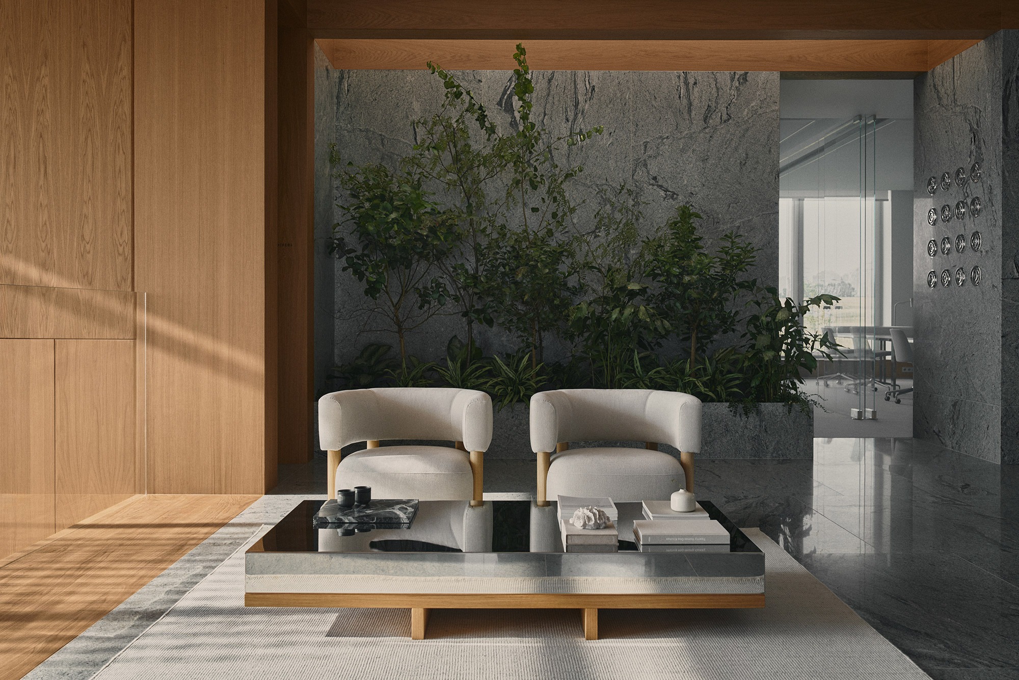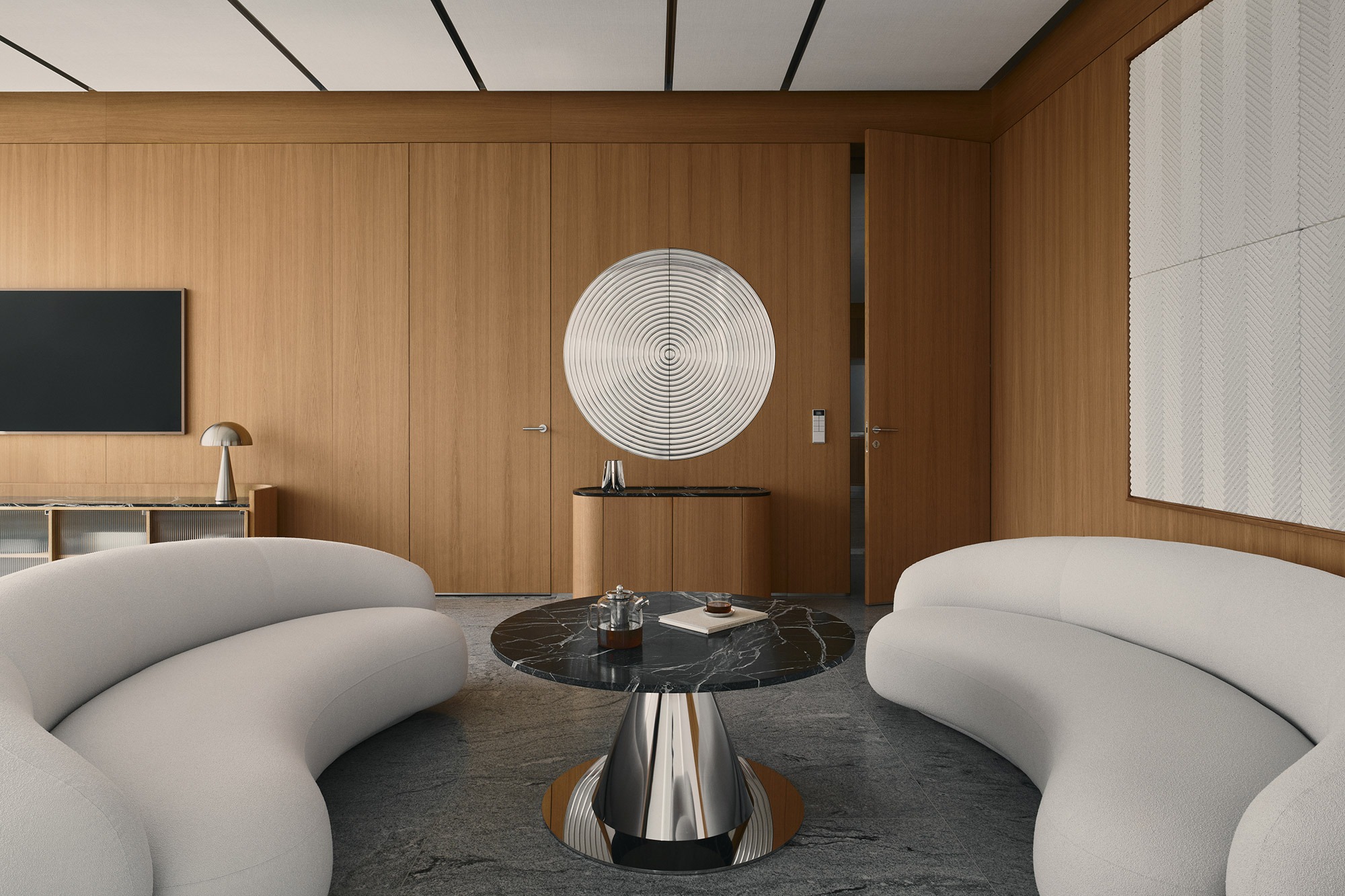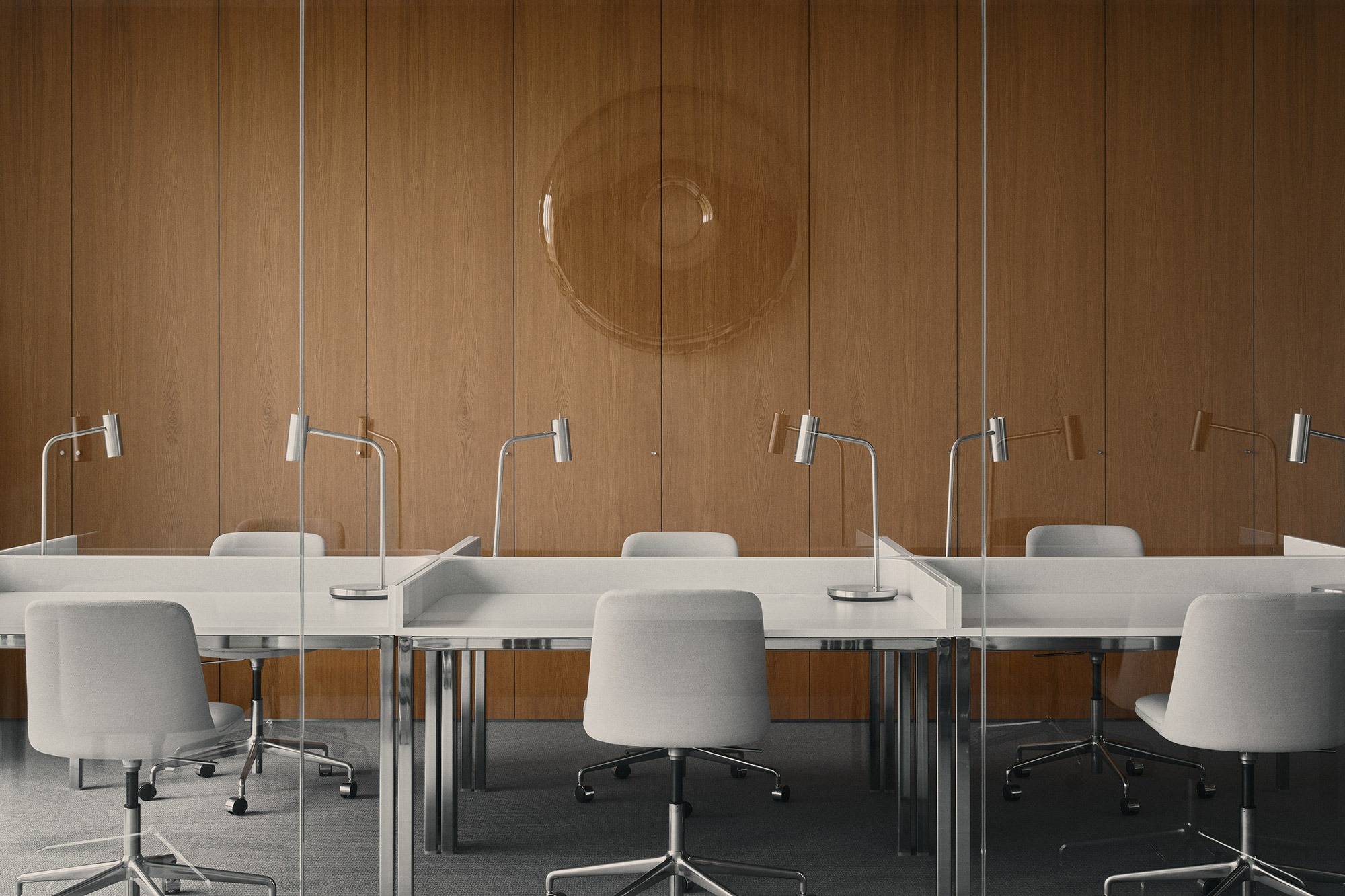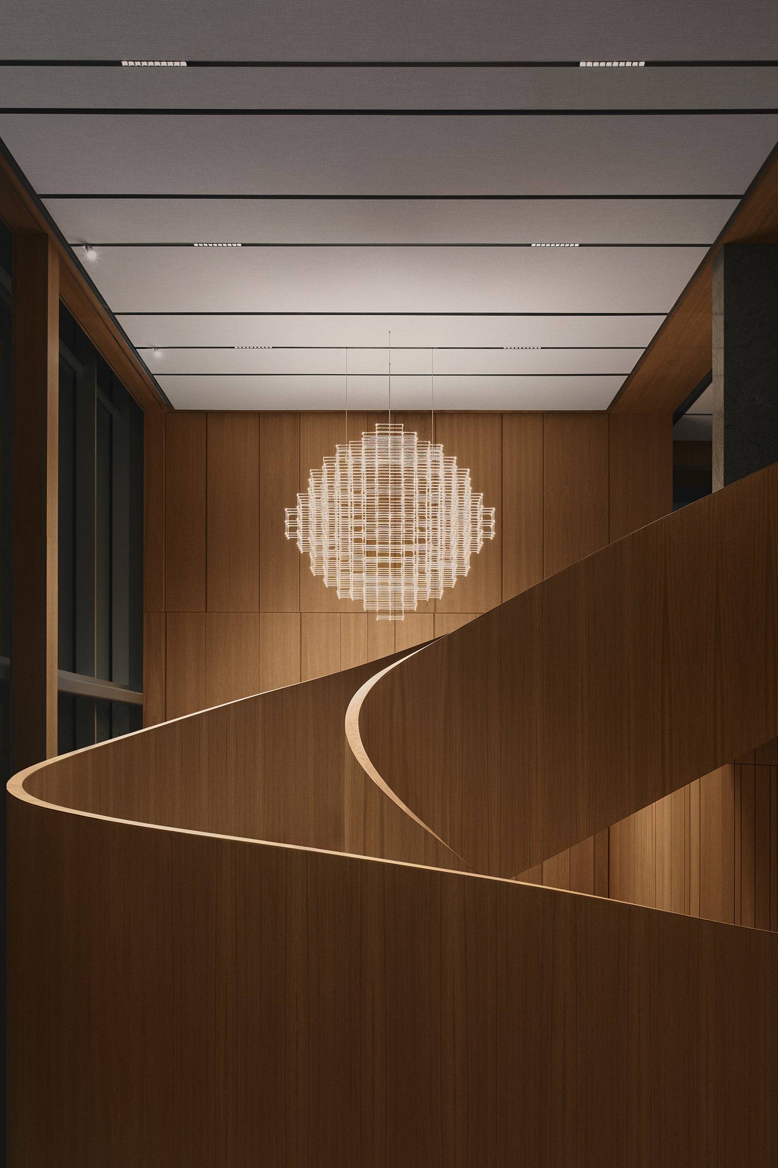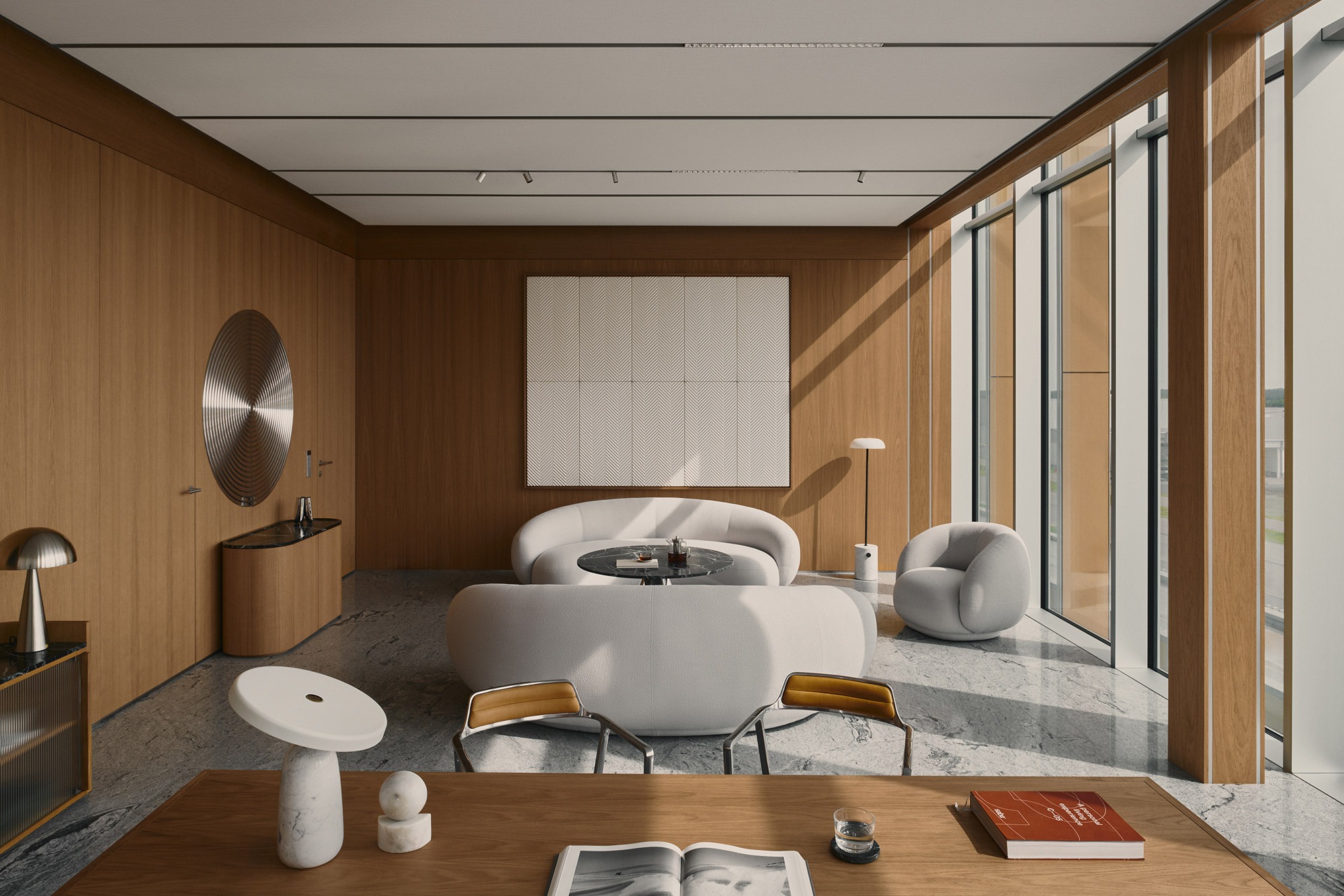 The lobby, defined by vertical wooden panels, establishes a warm and enveloping entry sequence. Textile ceiling screens echo the geometry of the floor, introducing a sense of rhythm that carries through the space. Polished steel and glass reflect and refract the changing light, creating subtle shifts in perception throughout the day. The glazed partitions and skylights in the workspaces diffuse natural light into the building’s core, fostering a sense of openness and connection.