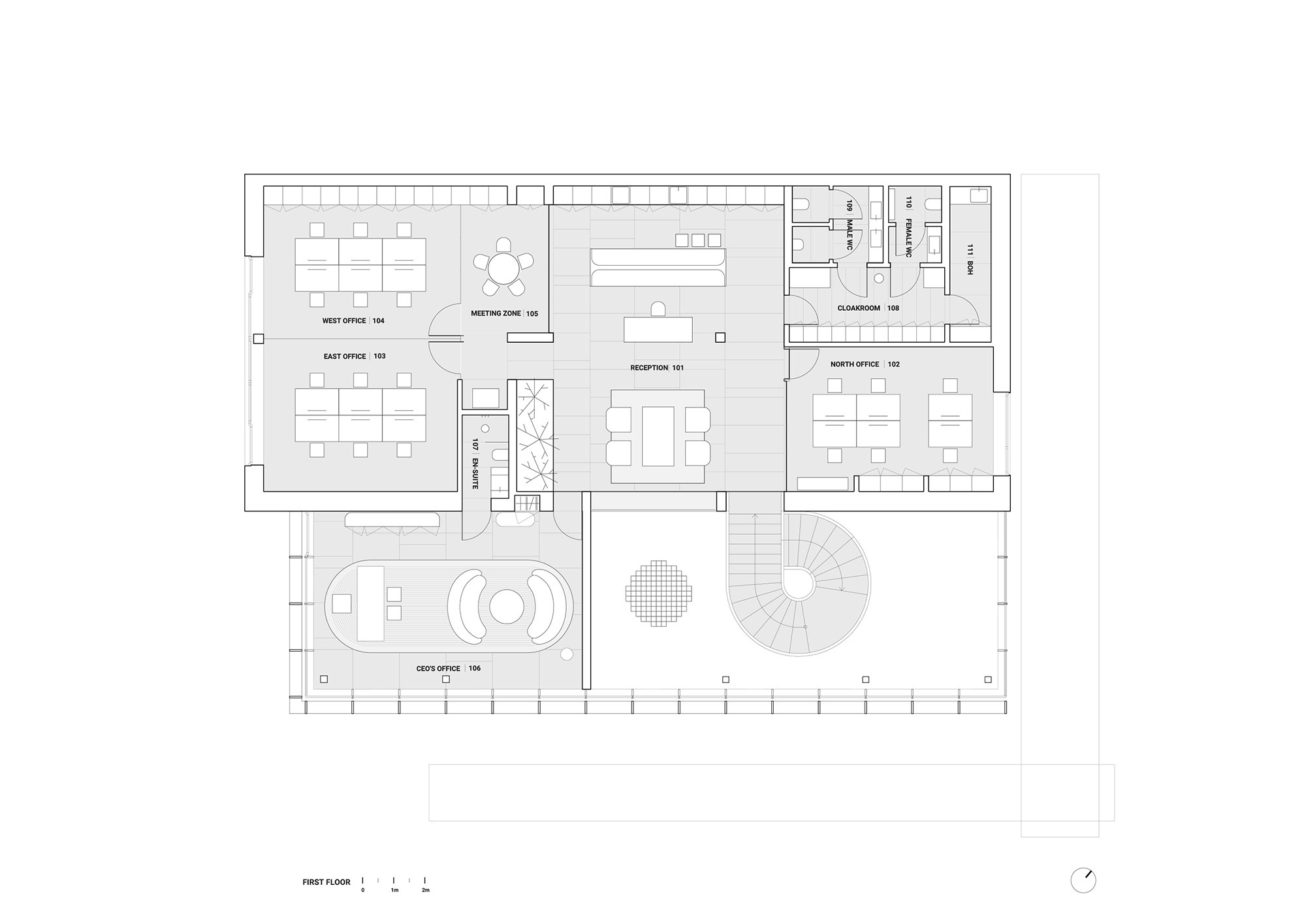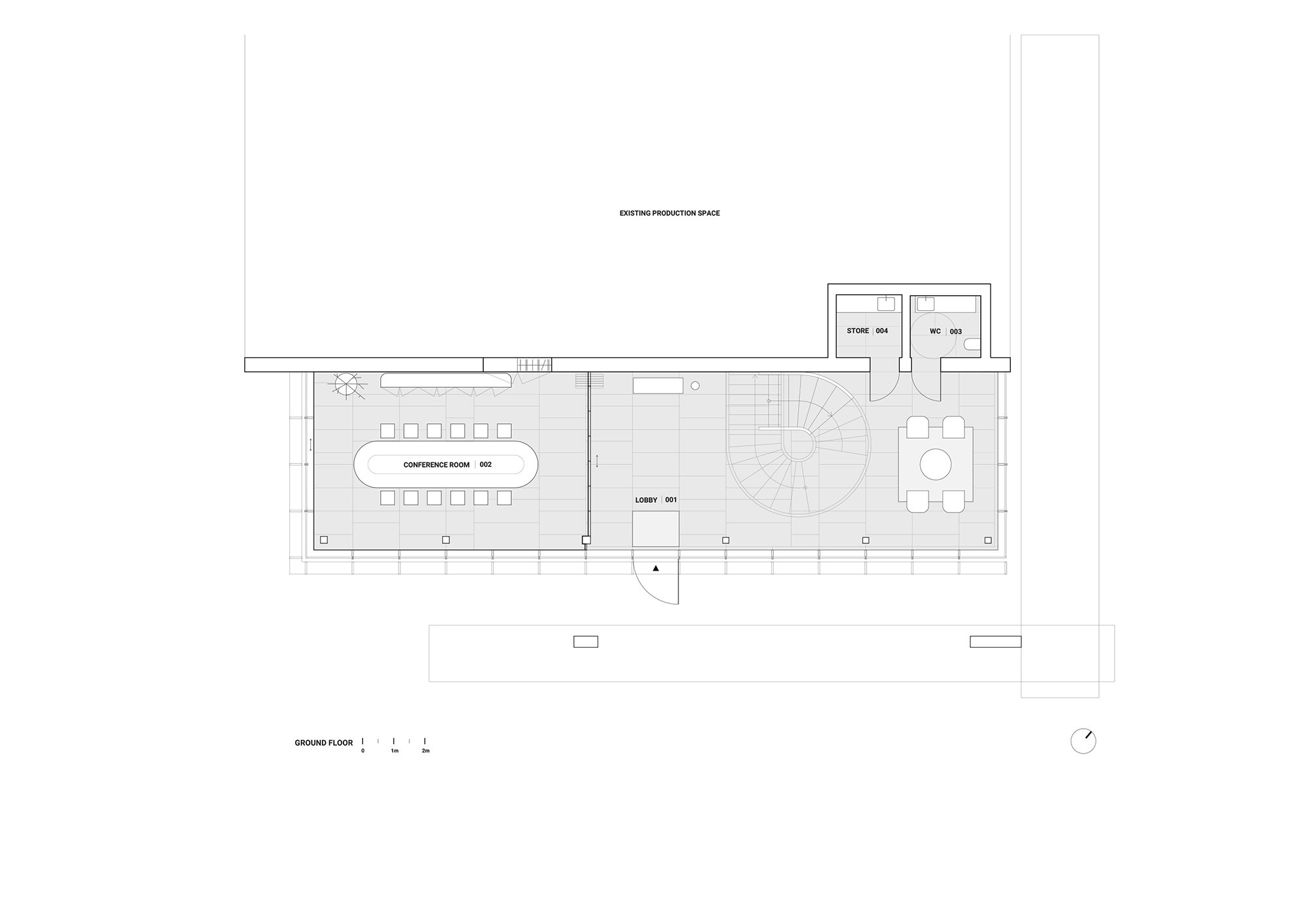 The careful arrangement of shared and individual spaces supports intuitive navigation, reinforcing the flow from the bustling production areas to the contemplative workspaces above. Public functions, including the reception and social amenities, are organized within the first floor’s existing volume, creating a clear distinction between communal and private zones. Meanwhile, the external pavilion houses the director’s office and conference room, enabling these spaces to maintain a measured detachment while still engaging with the larger context of the atelier.