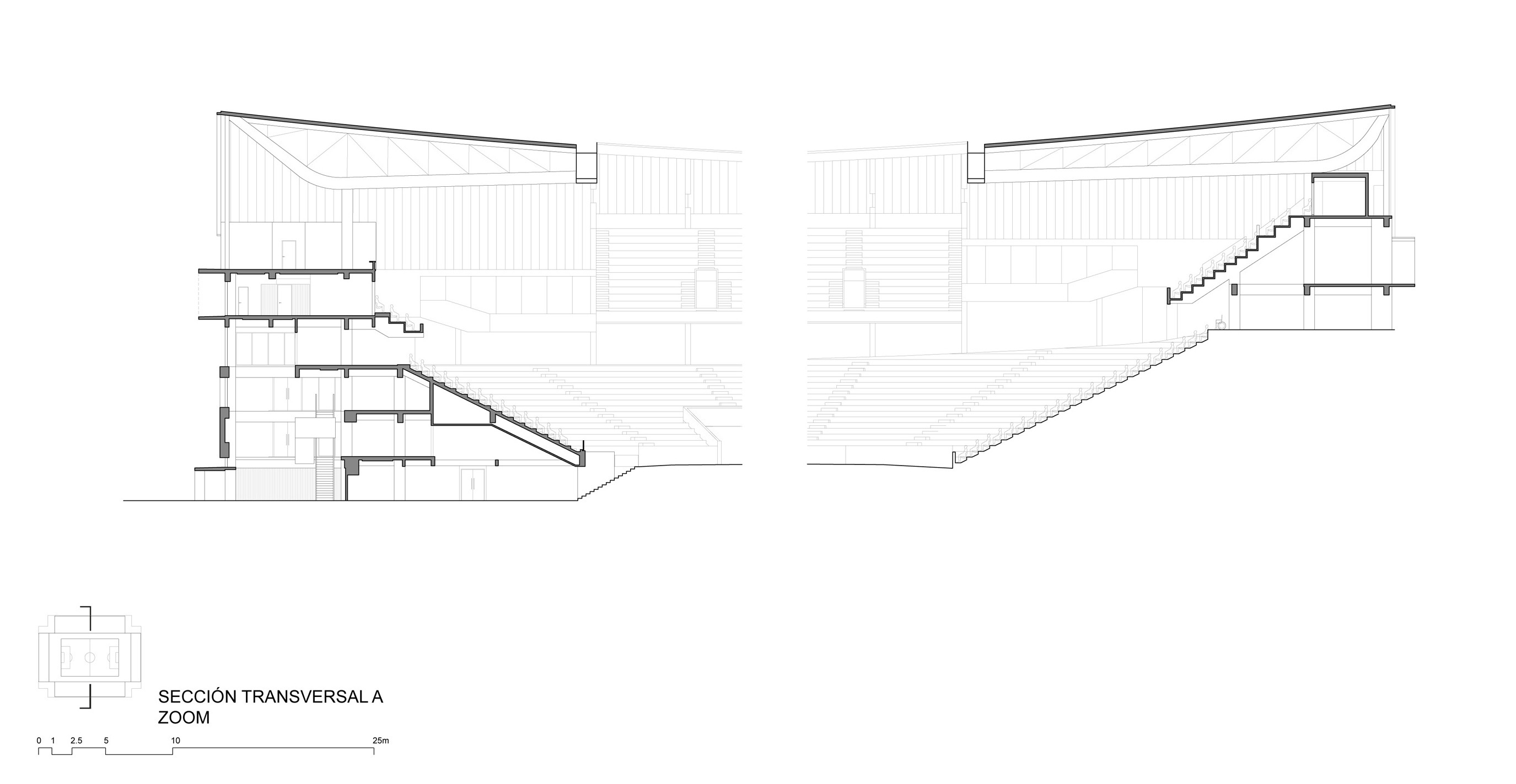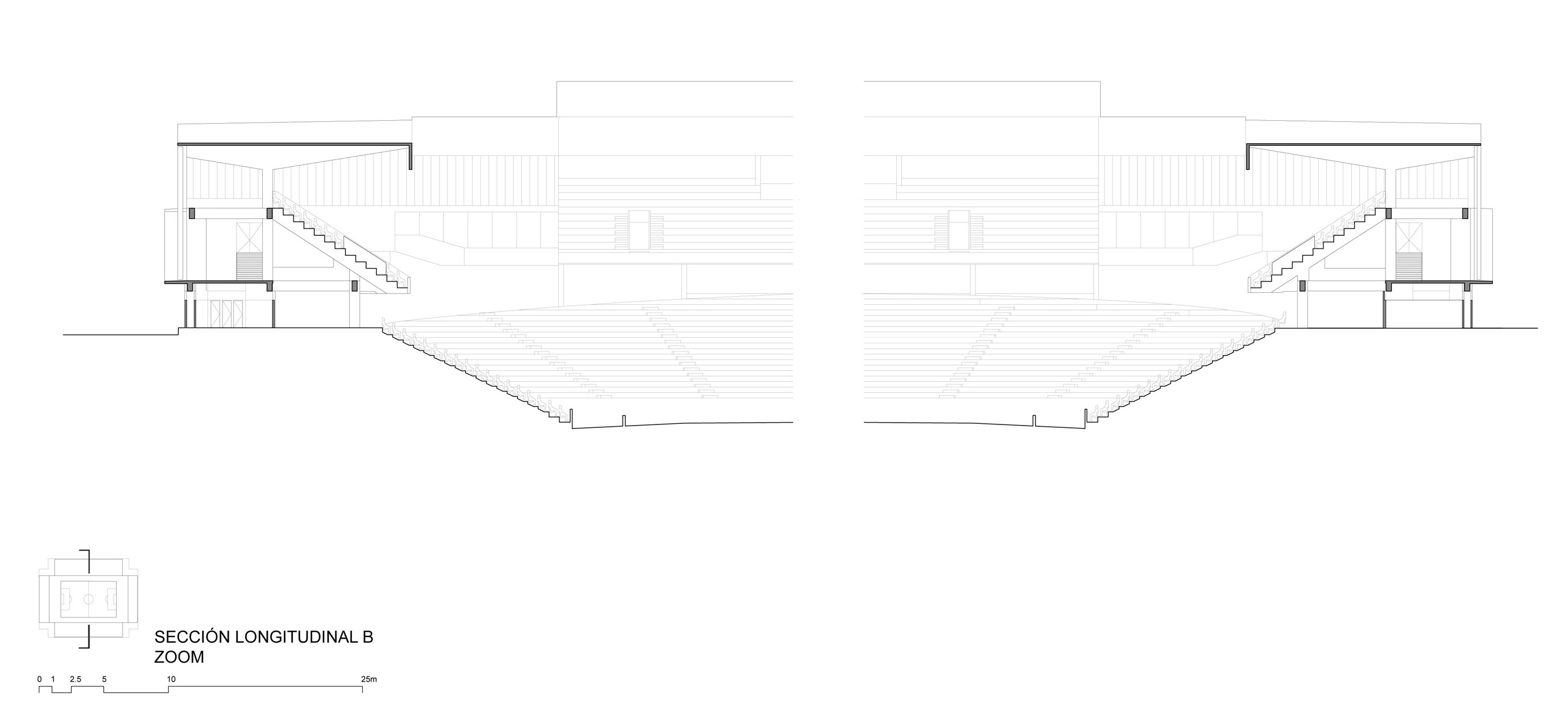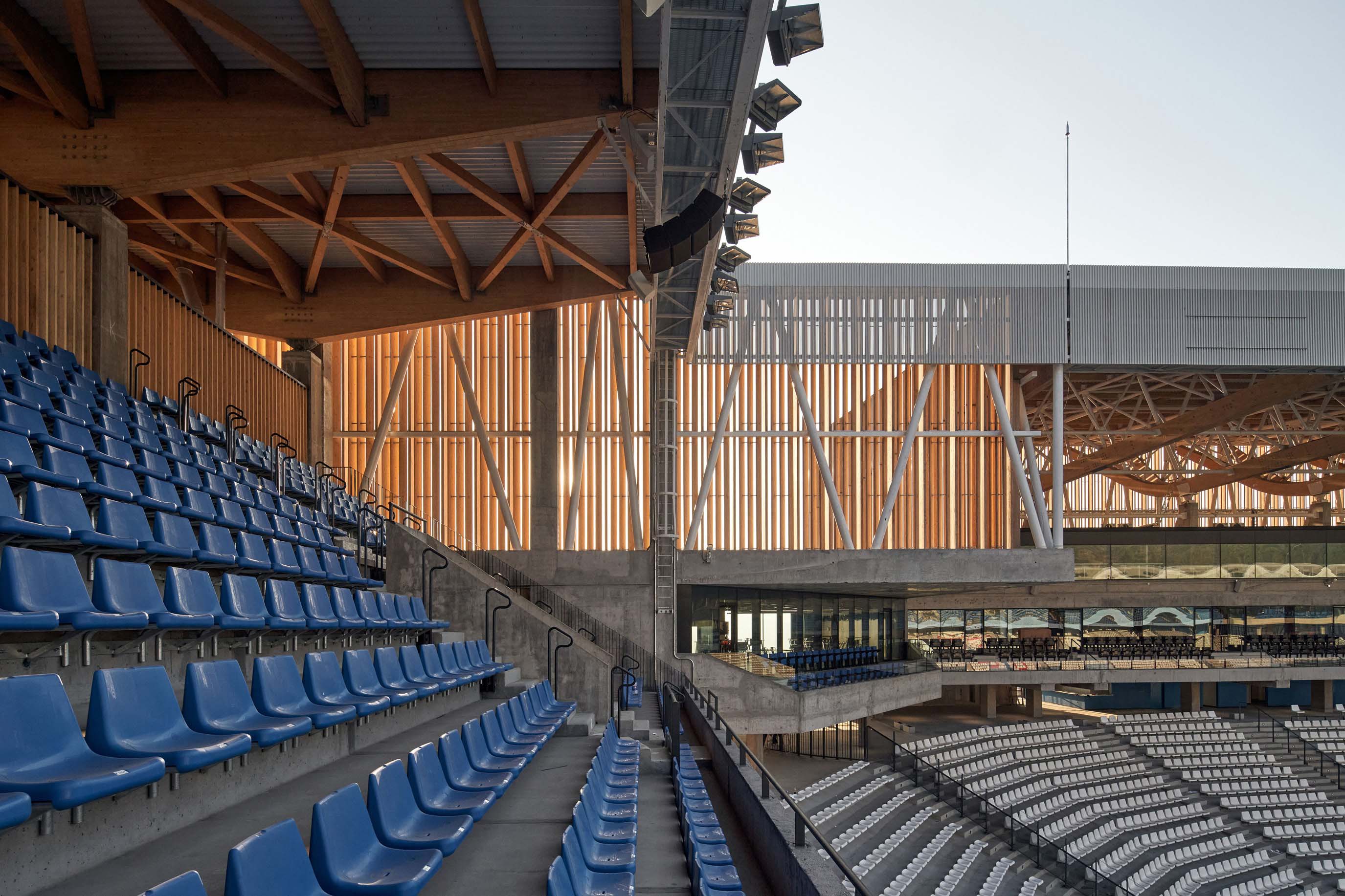 Starting from the current Stadium, anchored to the ground as if it were a Greek amphitheater, the new needs, the new uses and the increase in capacity, from 14,000 to 20,000 spectators, generates a volume that is perceived as unitary, light and elevated with respect to what exists. In this sense, the use of wood as the main element in the façade and the roof structure allows dialogue to be established between the tectonic and the light, while also being a sustainable resource, in line with the whole approach to the modernization of the Stadium.