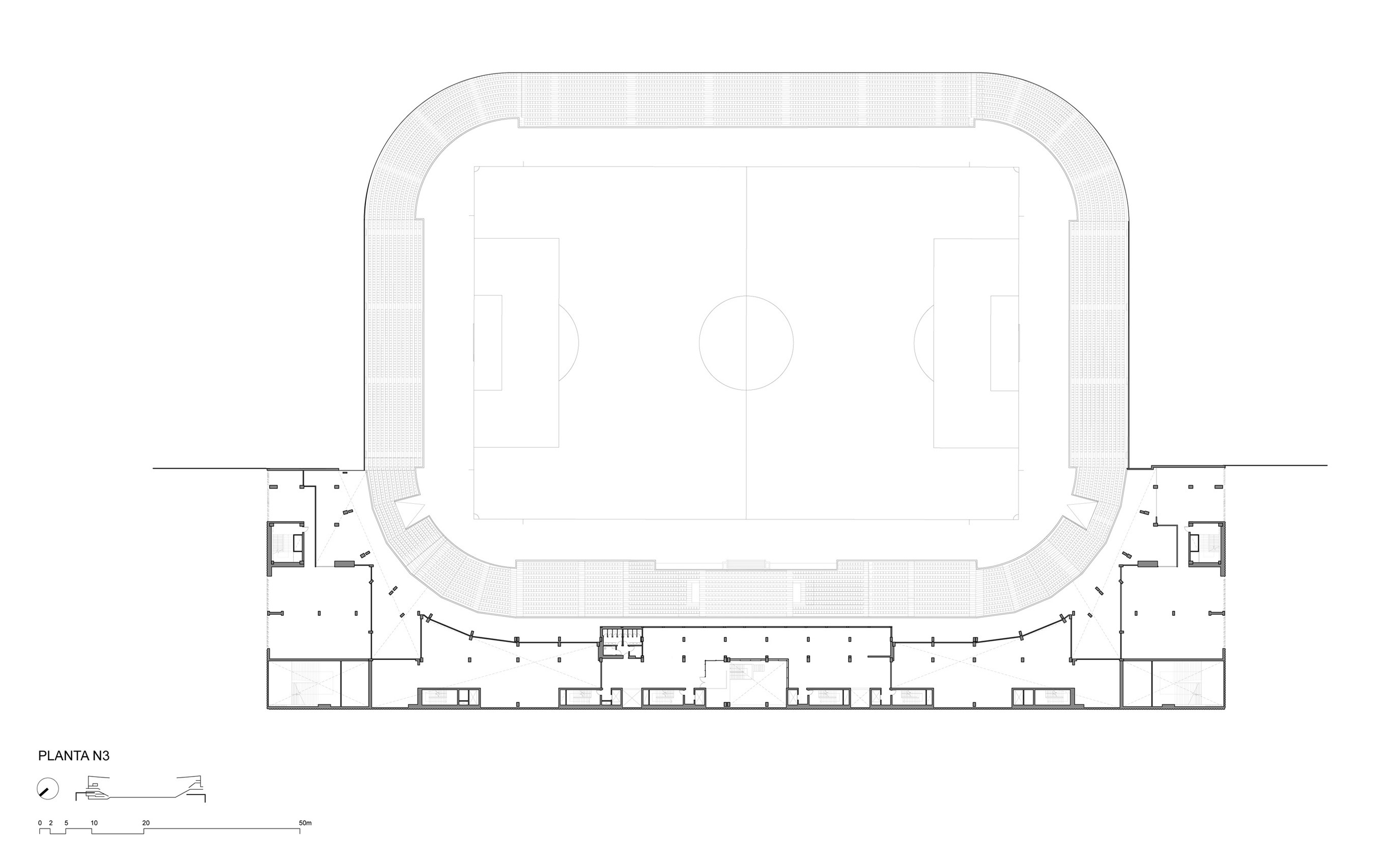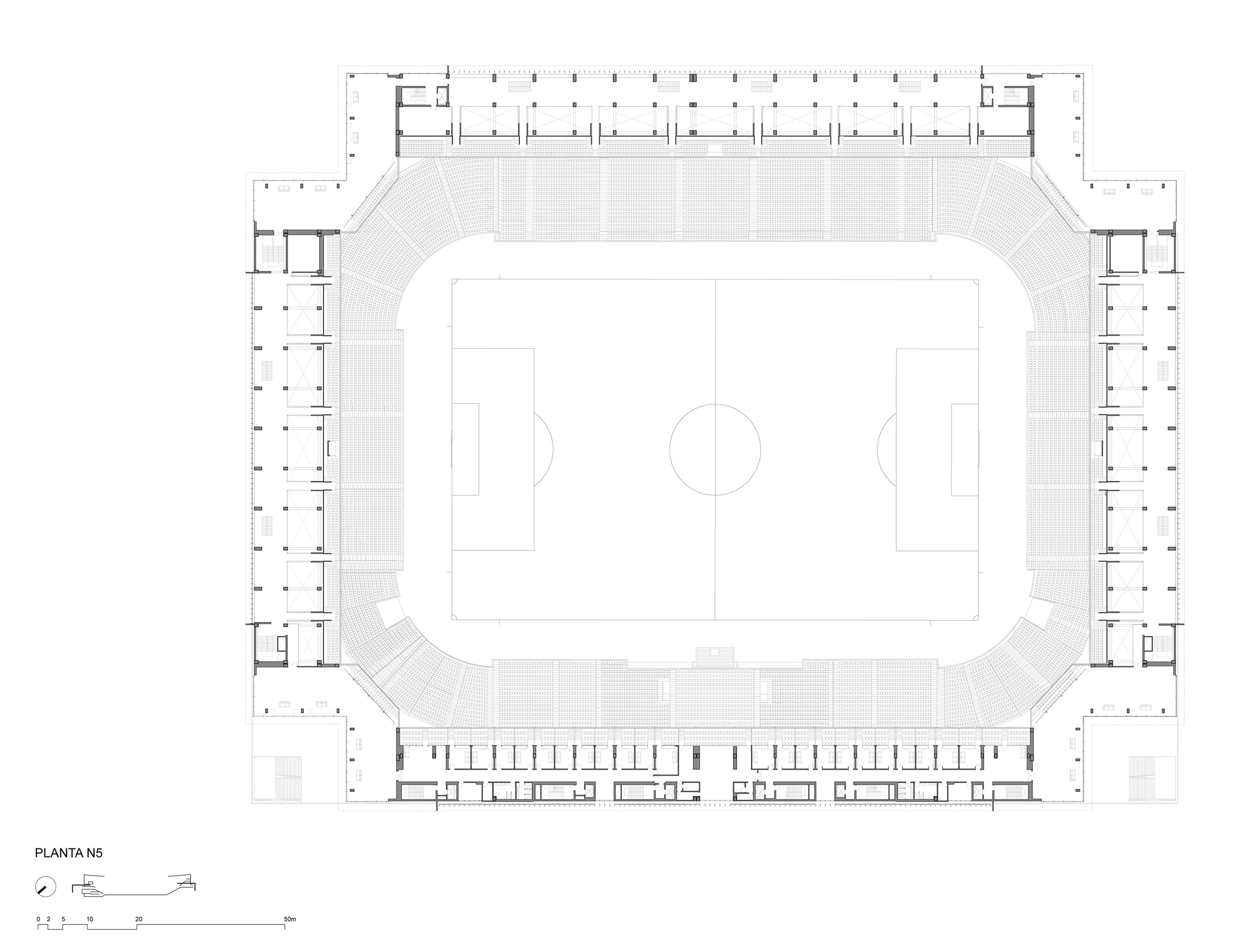 A continuous boulevard is designed that allows access to all the upper part of the lower stands and that represents the line that separates what is linked to the ground from what is elevated. The new volumetric configuration will allow the stadium to go from being open to being closed covering the stands, generating a better football atmosphere, better acoustics and greater comfort for spectators. The stadium will also be 7/365, economically sustainable and with a wide range of hospitality activities.