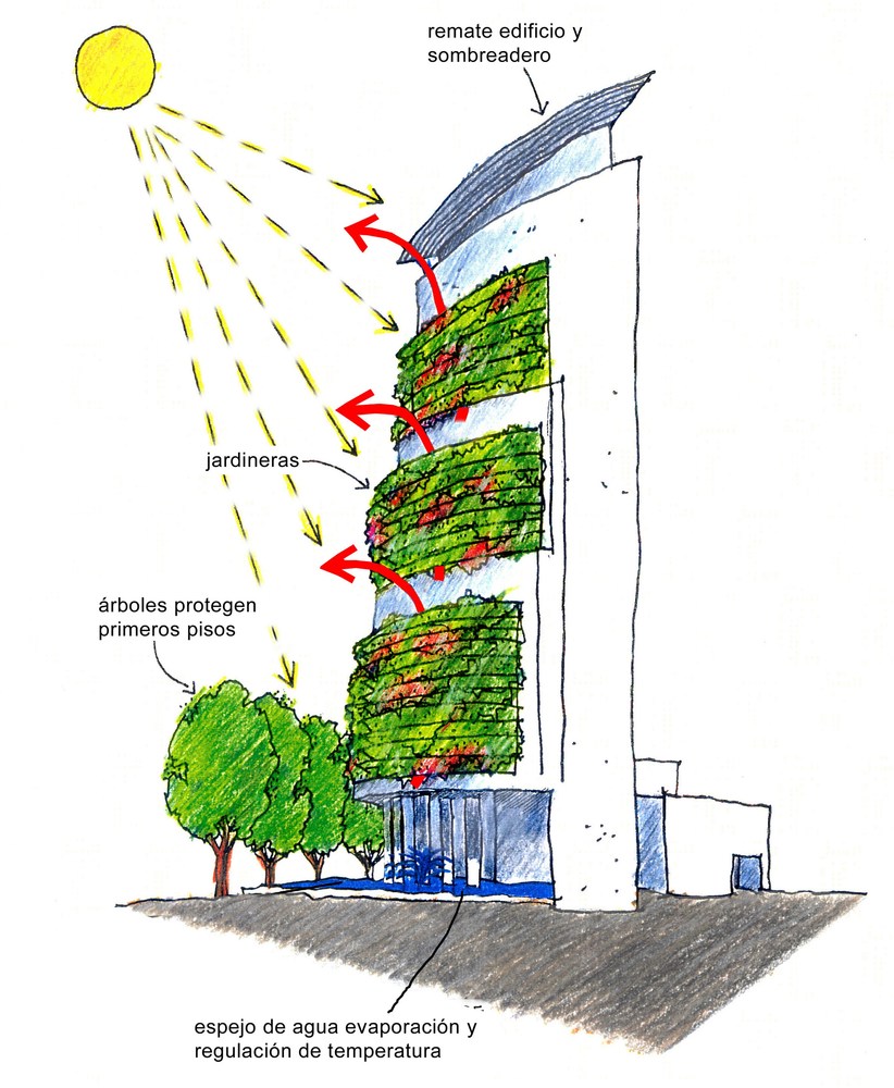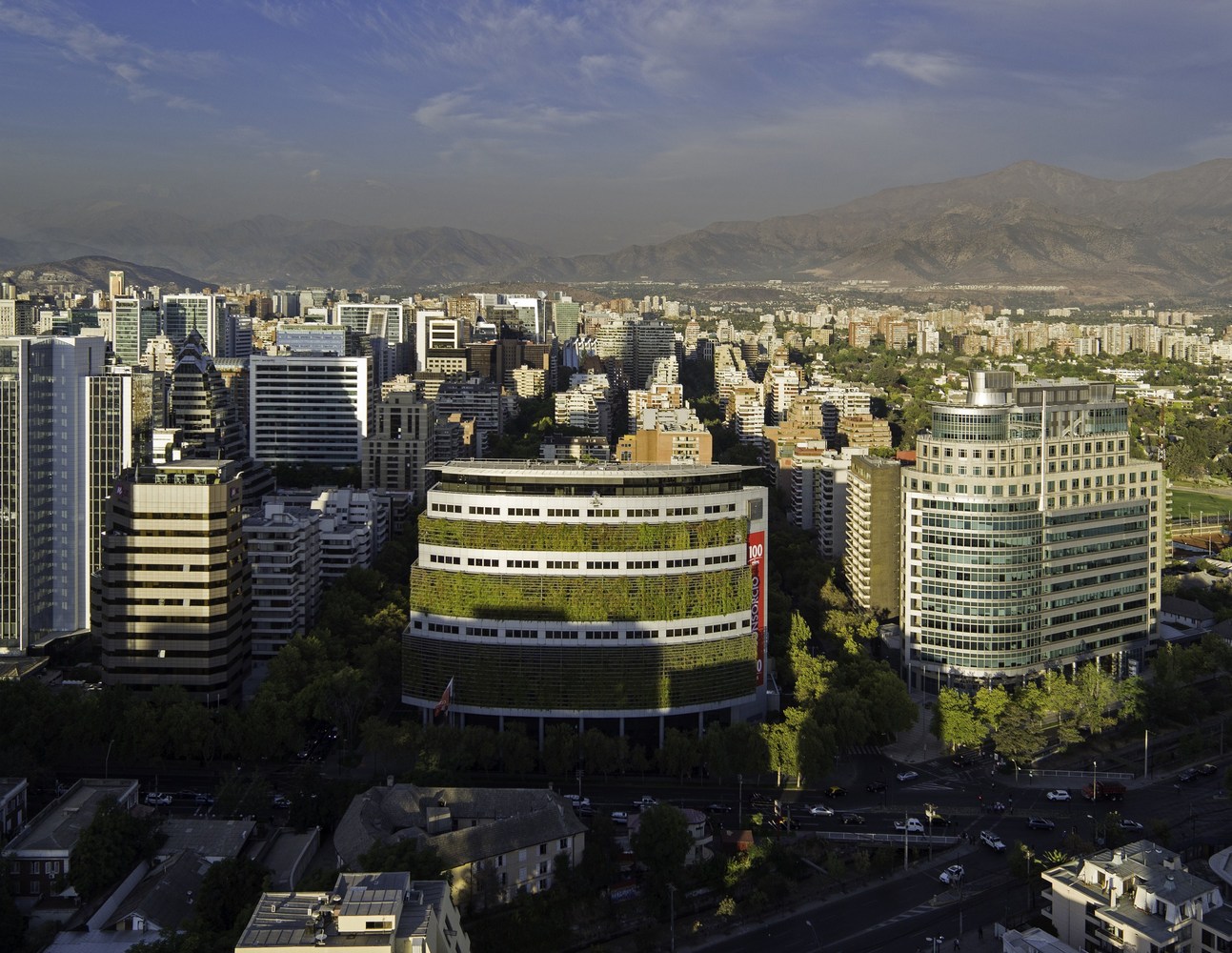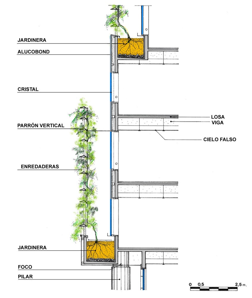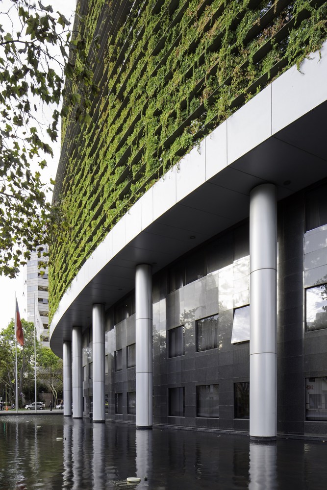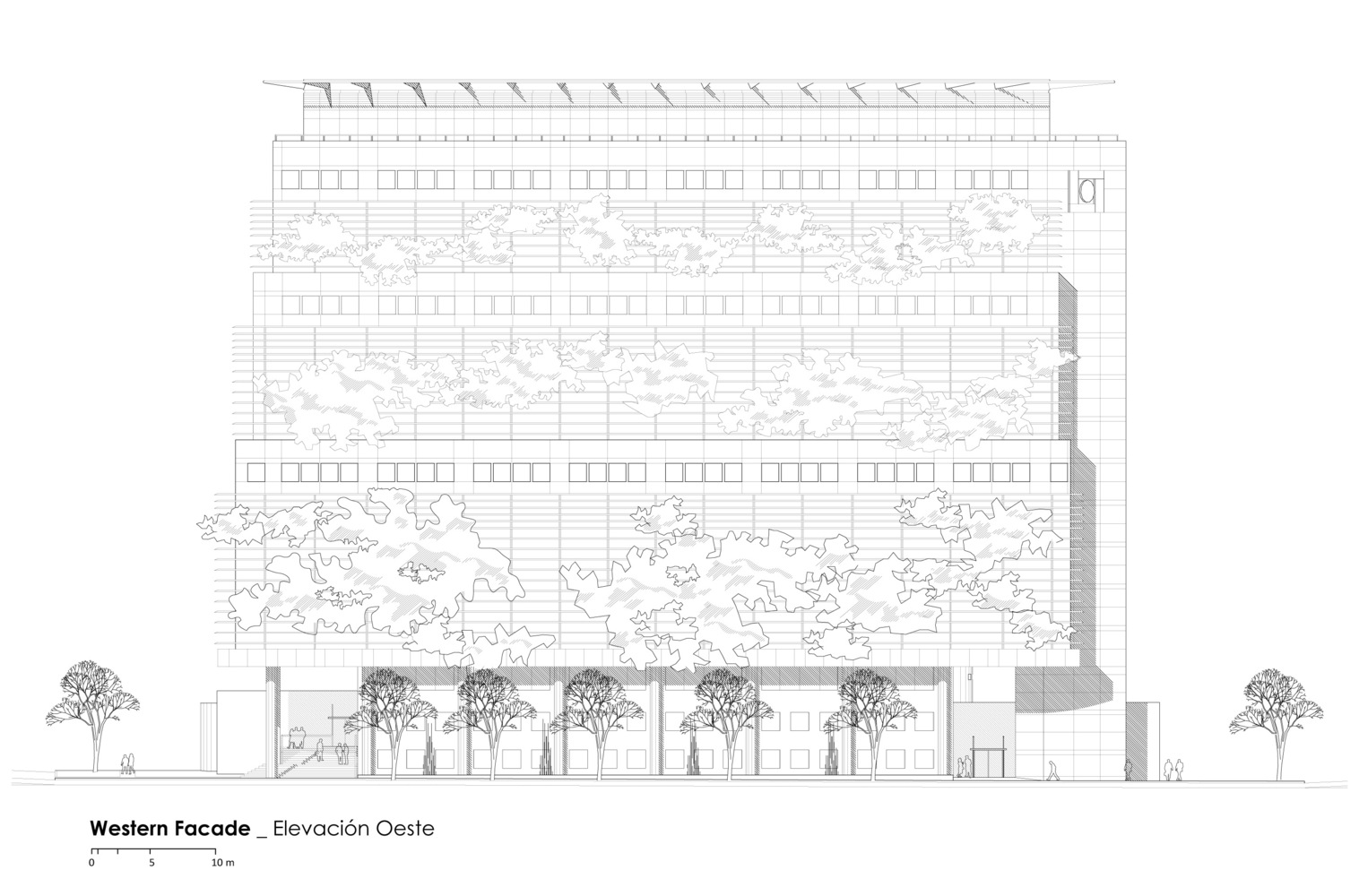 The treatment of the facades deserved special attention. Santiago's westward orientation causes serious heat problems in the summer. Therefore, the building used technical and natural means, producing a double facade: an interior one with thermopanels and an exterior one with vegetation. This "double plant skin" reduces solar absorption. It also transforms the building into a vertical garden of approximately 2,700 m2, equivalent to the gardens of the houses that stood on the site. The pre-existing greenery metaphorically rises vertically. This vegetation brightens the building and gives it a changing appearance throughout the seasons. The two upper levels of the building are protected by a large metal visor, which acts as a crown for the building and protects the upper level.
