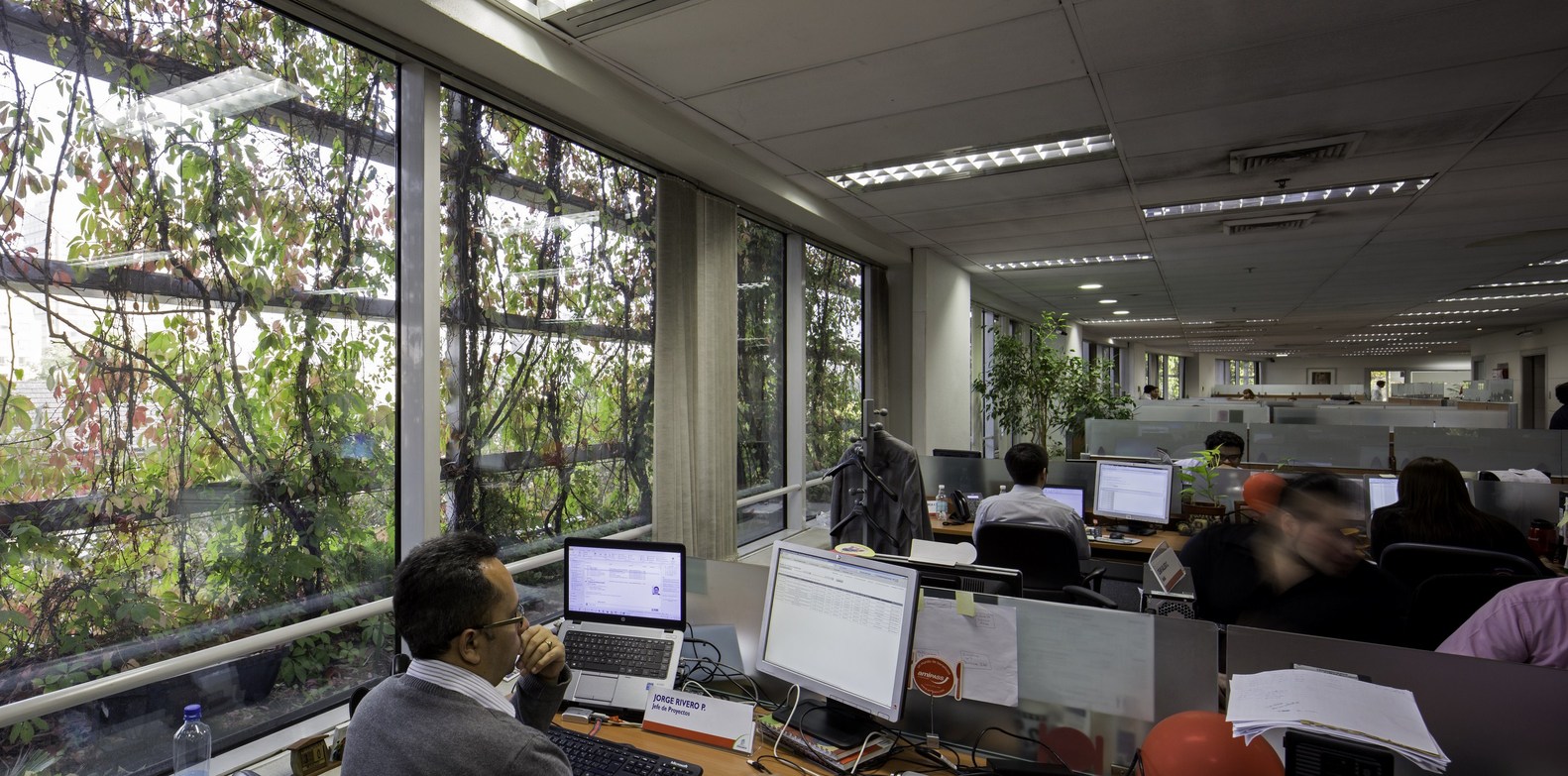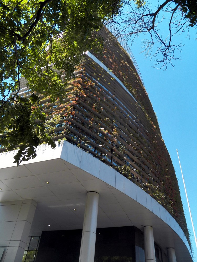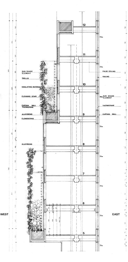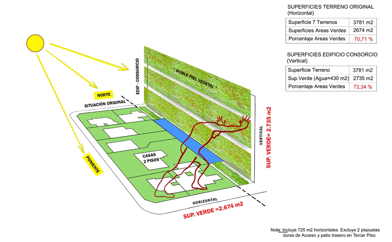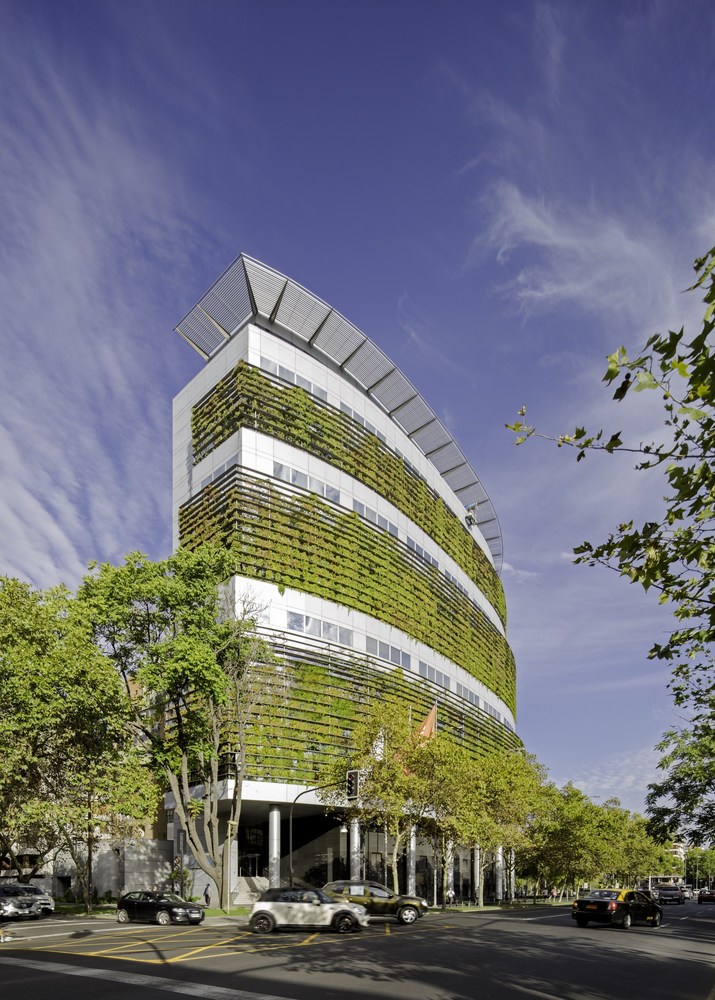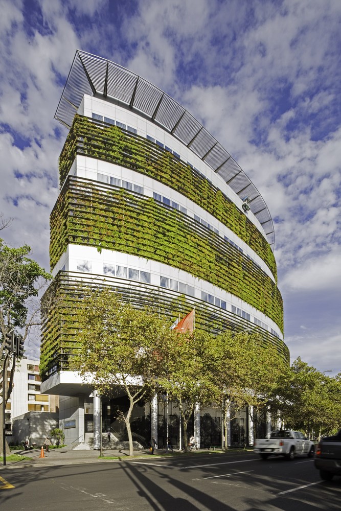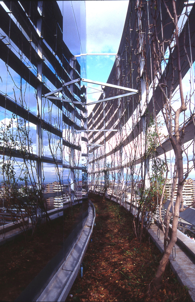The treatment of the facades deserved special attention. Santiago's westward orientation causes serious heat problems in the summer. Therefore, the building used technical and natural means, producing a double facade: an interior one with thermopanels and an exterior one with vegetation. This "double plant skin" reduces solar absorption. It also transforms the building into a vertical garden of approximately 2,700 m2, equivalent to the gardens of the houses that stood on the site. The pre-existing greenery metaphorically rises vertically. This vegetation brightens the building and gives it a changing appearance throughout the seasons. The two upper levels of the building are protected by a large metal visor, which acts as a crown for the building and protects the upper level.
