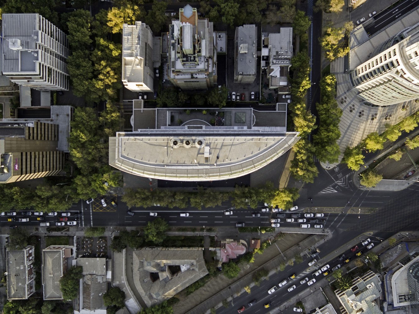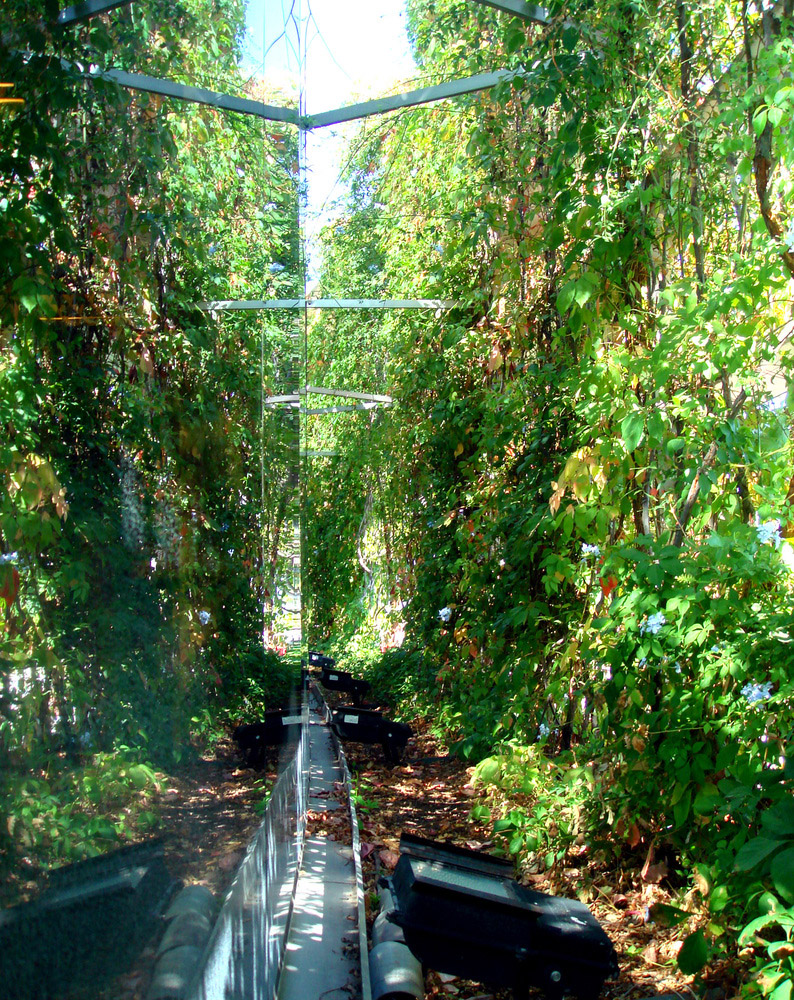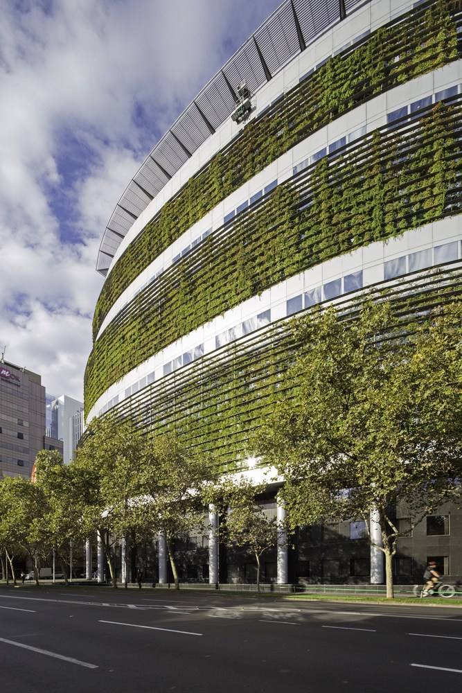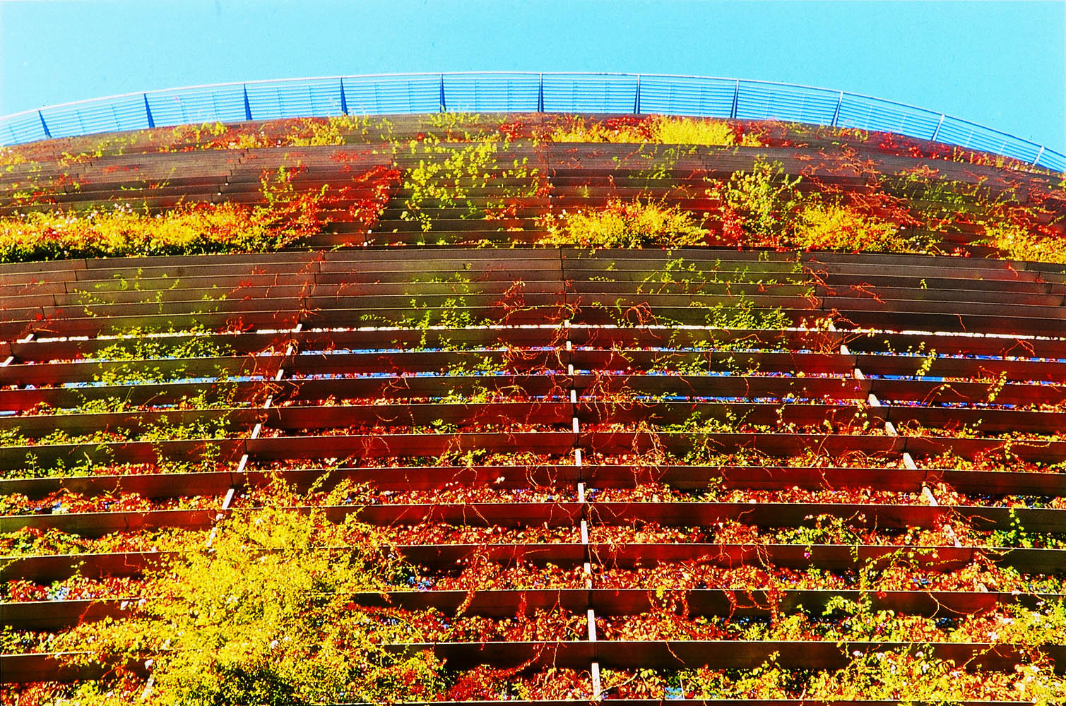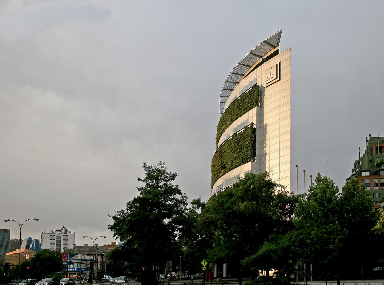 The treatment of the facades deserved special attention. Santiago's westward orientation causes serious heat problems in the summer. Therefore, the building used technical and natural means, producing a double facade: an interior one with thermopanels and an exterior one with vegetation. This "double plant skin" reduces solar absorption. It also transforms the building into a vertical garden of approximately 2,700 m2, equivalent to the gardens of the houses that stood on the site. The pre-existing greenery metaphorically rises vertically. This vegetation brightens the building and gives it a changing appearance throughout the seasons. The two upper levels of the building are protected by a large metal visor, which acts as a crown for the building and protects the upper level.