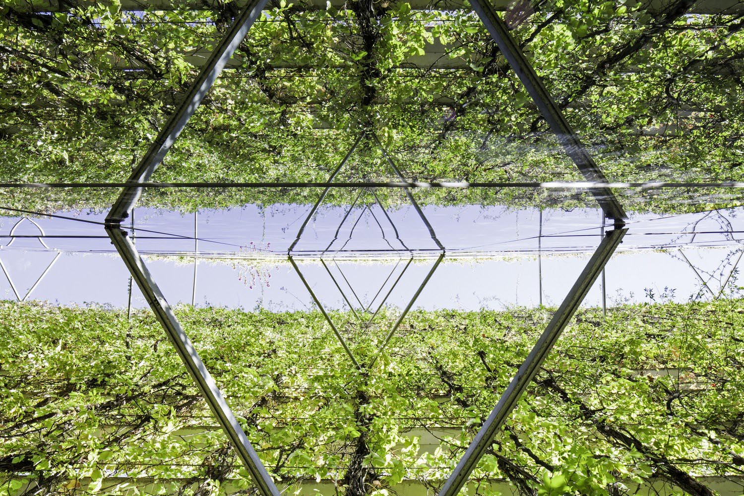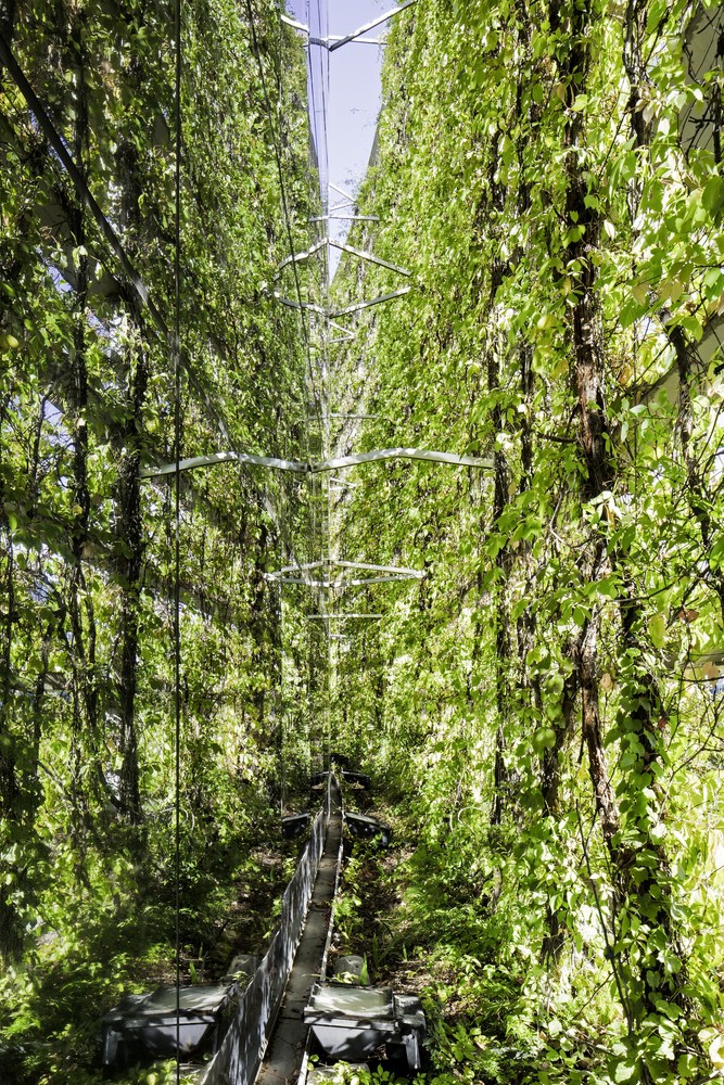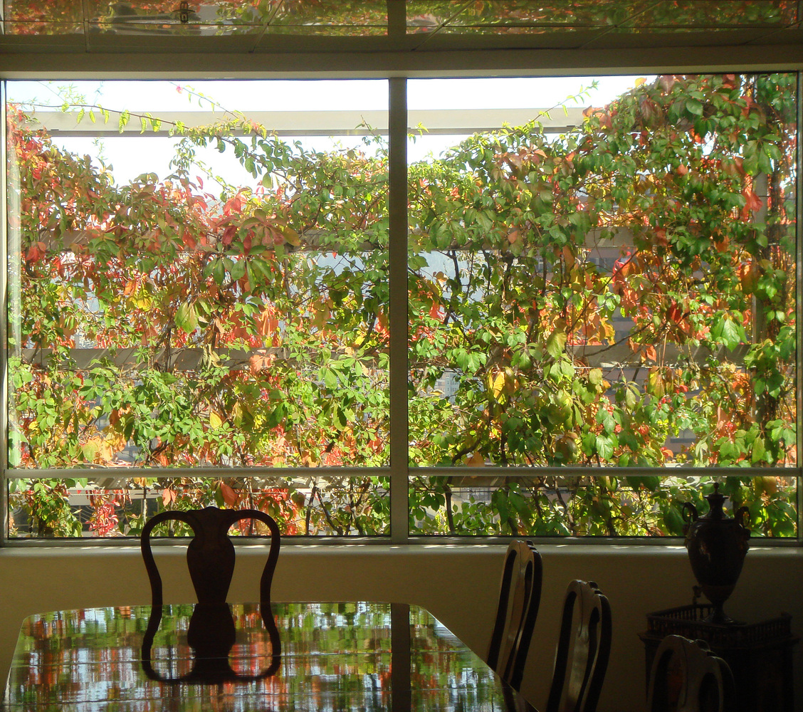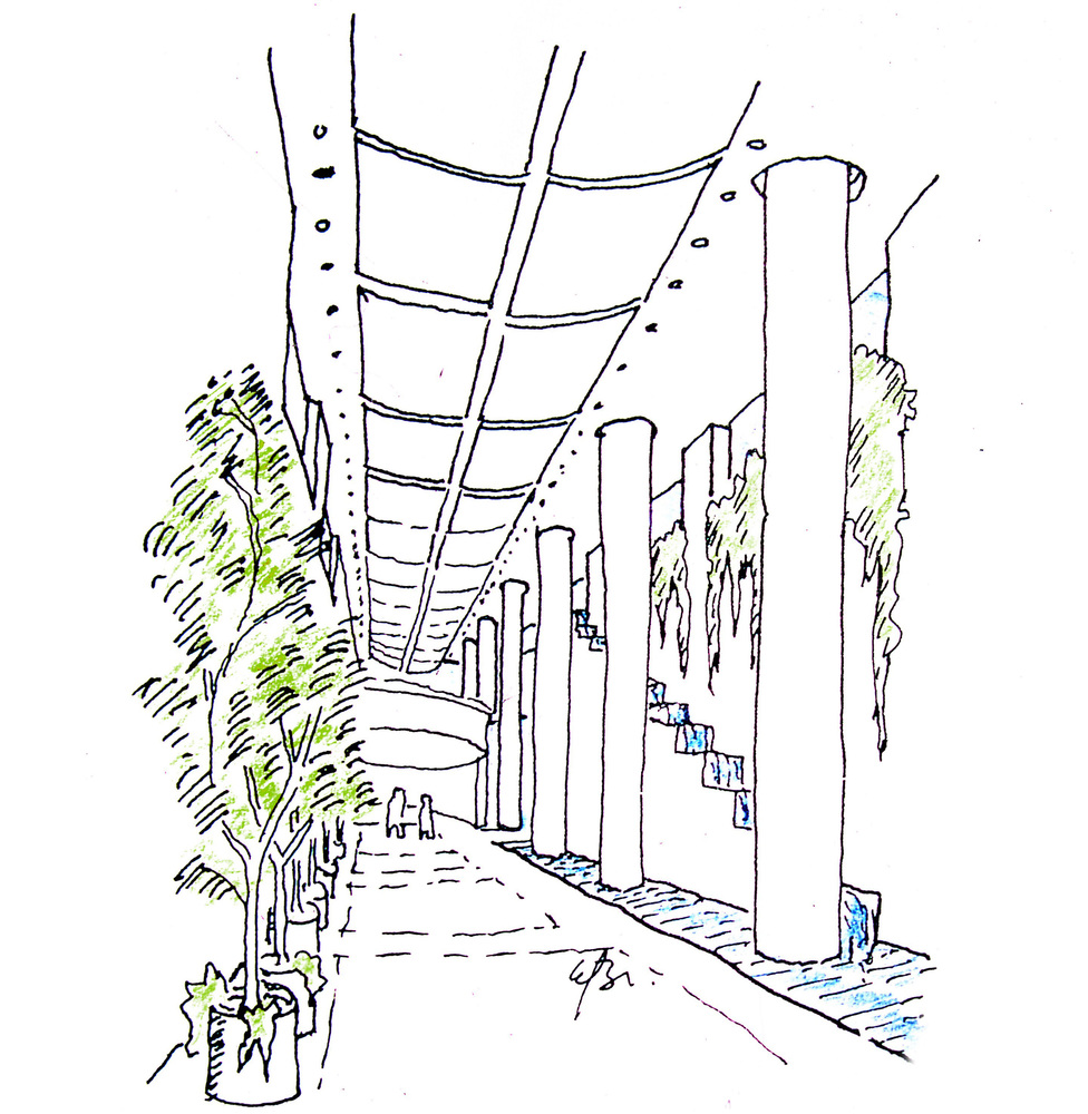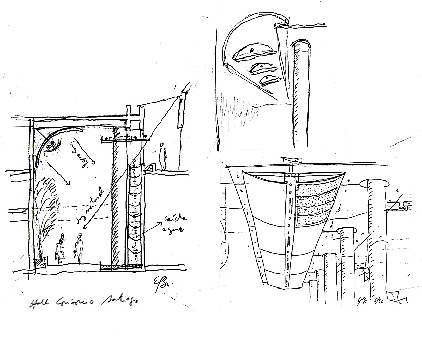 The treatment of the facades deserved special attention. Santiago's westward orientation causes serious heat problems in the summer. Therefore, the building used technical and natural means, producing a double facade: an interior one with thermopanels and an exterior one with vegetation. This "double plant skin" reduces solar absorption. It also transforms the building into a vertical garden of approximately 2,700 m2, equivalent to the gardens of the houses that stood on the site. The pre-existing greenery metaphorically rises vertically. This vegetation brightens the building and gives it a changing appearance throughout the seasons. The two upper levels of the building are protected by a large metal visor, which acts as a crown for the building and protects the upper level.