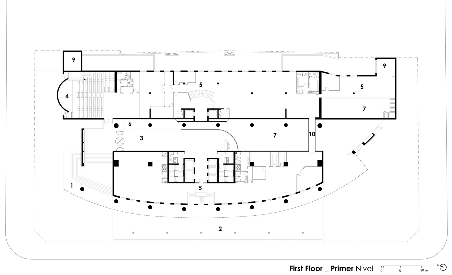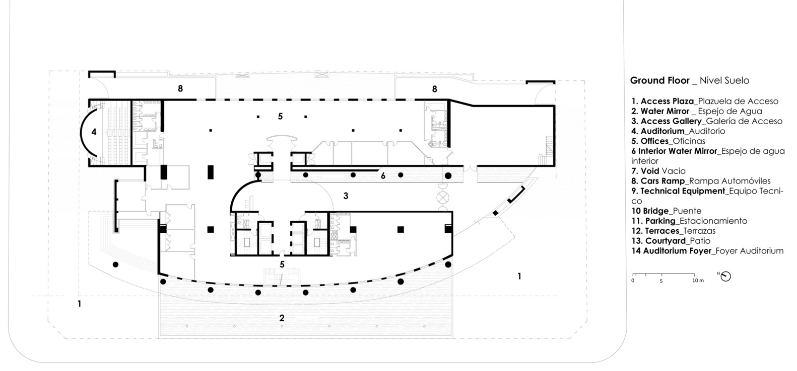 The building was divided vertically, with the lower floors for the Consortium and the upper fourteen for rentals. Both areas have independent vertical access and circulation. The entrances are at the ends of the gallery. The Consortium is entered from the south, while the rental offices are entered from the north, on the second level. This area has balconies above the first, making both entrances visually connected.