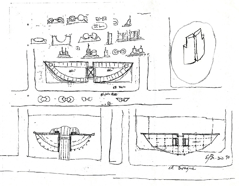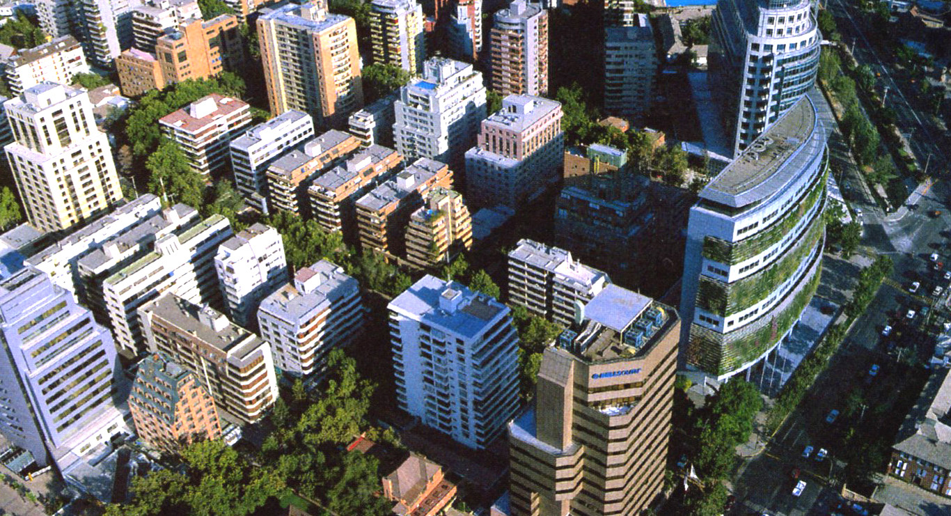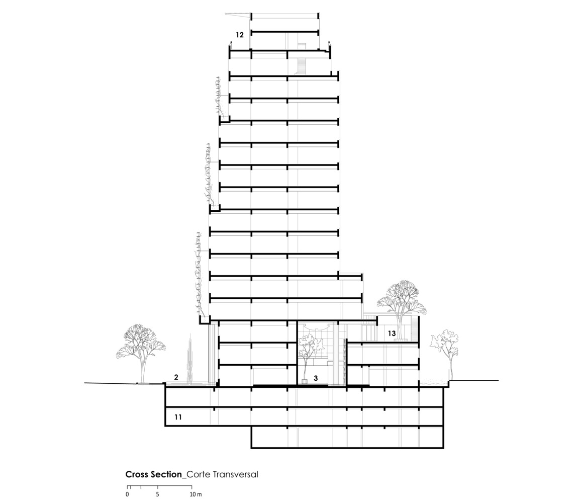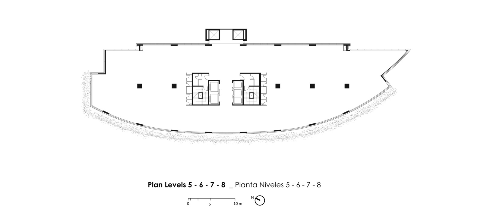 The project includes two long volumes that form a gallery containing the entrances. One volume attached to the neighboring building has three levels, while the main volume has 17 levels and is 75 meters long. This volume curves on its western facade to align with the axes of El Bosque and Tobalaba. The acute angle it creates serves as the symbolic beginning of El Bosque Avenue.